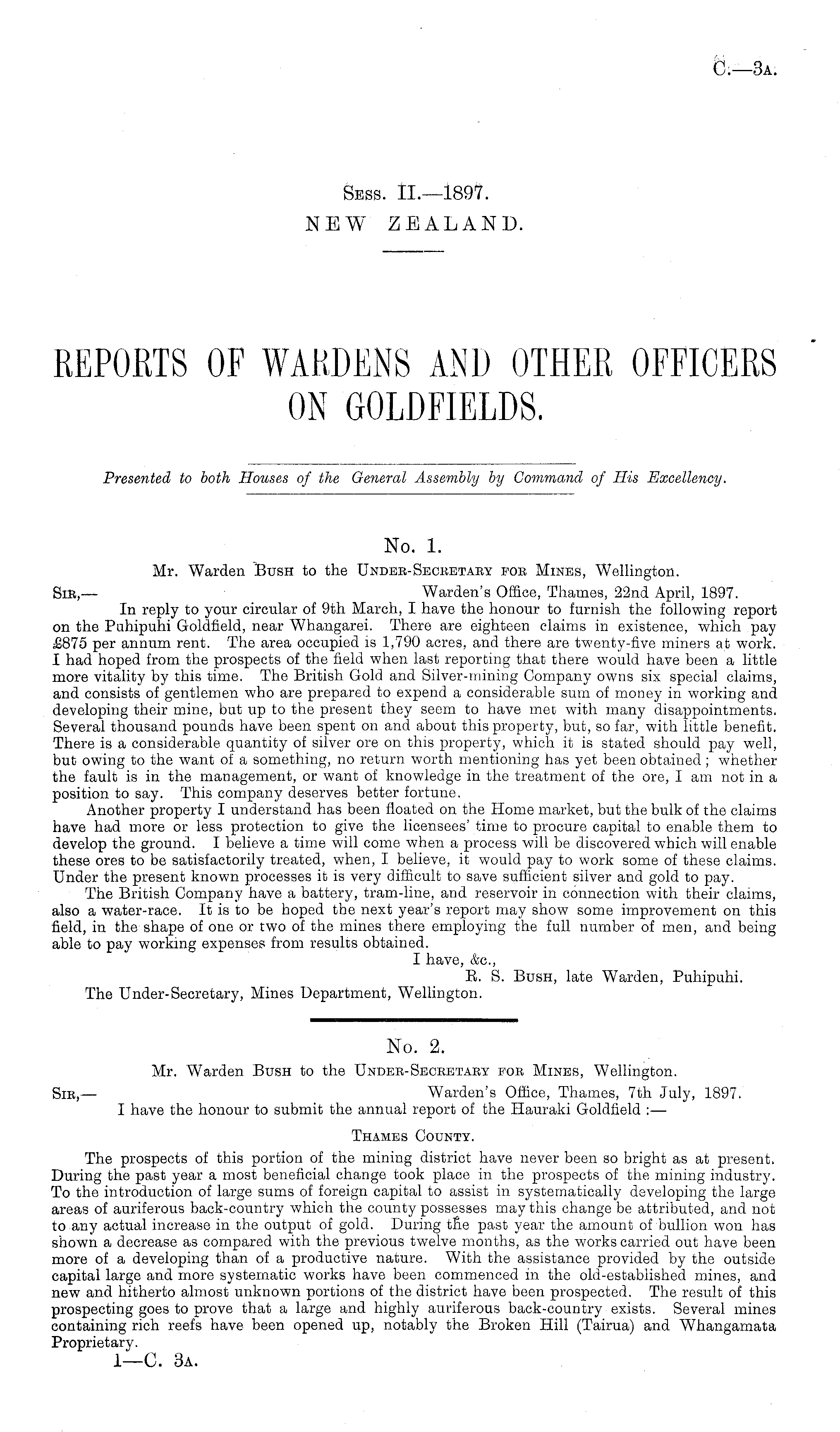 No. 2. Mr. Warden Bush to the Undeb-Secbetaey fob Mines, Wellington. Sib, — Warden's Office, Thames, 7th July, 1897. I have the honour to submit the annual report of the Hauraki Goldfleld : — Thames County. The prospects of this portion of the mining district have never been so bright as at present. During the past year a most beneficial change took place in the prospects of the mining industry. To the introduction of large sums of foreign capital to assist in systematically developing the large areas of auriferous back-country which the county possesses may this change be attributed, and not to any actual increase in the output of gold. During tfie past year the amount of bullion won has shown a decrease as compared with the previous twelve months, as the works carried out have been more of a developing than of a productive nature. With the assistance provided by the outside capital large and more systematic works have been commenced in the old-established mines, and new and hitherto almost unknown portions of the district have been prospected. The result of this prospecting goes to prove that a large and highly auriferous back-country exists. Several mines containing rich reefs have been opened up, notably the Broken Hill (Tairua) and Whangamata Proprietary.