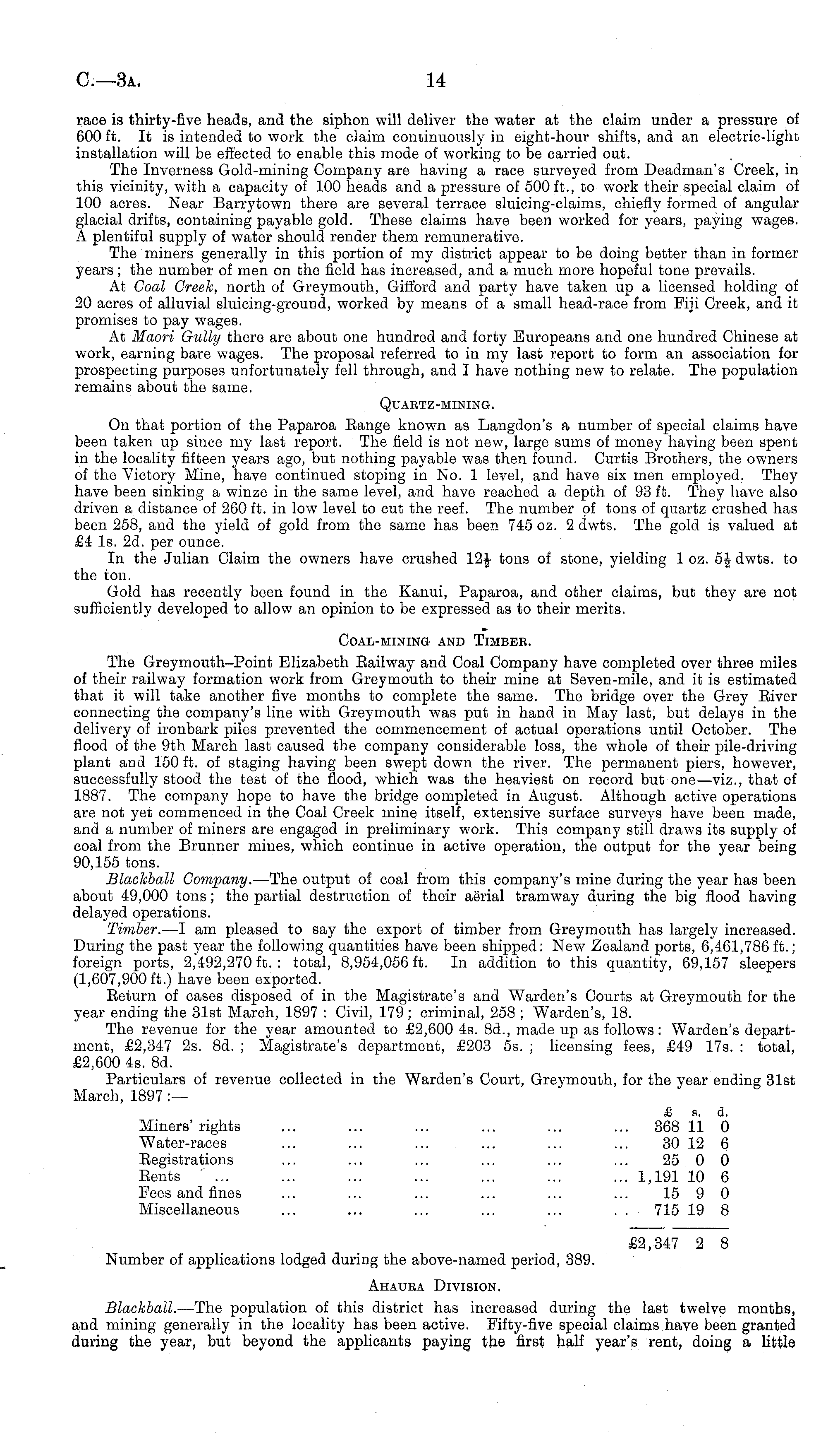 race is thirty-five heads, and the siphon will deliver the water at the claim under a pressure of 600 ft. It is intended to work the claim continuously in eight-hour shifts, and an electric-light installation will be effected to enable this mode of working to be carried out. The Inverness Gold-mining Company are having a race surveyed from Deadman's Creek, in this vicinity, with a capacity of 100 heads and a pressure of 500 ft., to work their special claim of 100 acres. Near Barrytown there are several terrace sluicing-claims, chiefly formed of angular glacial drifts, containing payable gold. These claims have been worked for years, paying wages. A plentiful supply of water should render them remunerative. The miners generally in this portion of my district appear to be doing better than in former years; the number of men on the field has increased, and a much more hopeful tone prevails. At Coal Creek, north of Greymouth, Gifford and party have taken up a licensed holding of 20 acres of alluvial sluicing-ground, worked by means of a small head-race from Fiji Creek, and it promises to pay wages. At Maori Gully there are about one hundred and forty Europeans and one hundred Chinese at work, earning bare wages. The proposal referred to in my last report to form an association for prospecting purposes unfortunately fell through, and I have nothing new to relate. The population remains about the same. QuABTZ-MINING. On that portion of the Paparoa Range known as Langdon's a number of special claims have been taken up since my last report. The field is not new, large sums of money having been spent in the locality fifteen years ago, but nothing payable was then found. Curtis Brothers, the owners of the Victory Mine, have continued stoping in No. 1 level, and have six men employed. They have been sinking a winze in the same level, and have reached a depth of 93 ft. They have also driven a distance of 260 ft. in low level to cut the reef. The number of tons of quartz crushed has been 258, and the yield of gold from the same has been 745 oz. 2 d'wts. The gold is valued at £4 Is. 2d. per ounce. In the Julian Claim the owners have crushed 12-J- tons of stone, yielding 1 oz. 5J dwts. to the ton. Gold has recently been found in the Kanui, Paparoa, and other claims, but they are not sufficiently developed to allow an opinion to be expressed as to their merits. Coal-mining and Timber. The Greymouth-Point Elizabeth Railway and Coal Company have completed over three miles of their railway formation work from Greymouth to their mine at Seven-mile, and it is estimated that it will take another five months to complete the same. The bridge over the Grey Eiver connecting the company's line with Greymouth was put in hand in May last, but delays in the delivery of ironbark piles prevented the commencement of actual operations until October. The flood of the 9th March last caused the company considerable loss, the whole of their pile-driving plant and 150 ft. of staging having been swept down the river. The permanent piers, however, successfully stood the test of the flood, which was the heaviest on record but one—viz., that of 1887. The company hope to have the bridge completed in August. Although active operations are not yet commenced in the Coal Creek mine itself, extensive surface surveys have been made, and a number of miners are engaged in preliminary work. This company still draws its supply of coal from the Brunner mines, which continue in active operation, the output for the year being 90,155 tons. Blackball Company. —The output of coal from this company's mine during the year has been about 49,000 tons; the partial destruction of their aerial tramway during the big flood having delayed operations. Timber. —l am pleased to say the export of timber from Greymouth has largely increased. During the past year the following quantities have been shipped: New Zealand ports, 6,461,786 ft.; foreign ports, 2,492,270 ft.: total, 8,954,056 ft. In addition to this quantity, 69,157 sleepers (1,607,900 ft.) have been exported. Eeturn of cases disposed of in the Magistrate's and Warden's Courts at Greymouth for the year ending the 31st March, 1897 : Civil, 179; criminal, 258 ; Warden's, 18. The revenue for the year amounted to £2,600 4s. Bd., made up as follows: Warden's department, £2,347 2s. Bd. ; Magistrate's department, £203 ss. ; licensing fees, £49 17s. : total, £2,600 4s. Bd. Particulars of revenue collected in the Warden's Court, Grevmouth, for the year ending 31st March, 1897 :— £ s. d. Miners' rights ... ... ... ... ... ... 368 11 0 Water-races ... ... ... ... ... ... 30 12 6 Registrations ... ... ... ... ... ... 25 0 0 Rents .... ... ... ... ... ... ... 1,191 10 6 Fees and fines ... ... ... ... ... ... 15 9 0 Miscellaneous ... ... ... ... ... . . 715 19 8 £2,347 2 8 Number of applications lodged during the above-named period, 389. Ahauea Division. Blackball. —The population of this district has increased during the last twelve months, and mining generally in the locality has been active. Fifty-five special claims have been granted during the year, but beyond the applicants paying the first half year's rent, doing a little