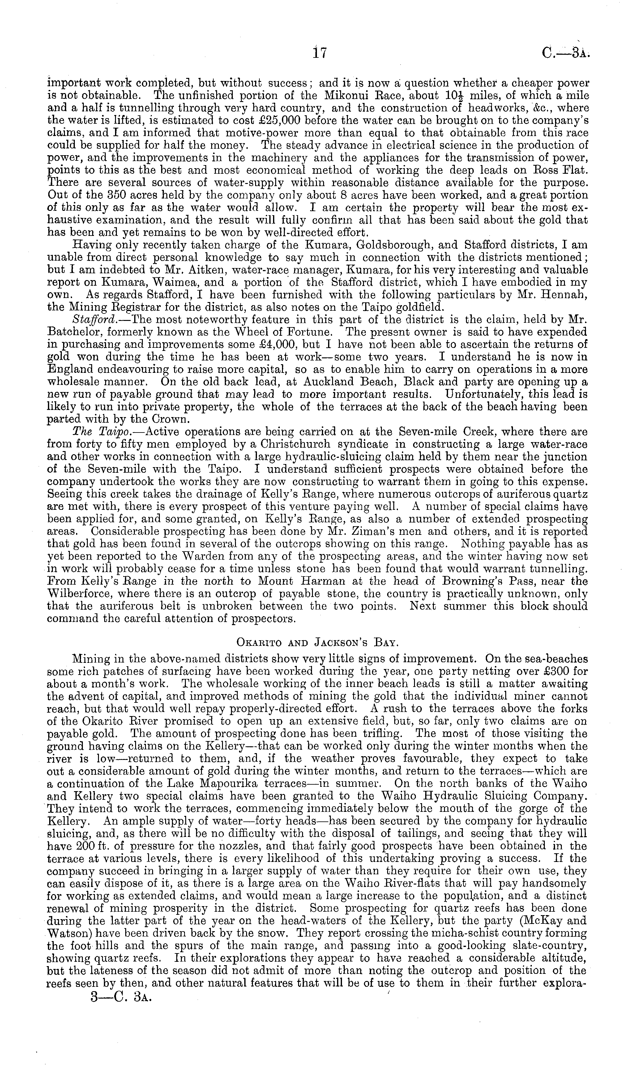 important work completed, but without success; and it is now a question whether a cheaper power is not obtainable. The unfinished portion of the Mikonui Eace, about lO| miles, of which a mile and a half is tunnelling through very hard country, and the construction of head works, &c, where the water is lifted, is estimated to cost £25,000 before the water can be brought on to the company's claims, and I am informed that motive-power more than equal to that obtainable from this race could be supplied for half the money. The steady advance in electrical science in the production of power, and the improvements in the machinery and the appliances for the transmission of power, points to this as the best and most economical method of working the deep leads on Boss Flat. There are several sources of water-supply within reasonable distance available for the purpose. Out of the 350 acres held by the company only about 8 acres have been worked, and a great portion of this only as far as the water would allow. I am certain the property will bear the most exhaustive examination, and the result will fully confirm all that has been said about the gold that has been and yet remains to be won by well-directed effort. Having only recently taken charge of the Kumara, Goldsborough, and Stafford districts, I am unable from direct personal knowledge to say much in connection with the districts mentioned; but I am indebted to Mr. Aitken, water-race manager, Kumara, for his very interesting and valuable report on Kumara, Waimea, and a portion of the Stafford district, which I have embodied in my own. As regards Stafford, I have been furnished with the following particulars by Mr. Hennah, the Mining Registrar for the district, as also notes on the Taipo goldfield. Stafford. —The most noteworthy feature in this part of the district is the claim, held by Mr. Batchelor, formerly known as the Wheel of Fortune. The present owner is said to have expended in purchasing and improvements some £4,000, but I have not been able to ascertain the returns of gold won during the time he has been at work—some two years. I understand he is now in England endeavouring to raise more capital, so as to enable him to carry on operations in a more wholesale manner. On the old back lead, at Auckland Beach, Black and party are opening up a new run of payable ground that may lead to more important results. Unfortunately, this lead is likely to run into private property, the whole of the terraces at the back of the beach having been parted with by the Crown. The Taipo. —Active operations are being carried on at the Seven-mile Creek, where there are from forty to fifty men employed by a Christchurch syndicate in constructing a large water-race and other works in connection with a large hydraulic-sluicing claim held by them near the junction of the Seven-mile with the Taipo. I understand sufficient prospects were obtained before the company undertook the works they are now constructing to warrant them in going to this expense. Seeing this creek takes the drainage of Kelly's Eange, where numerous outcrops of auriferous quartz are met with, there is every prospect of this venture paying well. A number of special claims have been applied for, and some granted, on Kelly's Eange, as also a number of extended prospecting areas. Considerable prospecting has been done by Mr. Ziman's men and others, and it is reported that gold has been found in several of the outcrops showing on this range. Nothing payable has as yet been reported to the Warden from any of the prospecting areas, and the winter having now set in work will probably cease for a time unless stone has been found that would warrant tunnelling. From Kelly's Eange in the north to Mount Harman at the head of Browning's Pass, near the Wilberforce, where there is an outcrop of payable stone, the country is practically unknown, only that the auriferous belt is unbroken between the two points. Next summer this block should command the careful attention of prospectors. Okakito and Jackson's Bay. Mining in the above-named districts show very little signs of improvement. On the sea-beaches some rich patches of surfacing have been worked during the year, one party netting over £300 for about a month's work. The wholesale working of the inner beach leads is still a matter awaiting the advent of capital, and improved methods of mining the gold that the individual miner cannot reach, but that would well repay properly-directed effort. A rush to the terraces above the forks of the Okarito Eiver promised to open up an extensive field, but, so far, only two claims are on payable gold. The amount of prospecting done has been trifling. The most of those visiting the ground having claims on the Kellery—that can be worked only during the winter months when the river is low—returned to them, and, if the weather proves favourable, they expect to take out a considerable amount of gold during the winter months, and return to the terraces—which are a continuation of the Lake Mapourika terraces —in summer. On the north banks of the Waiho and Kellery two special claims have been granted to the Waiho Hydraulic Sluicing Company. They intend to work the terraces, commencing immediately below the mouth of the gorge of the Kellery. An ample supply of water —forty heads—has been secured by the company for hydraulic sluicing, and, as there will be no difficulty with the disposal of tailings, and seeing that they will have 200 ft. of pressure for the nozzles, and that fairly good prospects have been obtained in the terrace at various levels, there is every likelihood of this undertaking proving a success. If the company succeed in bringing in a larger supply of water than they require for their own use, they can easily dispose of it, as there is a large area on the Waiho Eiver-flats that will pay handsomely for working as extended claims, and would mean a large increase to the population, and a distinc