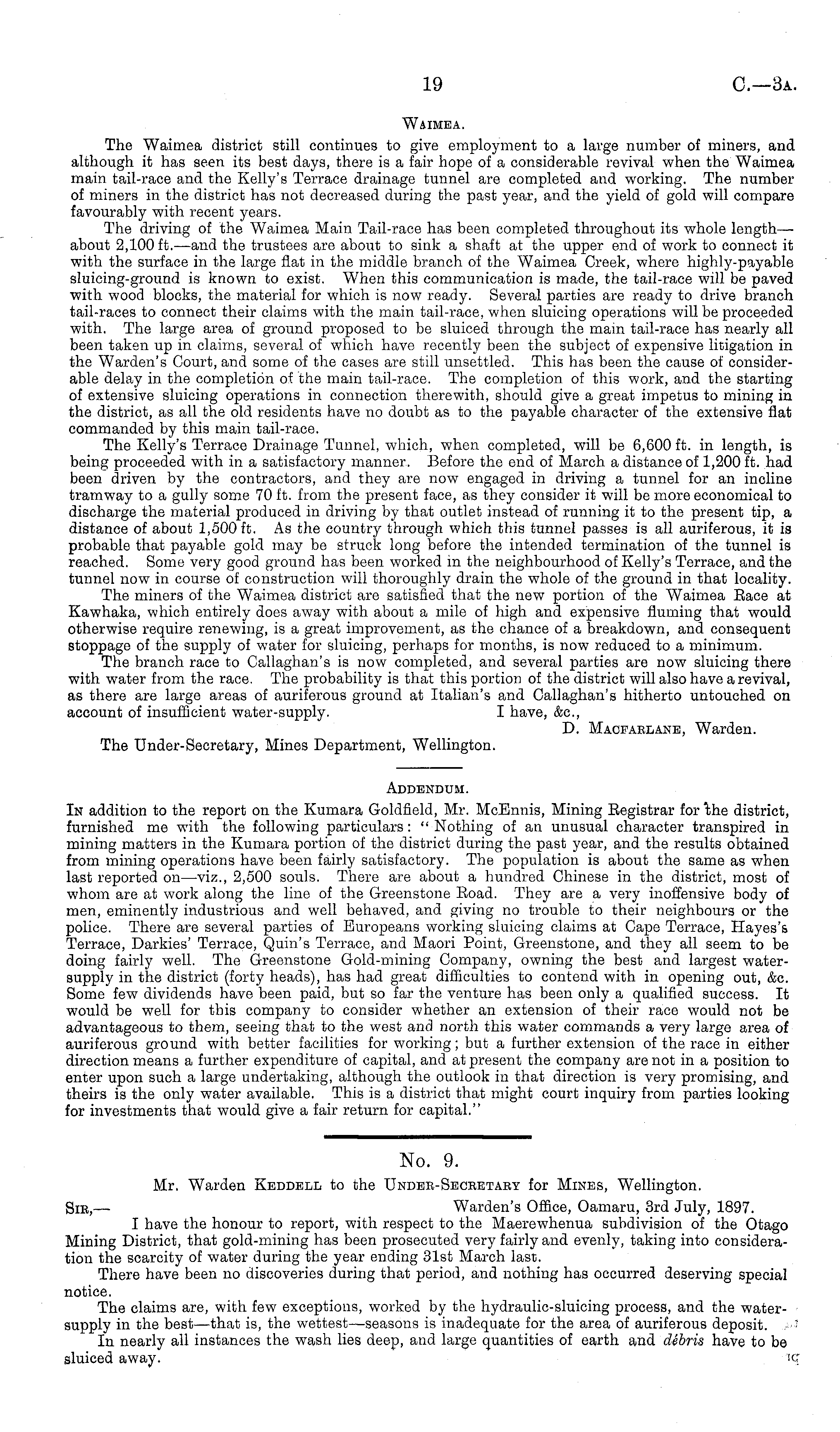 No. 9. Mr. Warden Keddell to the Under-Secrbtaey for Mines, Wellington. Sic, — Warden's Office, Oamaru, 3rd July, 1897. I have the honour to report, with respect to the Maerewhenua subdivision of the Otago Mining District, that gold-mining has been prosecuted very fairly and evenly, taking into consideration the scarcity of water during the year ending 31st March last. There have been no discoveries during that period, and nothing has occurred deserving special notice. The claims are, with few exceptions, worked by the hydraulic-sluicing process, and the watersupply in the best —that is, the wettest—seasons is inadequate for the area of auriferous deposit. In nearly all instances the wash lies deep, and large quantities of earth and debris have to be sluiced away.