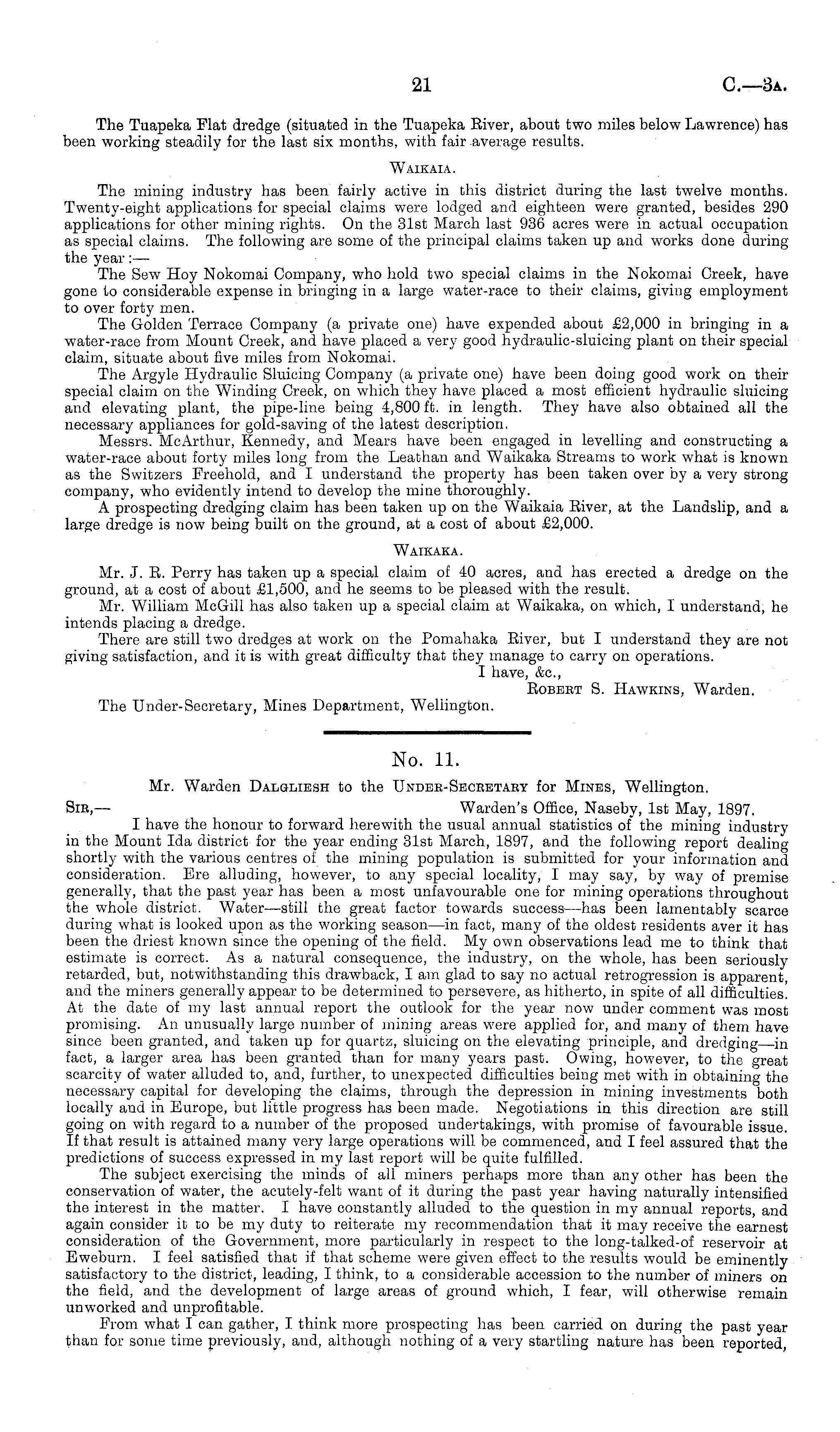 No. 11. Mr. Warden Dalgliesh to the Undee-Secebtaey for Mines, Wellington. Sib, — Warden's Office, Naseby, Ist May, 1897. I have the honour to forward herewith the usual annual statistics of the mining industry in the Mount Ida district for the year ending 31st March, 1897, and the following report dealing shortly with the various centres of the mining population is submitted for your information and consideration. Ere alluding, however, to any special locality, I may say, by way of premise generally, that the past year has been a most unfavourable one for mining operations throughout the whole district. Water—still the great factor towards success—has been lamentably scarce during what is looked upon as the working season—in fact, many of the oldest residents aver it has been the driest known since the opening of the field. My own observations lead me to think that estimate is correct. As a natural consequence, the industry, on the whole, has been seriously retarded, but, notwithstanding this drawback, I am glad to say no actual retrogression is apparent, and the miners generally appear to be determined to persevere, as hitherto, in spite of all difficulties. At the date of my last annual report the outlook for the year now under comment was most promising. An unusually large number of mining areas were applied for, and many of them have since been granted, and taken up for quartz, sluicing on the elevating principle, and dredging in fact, a larger area has been granted than for many years past. Owing, however, to the great scarcity of water alluded to, and, further, to unexpected difficulties being met with in obtaining the necessary capital for developing the claims, through the depression in mining investments both locally and in Europe, but little progress has been made. Negotiations in this direction are still going on with regard to a number of the proposed undertakings, with promise of favourable issue. If that result is attained many very large operations will be commenced, and I feel assured that the predictions of success expressed in my last report will be quite fulfilled. The subject exercising the minds of all miners perhaps more than any other has been the conservation of water, the acutely-felt want of it during the past year having naturally intensified the interest in the matter. I have constantly alluded to the question in my annual reports, and again consider it to be my duty to reiterate my recommendation that it may receive the earnest consideration of the Government, more particularly in respect to the long-talked-of reservoir at Eweburn. I feel satisfied that if that scheme were given effect to the results would be eminently satisfactory to the district, leading, I think, to a considerable accession to the number of miners on the field, and the development of large areas of ground which, I fear, will otherwise remain unworked and unprofitable. From what I can gather, I think more prospecting has been carried on during the past year than for some time previously, and, although nothing of a very startling nature has been reported,