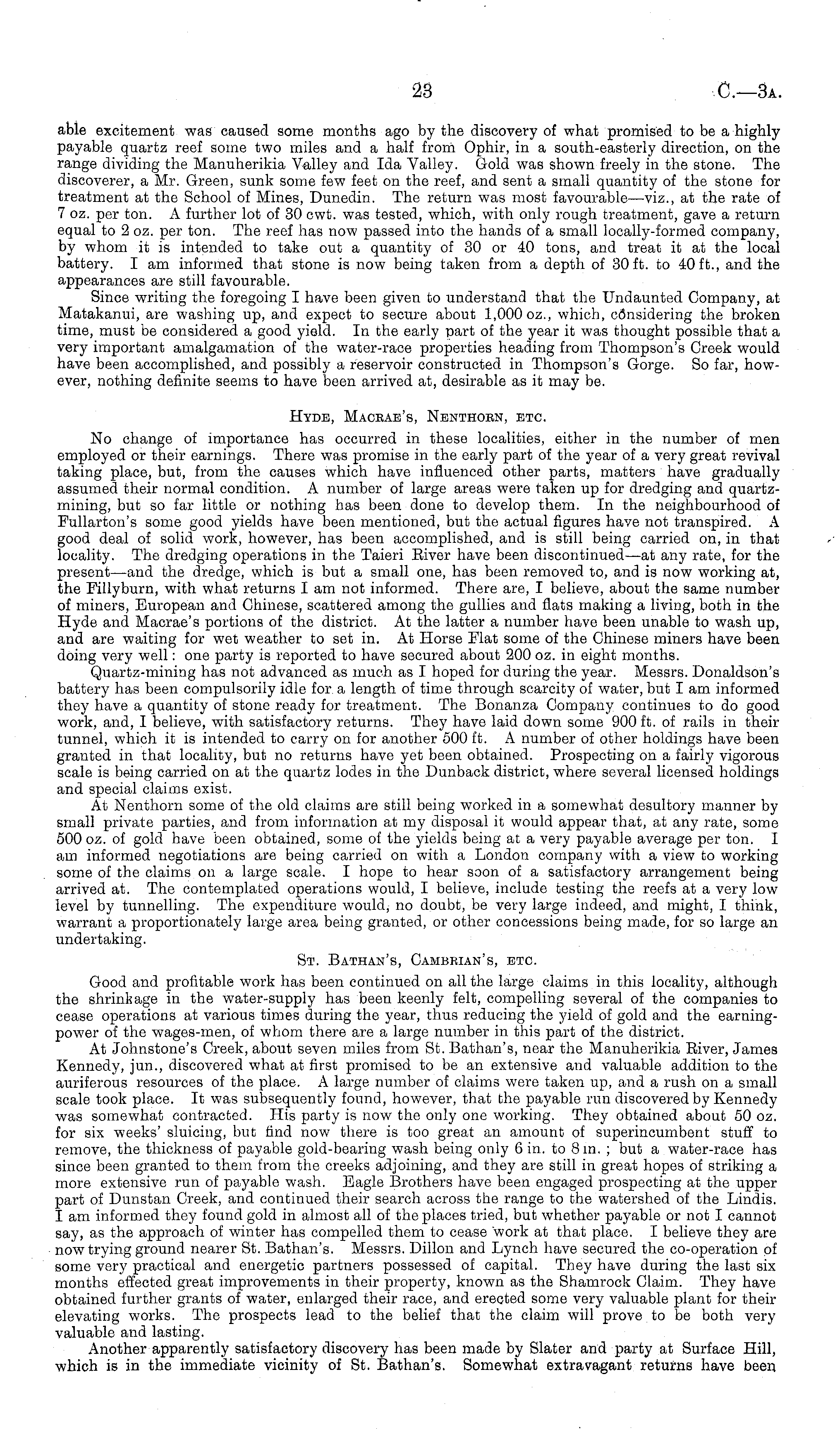 able excitement was caused some months ago by the discovery of what promised to be a highly payable quartz reef some two miles and a half from Ophir, in a south-easterly direction, on the range dividing the Manuherikia Valley and Ida Valley. Gold was shown freely in the stone. The discoverer, a Mr. Green, sunk some few feet on the reef, and sent a small quantity of the stone for treatment at the School of Mines, Dunedin. The return was most favourable—viz., at the rate of 7 oz. per ton. A further lot of 30 cwt. was tested, which, with only rough treatment, gave a return equal to 2 oz. per ton. The reef has now passed into the hands of a small locally-formed company, by whom it is intended to take out a quantity of 30 or 40 tons, and treat it at the local battery. I am informed that stone is now being taken from a depth of 30 ft. to 40 ft., and the appearances are still favourable. Since writing the foregoing I have been given to understand that the Undaunted Company, at Matakanui, are washing up, and expect to secure about 1,000 oz., which, considering the broken time, must be considered a good yield. In the early part of the year it was thought possible that a very important amalgamation of the water-race properties heading from Thompson's Creek would have been accomplished, and possibly a reservoir constructed in Thompson's Gorge. So far, however, nothing definite seems to have been arrived at, desirable as it may be. Hyde, Maceab's, Nenthorn, etc. No change of importance has occurred in these localities, either in the number of men employed or their earnings. There was promise in the early part of the year of a very great revival taking place, but, from the causes which have influenced other parts, matters have gradually assumed their normal condition. A number of large areas were taken up for dredging and quartzmining, but so far little or nothing has been done to develop them. In the neighbourhood of Pullarton's some good yields have been mentioned, but the actual figures have not transpired. A good deal of solid work, however, has been accomplished, and is still being carried on, in that locality. The dredging operations in the Taieri Eiver have been discontinued—at any rate, for the present—and the dredge, which is but a small one, has been removed to, and is now working at, the Fillyburn, with what returns lam not informed. There are, I believe, about the same number of miners, European and Chinese, scattered among the gullies and flats making a living, both in the Hyde and Macrae's portions of the district. At the latter a number have been unable to wash up, and are waiting for wet weather to set in. At Horse Flat some of the Chinese miners have been doing very well: one party is reported to have secured about 200 oz. in eight months. Quartz-mining has not advanced as much as I hoped for during the year. Messrs. Donaldson's battery has been compulsorily idle for a length of time through scarcity of water, but I am informed they have a quantity of stone ready for treatment. The Bonanza Company continues to do good work, and, I believe, with satisfactory returns. They have laid down some 900 ft. of rails in their tunnel, which it is intended to carry on for another 500 ft. A number of other holdings have been granted in that locality, but no returns have yet been obtained. Prospecting on a fairly vigorous scale is being carried on at the quartz lodes in the Dunback district, where several licensed holdings and special claims exist. At Nenthorn some of the old claims are still being worked in a somewhat desultory manner by small private parties, and from information at my disposal it would appear that, at any rate, some 500 oz. of gold have been obtained, some of the yields being at a very payable average per ton. I am informed negotiations are being carried on with a London company with a view to working some of the claims on a large scale. I hope to hear soon of a satisfactory arrangement being arrived at. The contemplated operations would, I believe, include testing the reefs at a very low level by tunnelling. The expenditure would, no doubt, be very large indeed, and might, I think, warrant a proportionately large area being granted, or other concessions being made, for so large an undertaking. St. Bathan's, Cambrian's, etc. Good and profitable work has been continued on all the large claims in this locality, although the shrinkage in the water-supply has been keenly felt, compelling several of the companies to cease operations at various times during the year, thus reducing the yield of gold and the earningpower of the wages-men, of whom there are a large number in this part of the district. At Johnstone's Creek, about seven miles from St. Bathan's, near the Manuherikia River, James Kennedy, jun., discovered what at first promised to be an extensive and valuable addition to the auriferous resources of the place. A large number of claims were taken up, and a rush on a small scale took place. It was subsequently found, however, that the payable run discovered by Kennedy was somewhat contracted. His party is now the only one working. They obtained about 50 oz. for six weeks' sluicing, but find now there is too great an amount of superincumbent stuff to remove, the thickness of payable gold-bearing wash being only 6 in. to Bm. ; but a water-race has since been granted to them from the creeks adjoining, and they are still in great hopes of striking a more extensive run of payable wash. Eagle Brothers have been engaged prospecting at the upper part of Dunstan Creek, and continued their search across the range to the watershed of the Lindis. I am informed they found gold in almost all of the places tried, but whether payable or not I cannot say, as the approach of winter has compelled them to cease work at that place. I believe they are now trying ground nearer St. Bathan's. Messrs. Dillon and Lynch have secured the co-operation of some very practical and energetic partners pos