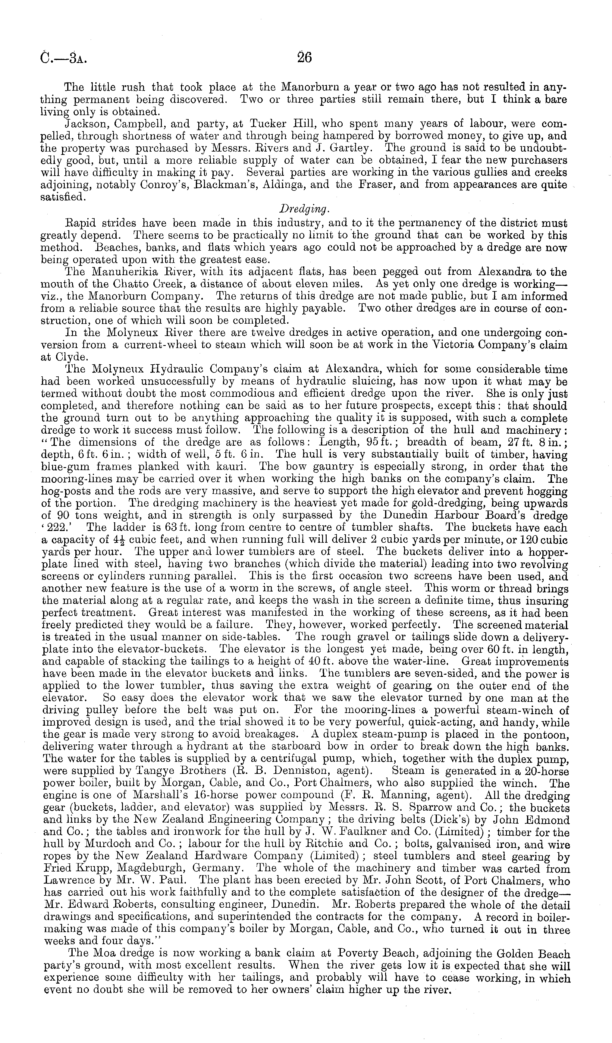 The little rush that took place at the Manorburn a year or two ago has not resulted in anything permanent being discovered. Two or three parties still remain there, but I think a bare living only is obtained. Jackson, Campbell, and party, at Tucker Hill, who spent many years of labour, were compelled, through shortness of water and through being hampered by borrowed money, to give up, and the property was purchased by Messrs. Rivers and J. Gartley. The ground is said to be undoubtedly good, but, until a more reliable supply of water can be obtained, I fear the new purchasers will have difficulty in making it pay. Several parties are working in the various gullies and creeks adjoining, notably Conroy's, Blackman's, Aldinga, and the Eraser, and from appearances are quite satisfied. Dredging. Eapid strides have been made in this industry, and to it the permanency of the district must greatly depend. There seems to be practically no limit to the ground that can be worked by this method. Beaches, banks, and flats which years ago could not be approached by a dredge are now being operated upon with the greatest ease. The Manuherikia Biver, with its adjacent flats, has been pegged out from Alexandra to the mouth of the Chatto Creek, a distance of about eleven miles. As yet only one dredge is working— viz., the Manorburn Company. The returns of this dredge are not made public, but lam informed from a reliable source that the results are highly payable. Two other dredges are in course of construction, one of which will soon be completed. In the Molyneux Biver there are twelve dredges in active operation, and one undergoing conversion from a current-wheel to steam which will soon be at work in the Victoria Company's claim at Clyde. The Molyneux Hydraulic Company's claim at Alexandra, which for some considerable time had been worked unsuccessfully by means of hydraulic sluicing, has now upon it what may be termed without doubt the most commodious and efficient dredge upon the river. She is only just completed, and therefore nothing can be said as to her future prospects, except this: that should the ground turn out to be anything approaching the quality it is supposed, with such a complete dredge to work it success must follow. The following is a description of the hull and machinery : "The dimensions of the dredge are as follows: Length, 95 ft.; breadth of beam, 27 ft. 8 in.; depth, 6 ft. 6 in. ; width of well, 5 ft. 6 in. The hull is very substantially built of timber, having blue-gum frames planked with kauri. The bow gauntry is especially strong, in order that the moormg-lines may be carried over it when working the high banks on the company's claim. The hog-posts and the rods are very massive, and serve to support the high elevator and prevent hogging of the portion. The dredging machinery is the heaviest yet made for gold-dredging, being upwards of 90 tons weight, and in strength is only surpassed by the Dunedin Harbour Board's dredge '222.' The ladder is 63 ft. long from centre to centre of tumbler shafts. The buckets have each a capacity of 4-J- cubic feet, and when running full will deliver 2 cubic yards per minute, or 120 cubic yards per hour. The upper and lower tumblers are of steel. The buckets deliver into a hopperplate lined with steel, having two branches (which divide the material) leading into two revolving screens or cylinders running parallel. This is the first occasion two screens have been used, and another new feature is the use of a worm in the screws, of angle steel. This worm or thread brings the material along at a regular rate, and keeps the wash in the screen a definite time, thus insuring perfect treatment. Great interest was manifested in the working of these screens, as it had been freely predicted they would be a failure. They, however, worked perfectly. The screened material is treated in the usual manner on side-tables. The rough gravel or tailings slide down a deliveryplate into the elevator-buckets. The elevator is the longest yet made, being over 60 ft. in length, and capable of stacking the tailings to a height of 40ft. above the water-line. Great improvements have been made in the elevator buckets and links. The tumblers are seven-sided, and the power is applied to the lower tumbler, thus saving the extra weight of gearing on the outer end of the elevator. So easy does the elevator work that we saw the elevator turned by one man at the driving pulley before the belt was put on. For the mooring-lines a powerful steam-winch of improved design is used, and the trial showed it to be very powerful, quick-acting, and handy, while the gear is made very strong to avoid breakages. A duplex steam-pump is placed in the pontoon, delivering water through a hydrant at the starboard bow in order to break down the high banks. The water for the tables is supplied by a centrifugal pump, which, together with the duplex pump, were supplied by Tangye Brothers (B. B. Denniston, agent). Steam is generated in a 20-horse power boiler, built by Morgan, Cable, and Co., Port Chalmers, who also supplied the winch. The engine is one of Marshall's 16-horse power compound (F. E. Manning, agent). All the dredging gear (buckets, ladder, and elevator) was supplied by Messrs. E. S. Sparrow and Co.; the buckets and links by the New Zealand Engineering Company ; the driving belts (Dick's) by John Edmond and Co.; the tables and ironwork for the hull by J. W. Faulkner and Co. (Limited) ; timber for the hull by Murdoch and Co. ; labour for the hull by Eitchie and Co. ; bolts, galvanised iron, and wire ropes by the New Zealand Hardware Company (Limited) ; steel tumblers and steel gearing by Fried Krupp, Magdeburgh, Germany. The whole of the machinery and timber was carted from Lawrence by Mr. W. Paul. The plant has been erected by Mr. John Scott, of Port Chalmers, who has carried out his work faithfully and to the complete satisfaction of the designer of the dredge— Mr. Edward Eoberts, consulting 