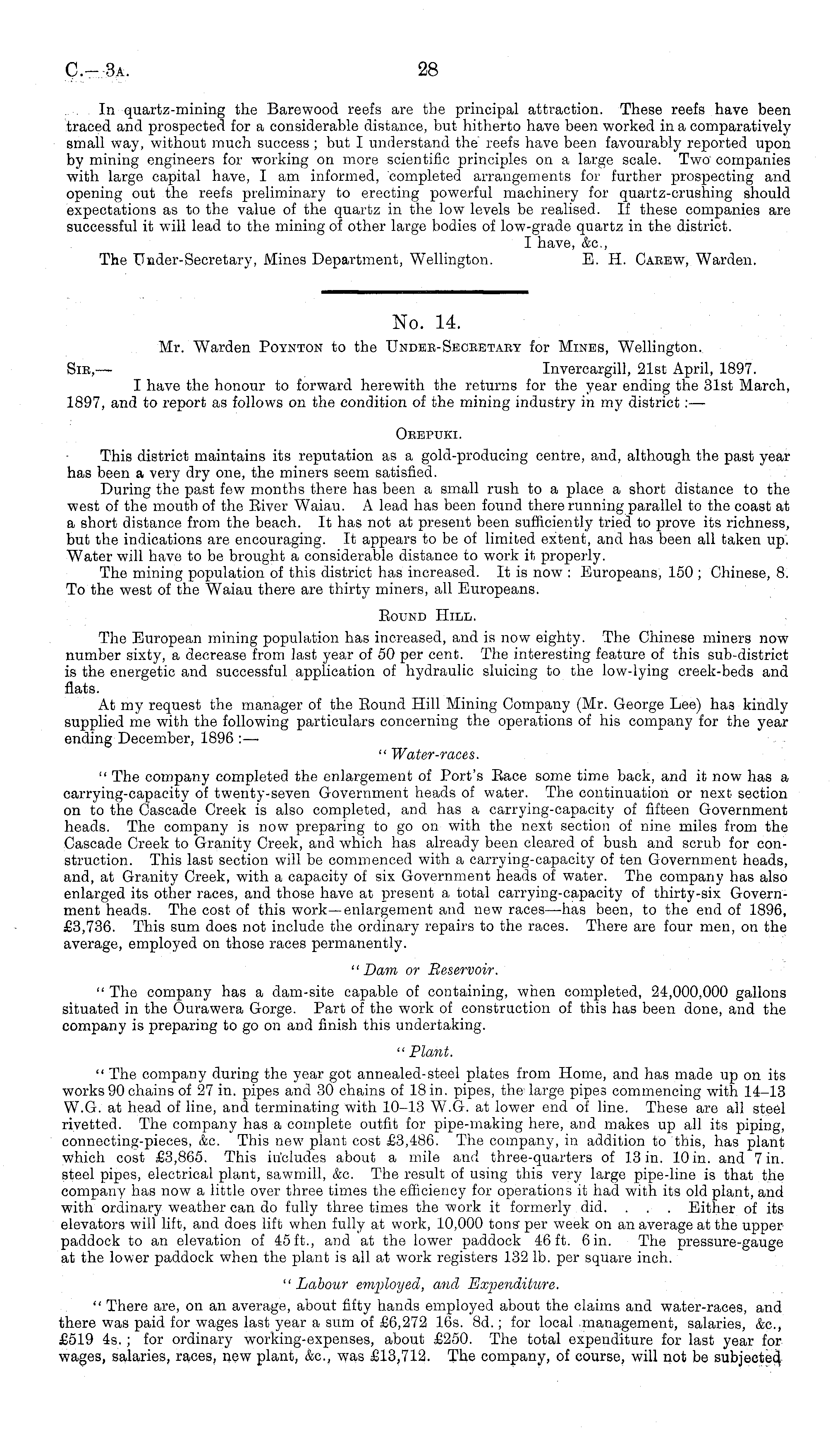 No. 14. Mr. Warden Poynton to the Undeb-Secretary for Mines, Wellington. Sir,— Invercargill, 21st April, 1897. I have the honour to forward herewith the returns for the year ending the 31st March, 1897, and to report as follows on the condition of the mining industry in my district :— Orepuki. This district maintains its reputation as a gold-producing centre, and, although the past year has been a very dry one, the miners seem satisfied. During the past few months there has been a small rush to a place a short distance to the west of the mouth of the River Waiau. A lead has been found there running parallel to the coast at a short distance from the beach. It has not at present been sufficiently tried to prove its richness, but the indications are encouraging. It appeal's to be of limited extent, and has been all taken up. Water will have to be brought a considerable distance to woi-k it properly. The mining population of this district has increased. It is now : Europeans, 150 ; Chinese, 8. To the west of the Waiau there are thirty miners, all Europeans. Round Hild. The European mining population has increased, and is now eighty. The Chinese miners now number sixty, a decrease from last year of 50 per cent. The interesting feature of this sub-district is the energetic and successful application of hydraulic sluicing to the low-lying creek-beds and flats. At my request the manager of the Round Hill Mining Company (Mr. George Lee) has kindly supplied me with the following particulars concerning the operations of his company for the year ending December, 1896 : — " Water-races. " The company completed the enlargement of Port's Race some time back, and it now has a carrying-capacity of twenty-seven Government heads of water. The continuation or next section on to the Cascade Creek is also completed, and has a carrying-capacity of fifteen Government heads. The company is now preparing to go on with the next section of nine miles from the Cascade Creek to Granity Creek, and which has already been cleared of bush and scrub for construction. This last section will be commenced with a carrying-capacity of ten Government heads, and, at Granity Creek, with a capacity of six Government heads of water. The company has also enlarged its other races, and those have at present a total carrying-capacity of thirty-six Government heads. The cost of this work —enlargement and new races —has been, to the end of 1896, £3,736. This sum does not include the ordinary repairs to the races. There are four men, on the average, employed on those races permanently. "Dam or Beservoir. " The company has a dam-site capable of containing, when completed, 24,000,000 gallons situated in the Ourawera Gorge. Part of the work of construction of this has been done, and the company is preparing to go on and finish this undertaking. "Plant. " The company during the year got annealed-steel plates from Home, and has made up on its works 90 chains of 27 in. pipes and 30 chains of 18 in. pipes, the large pipes commencing with 14-13 W.G. at head of line, and terminating with 10-13 W.G. at lower end of line. These are all steel rivetted. The company has a complete outfit for pipe-making here, and makes up all its piping, connecting-pieces, &c. This new plant cost £3,486. The company, in addition to this, has plant which cost £3,865. This iricludes about a mile and three-quarters of 13 in. 10 in. and 7 in. steel pipes, electrical plant, sawmill, &c. The result of using this very large pipe-line is that the company has now a little over three times the efficiency for operations it had with its old plant, and with ordinary weather can do fully three times the work it formerly did. . . . Either of its elevators will lift, and does lift when fully at work, 10,000 tons' per week on an average at the upper paddock to an elevation of 45 ft., and at the lower paddock 46 ft. 6 in. The pressure-gauge at the lower paddock when the plant is all at work registers 132 lb. per square inch. " Labour employed, and Expenditure. " There are, on an average, about fifty hands employed about the claims and water-races, and there was paid for wages last year a sum of £6,272 16s. Bd.; for local management, salaries, &c, £519 4s. ; for ordinary working-expenses, about £250. The total expenditure for last year for wages, salaries, races, new plant, &c, was £13,712. The company, of course, will not be subjected