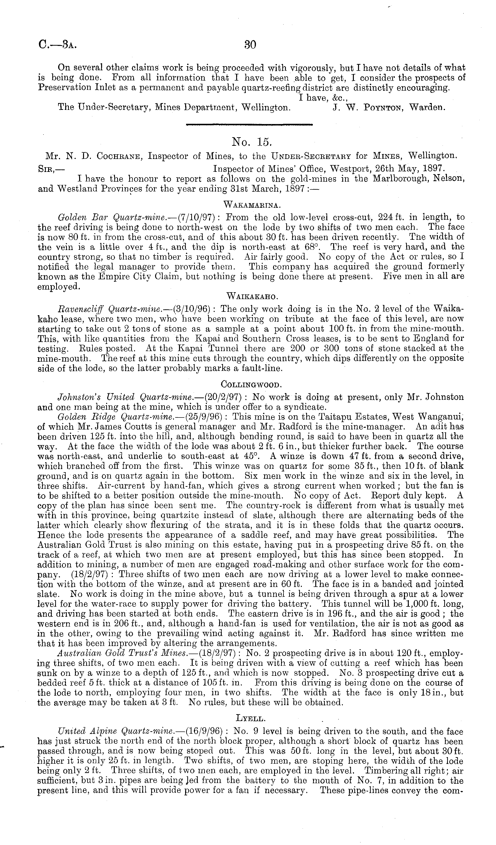 No. 15. Mr. N. D. Cochrane, Inspector of Mines, to the Under- Secbetaby for Mines, Wellington. Sib,— Inspector of Mines' Office, Westport, 26th May, 1897. I have the honour to report as follows on the gold-mines in the Marlborough, Nelson, and Westland Provinces for the year ending 31st March, 1897 : — Wakamabina. Golden Bar Quartz-mine. —(7/10/97) : From the old low-level cross-cut, 224 ft. in length, to the reef driving is being done to north-west on the lode by two shifts of two men each. The face is now 80 ft. in from the cross-cut, and of this about 30 ft. has been driven recently. The width of the vein is a little over 4 fc, and the dip is north-east at 68°. The reef is very hard, and the country strong, so that no timber is required. Air fairly good. No copy of the Act or rules, so I notified the legal manager to provide them. This company has acquired the ground formerly known as the Empire City Claim, but nothing is being done there at present. Five men in all are employed. Waikakaho. Ravenscliff Quartz-mine. —(3/10/96): The only work doing is in the No. 2 level of the Waikakaho lease, where two men, who have been working on tribute at the face of this level, are now starting to take out 2 tons of stone as a sample at a point about 100 ft. in from the mine-mouth. This, with like quantities from the Kapai and Southern Cross leases, is to be sent to England for testing. Eules posted. At the Kapai Tunnel there are 200 or 300 tons of stone stacked at the mine-mouth. The reef at this mine cuts through the country, which dips differently on the opposite side of the lode, so the latter probably marks a fault-line. COLLINGWOOD. Johnston's United Quartz-mine. —(20/2/97) : No work is doing at present, only Mr. Johnston and one man being at the mine, which is under offer to a syndicate. Golden Bidge Quartz-mine. —(25/9/96) : This mine is on the Taitapu Estates, West Wanganui, of which Mr. James Coutts is general manager and Mr. Eadford is the mine-manager. An adit has been driven 125 ft. into the hill, and, although bending round, is said to have been in quartz all the way. At the face the width of the lode was about 2 ft. 6 in., but thicker further back. The course was north-east, and underlie to south-east at 45°. A winze is down 47 ft. from a second drive, which branched off from the first. This winze was on quartz for some 35 ft., then 10 ft. of blank ground, and is on quartz again in the bottom. Six men work in the winze and six in the level, in three shifts. Air-current by hand-fan, which gives a strong current when worked ; but the fan is to be shifted to a better position outside the mine-mouth. No copy of Act. Beport duly kept. A copy of the plan has since been sent me. The country-rock is different from what is usually met with in this province, being quartzite instead of slate, although there are alternating beds of the latter which clearly show flexuring of the strata, and it is in these folds that the quartz occurs. Hence the lode presents the appearance of a saddle reef, and may have great possibilities. The Australian Gold Trust is also mining on this estate, having put in a prospecting drive 85 ft. on the track of a reef, at which two men are at present employed, but this has since been stopped. In addition to mining, a number of men are engaged road-making and other surface work for the company. (18/2/97) : Three shifts of two men each are now driving at a lower level to make connection with the bottom of the winze, and at present are in 60 ft. The face is in a banded and jointed slate. No work is doing in the mine above, but a tunnel is being driven through a spur at a lower level for the water-race to supply power for driving the battery. This tunnel will be 1,000 ft. long, and driving has been started at both ends. The eastern drive is in 196 ft., and the air is good ; the western end is in 206 ft., and, although a hand-fan is used for ventilation, the air is not as good as in the other, owing to the prevailing wind acting against it. Mr. Eadford has since written me that it has been improved by altering the arrangements. Australian Gold Trust's Mines. —(18/2/97) : No. 2 prospecting drive is in about 120 ft., employing three shifts, of two men each. It is being driven with a view of cutting a reef which has been sunk on by a winze to a depth of 125 ft., and which is now stopped. No. 3 prospecting drive cut a bedded reef 5 ft. thick at a distance of 105 ft. in. From this driving is being done on the course of the lode to north, employing four men, in two shifts. The width at the face is only 18in., but the average may be taken at 3 ft. No rules, but these will be obtained. Ltbll. United Alpine Quartz-mine. —(16/9/96) : No. 9 level is being driven to the south, and the face has just struck the north end of the north block proper, although a short block of quartz has been passed through, and is now being stoped out. This was 50 ft. long in the level, but about 30 ft. higher it is only 25 ft. in length. Two shifts, of two men, are stoping here, the width of the lode being only 2 ft. Three shifts, of two men each, are employed in the level. Timbering all right; air sufficient, but 3 in. pipes are being Jed from the battery to the mouth of No. 7, in addition to the present line, and this will provide power for a fan if necessary. These pipe-lines convey the com-