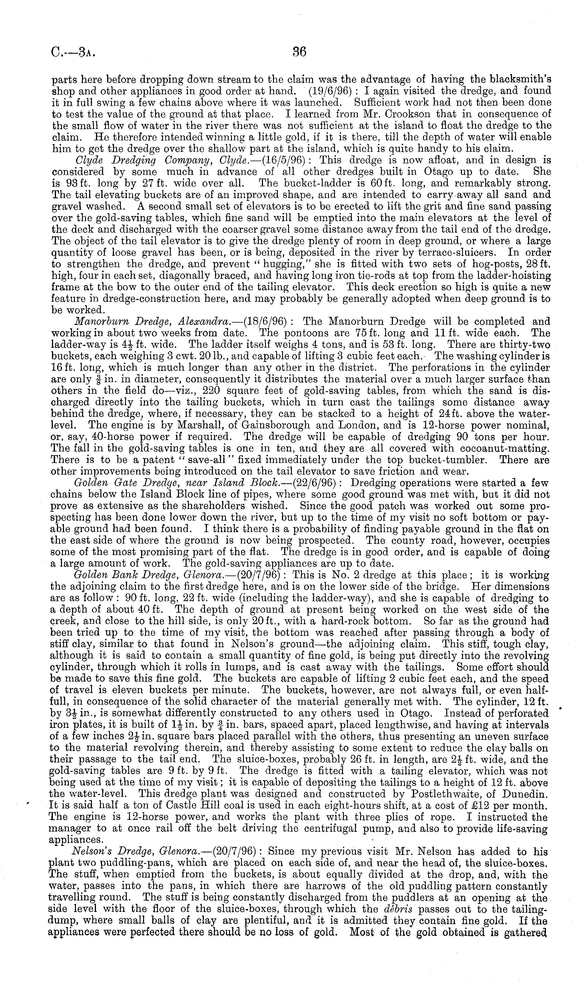 parts here before dropping down stream to the claim was the advantage of having the blacksmith's shop and other appliances in good order at hand. (19/6/96) : I again visited the dredge, and found it in full swing a few chains above where it was launched. Sufficient work had not then been done to test the value of the ground at that place. I learned from Mr. Crookson that in consequence of the small flow of water in the river there was not sufficient at the island to float the dredge to the claim. He therefore intended winning a little gold, if it is there, till the depth of water will enable him to get the dredge over the shallow part at the island, which is quite handy to his claim. Clyde Dredging Company, Clyde. —(l 6/5/96) : This dredge is now afloat, and in design is considered by some much in advance of all other dredges built in Otago up to date. She is 93 ft. long by 27 ft. wide over all. The bucket-ladder is 60 ft. long, and remarkably strong. The tail elevating buckets are of an improved shape, and are intended to carryaway all sand and gravel washed. A second small set of elevators is to be erected to lift the grit and fine sand passing over the gold-saving tables, which fine sand will be emptied into the main elevators at the level of the deck and discharged with the coarser gravel some distance away from the tail end of the dredge. The object of the tail elevator is to give the dredge plenty of room in deep ground, or where a large quantity of loose gravel has been, or is being, deposited in the river by terrace-sluicers. In order to strengthen the dredge, and prevent "hugging," she is fitted with two sets of hog-posts, 28ft. high, four in each set, diagonally braced, and having long iron tie-rods at top from the ladder-hoisting frame at the bow to the outer end of the tailing elevator. This deck erection so high is quite a new feature in dredge-construction here, and may probably be generally adopted when deep ground is to be worked. Manorburn Dredge, Alexandra. —(18/6/96) : The Manorburn Dredge will be completed and working in about two weeks from date. The pontoons are 75 ft. long and lift, wide each. The ladder-way is 4J ft. wide. The ladder itself weighs 4 tons, and is 53 ft. long. There are thirty-two buckets, each weighing 3 cwt. 20 lb., and capable of lifting 3 cubic feet each. The washing cylinder is 16 ft. long, which is much longer than any other in the district. The perforations in the cylinder are only § in. in diameter, consequently it distributes the material over a much larger surface than others in the field do—viz., 220 square feet of gold-saving tables, from which the sand is discharged directly into the tailing buckets, which in turn cast the tailings some distance away behind the dredge, where, if necessary, they can be stacked to a height of 24ft. above the waterlevel. The engine is by Marshall, of Gainsborough and London, and is 12-horse power nominal, or, say, 40-horse power if required. The dredge will be capable of dredging 90 tons per hour. The fall in the gold-saving tables is one in ten, and they are all covered with cocoanut-matting. There is to be a patent " save-all" fixed immediately under the top bucket-tumbler. There are other improvements being introduced on the tail elevator to save friction and wear. Golden Gate Dredge, near Island 810ck. —(22/6/96) : Dredging operations were started a few chains below the Island Block line of pipes, where some good ground was met with, but it did not prove as extensive as the shareholders wished. Since the good patch was worked out some prospecting has been done lower down the river, but up to the time of my visit no soft bottom or payable ground had been found. I think there is a probability of finding payable ground in the flat on the east side of where the ground is now being prospected. The county road, however, occupies some of the most promising part of the flat. The dredge is in good order, and is capable of doing a large amount of work. The gold-saving appliances are up to date. Golden Bank Dredge, Glenora. —(20/7/96): This is No. 2 dredge at this place; it is working the adjoining claim to the first dredge here, and is on the lower side of the bridge. Her dimensions are as follow : 90 ft. long, 22 ft. wide (including the ladder-way), and she is capable of dredging to a depth of about 40 ft. The depth of ground at present being worked on the west side of the Creek, and close to the hill side, is only 20 ft., with a hard-rock bottom. So far as the ground had been tried up to the time of my visit, the bottom was reached after passing through a body of stiff clay, similar to that found in Nelson's ground—the adjoining claim. This stiff, tough clay, although it is said to contain a small quantity of fine gold, is being put directly into the revolving cylinder, through which it rolls in lumps, and is cast away with the tailings. Some effort should be made to save this fine gold. The buckets are capable of lifting 2 cubic feet each, and the speed of travel is eleven buckets per minute. The buckets, however, are not always full, or even halffull, in consequence of the solid character of the material generally met with. The cylinder, 12 ft. by 3-J-in., is somewhat differently constructed to any others used in Otago. Instead of perforated iron plates, it is built of ljin. by fin. bars, spaced apart, placed lengthwise, and having at intervals of a few inches 2|-in. square bars placed parallel with the others, thus presenting an uneven surface to the material revolving therein, and thereby assisting to some extent to reduce the clay balls on their passage to the tail end. The sluice-boxes, probably 26 ft. in length, are 2Jft. wide, and the gold-saving tables are 9 ft. by 9 ft. The dredge is fitted with a tailing elevator, which was not being used at the time of my visit; it is capable of depositing the tailings to a height of 12 ft. above the water-level. This dredge plant was designed and cons