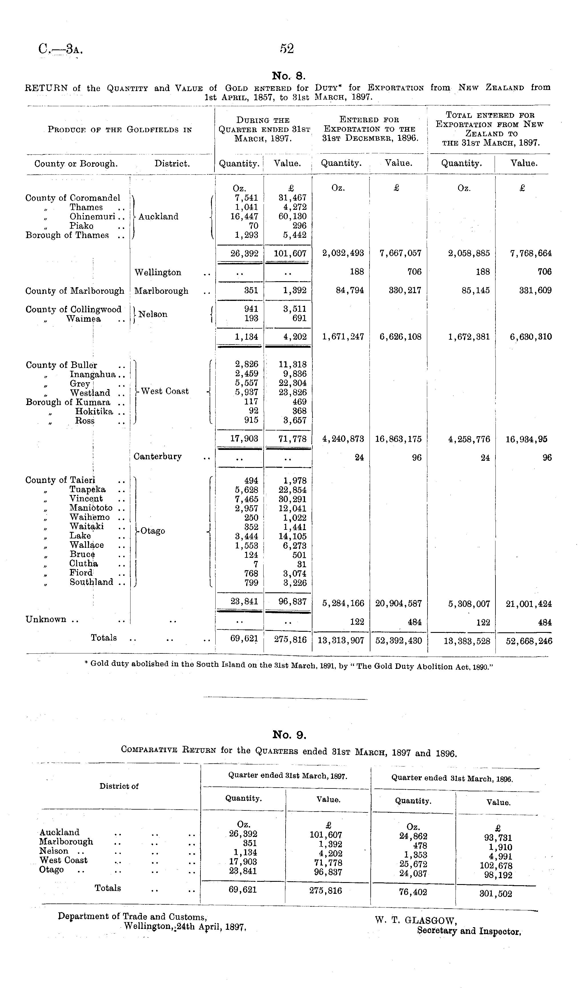 Quarter ended ilst March, 1897. Quarter ended 3: 1st March, 1896. District of Quantity. Value. Quantity. Value. Auckland ilarlborough kelson .. West Coast 3tago L Oz. 26,392 351 1,134 17,903 23,841 £ 101,607 1,392 4,202 71,778 96,837 Oz. 24,862 478 1,353 25,672 24,037 £ 93,731 1,910 4,991 102,678 98,192 Totals 69,621 275,816 76,402 301,502 Department of Trade and Custon Wellington,.24th IS, April, 1897, W. T. GLASGOW Seoretarj and Insi lector,