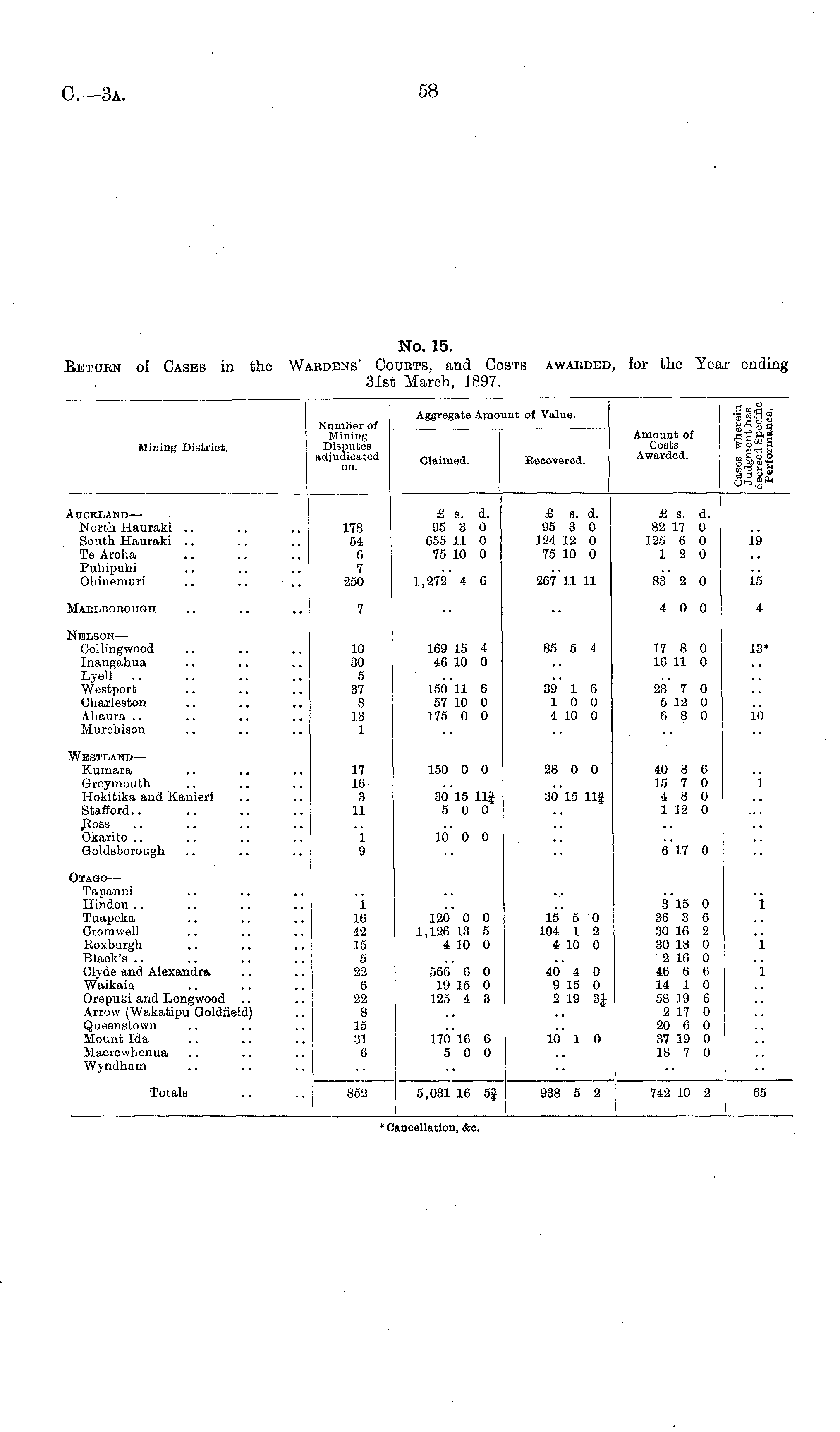 No. 15. Return of Cases in the Wardens' Courts, and Costs awarded, for the Year ending 31st March, 1897.