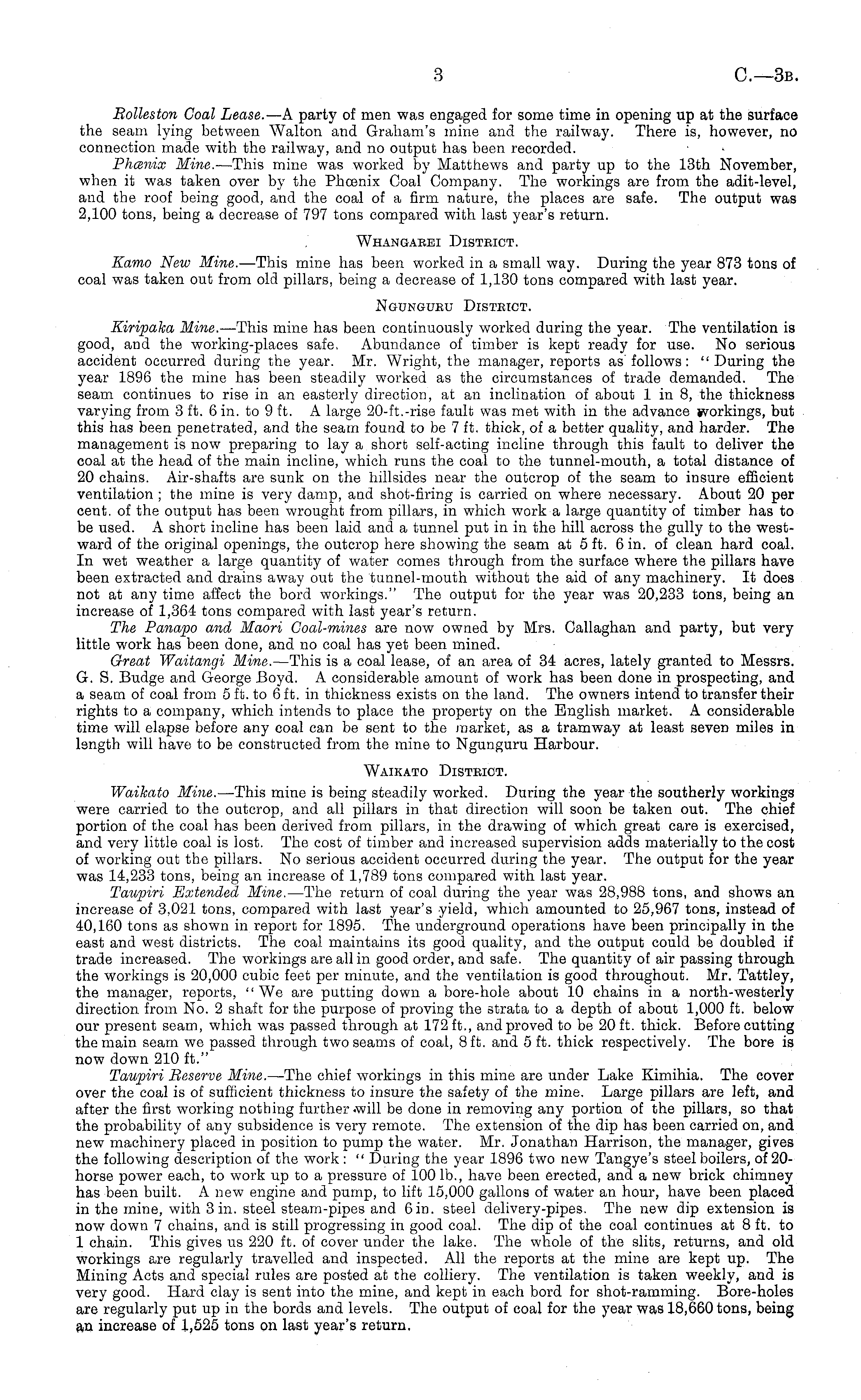 Bolleston Goal Lease. —A party of men was engaged for some time in opening up at the surface the seam lying between Walton and Graham's mine and the railway. There is, however, no connection made with the railway, and no output has been recorded. Phoenix Mine. —This mine was worked by Matthews and party up to the 13th November, when it was taken over by the Phcenix Goal Company. The workings are from the adit-level, and the roof being good, and the coal of a firm nature, the places are safe. The output was 2,100 tons, being a decrease of 797 tons compared with last year's return. Whang-akei District. Kamo New Mine. —This mine has been worked in a small way. During the year 873 tons of coal was taken out from old pillars, being a decrease of 1,130 tons compared with last year. Ngungueu District. Kiripaka Mine. —This mine has been continuously worked during the year. The ventilation is good, and the working-places safe, Abundance of timber is kept ready for use. No serious accident occurred during the year. Mr. Wright, the manager, reports as follows: "During the year 1896 the mine has been steadily worked as the circumstances of trade demanded. The seam continues to rise in an easterly direction, at an inclination of about 1 in 8, the thickness varying from 3 ft. 6 in. to 9 ft. A large 20-ft.-rise fault was met with in the advance workings, but this has been penetrated, and the seam found to be 7 ft. thick, of a better quality, and harder. The management is now preparing to lay a short self-acting incline through this fault to deliver the coal at the head of the main incline, which runs the coal to the tunnel-mouth, a total distance of 20 chains. Air-shafts are sunk on the hillsides near the outcrop of the seam to insure efficient ventilation ; the mine is very damp, and shot-firing is carried on where necessary. About 20 per cent, of the output has been wrought from pillars, in which work a large quantity of timber has to be used. A short incline has been laid and a tunnel put in in the hill across the gully to the westward of the original openings, the outcrop here showing the seam at 5 ft. 6 in. of clean hard coal. In wet weather a large quantity of water comes through from the surface where the pillars have been extracted and drains away out the tunnel-mouth without the aid of any machinery. It does not at any time affect the bord workings." The output for the year was 20,233 tons, being an increase of 1,364 tons compared with last year's return. The Panapo and Maori Goal-mines are now owned by Mrs. Callaghan and party, but very little work has been done, and no coal has yet been mined. Great Waitangi Mine. —This is a coal lease, of an area of 34 acres, lately granted to Messrs. G. S. Budge and George Boyd. A considerable amount of work has been done in prospecting, and a seam of coal from 5 ft. to 6 ft. in thickness exists on the land. The owners intend to transfer their rights to a company, which intends to place the property on the English market. A considerable time will elapse before any coal can be sent to the market, as a tramway at least seven miles in length will have to be constructed from the mine to Ngunguru Harbour. Waikato District. Waikato Mine. —This mine is being steadily worked. During the year the southerly workings were carried to the outcrop, and all pillars in that direction will soon be taken out. The chief portion of the coal has been derived from pillars, in the drawing of which great care is exercised, and very little coal is lost. The cost of timber and increased supervision adds materially to the cost of working out the pillars. No serious accident occurred during the year. The output for the year was 14,233 tons, being an increase of 1,789 tons compared with last year. Taupiri Extended Mine. —The return of coal during the year was 28,988 tons, and shows an increase of 3,021 tons, compared with last year's yield, which amounted to 25,967 tons, instead of 40,160 tons as shown in report for 1895. The underground operations have been principally in the east and west districts. The coal maintains its good quality, and the output could be doubled if trade increased. The workings are all in good order, and safe. The quantity of air passing through the workings is 20,000 cubic feet per minute, and the ventilation is good throughout. Mr. Tattley, the manager, reports, "We are putting down a bore-hole about 10 chains in a north-westerly direction from No. 2 shaft for the purpose of proving the strata to a depth of about 1,000 ft. below our present seam, which was passed through at 172 ft., and proved to be 20 ft. thick. Before cutting the main seam we passed through two seams of coal, 8 ft. and 5 ft. thick respectively. The bore is now down 210 ft." Taupiri Reserve Mine. —The chief workings in this mine are under Lake Kimihia. The cover over the coal is of sufficient thickness to insure the safety of the mine. Large pillars are left, and after the first working nothing further-will be done in removing any portion of the pillars, so that the probability of any subsidence is very remote. The extension of the dip has been carried on, and new machinery placed in position to pump the water. Mr. Jonathan Harrison, the manager, gives the following description of the work : " During the year 1896 two new Tangye's steel boilers, of 20--horse power each, to work up to a pressure of 100 lb., have been erected, and a new brick chimney has been built. A new engine and pump, to lift 15,000 gallons of water an hour, have been placed in the mine, with 3 in. steel steam-pipes and 6 in. steel delivery-pipes. The new dip extension is now down 7 chains, and is still progressing in good coal. The dip of the coal continues at 8 ft. to 1 chain. This gives us 220 ft. of cover under the lake. The whole of the slits, returns, and old workings are regularly travelled and inspected. All the reports at the mine are kept up. The Mining Acts and special rules are posted at the col