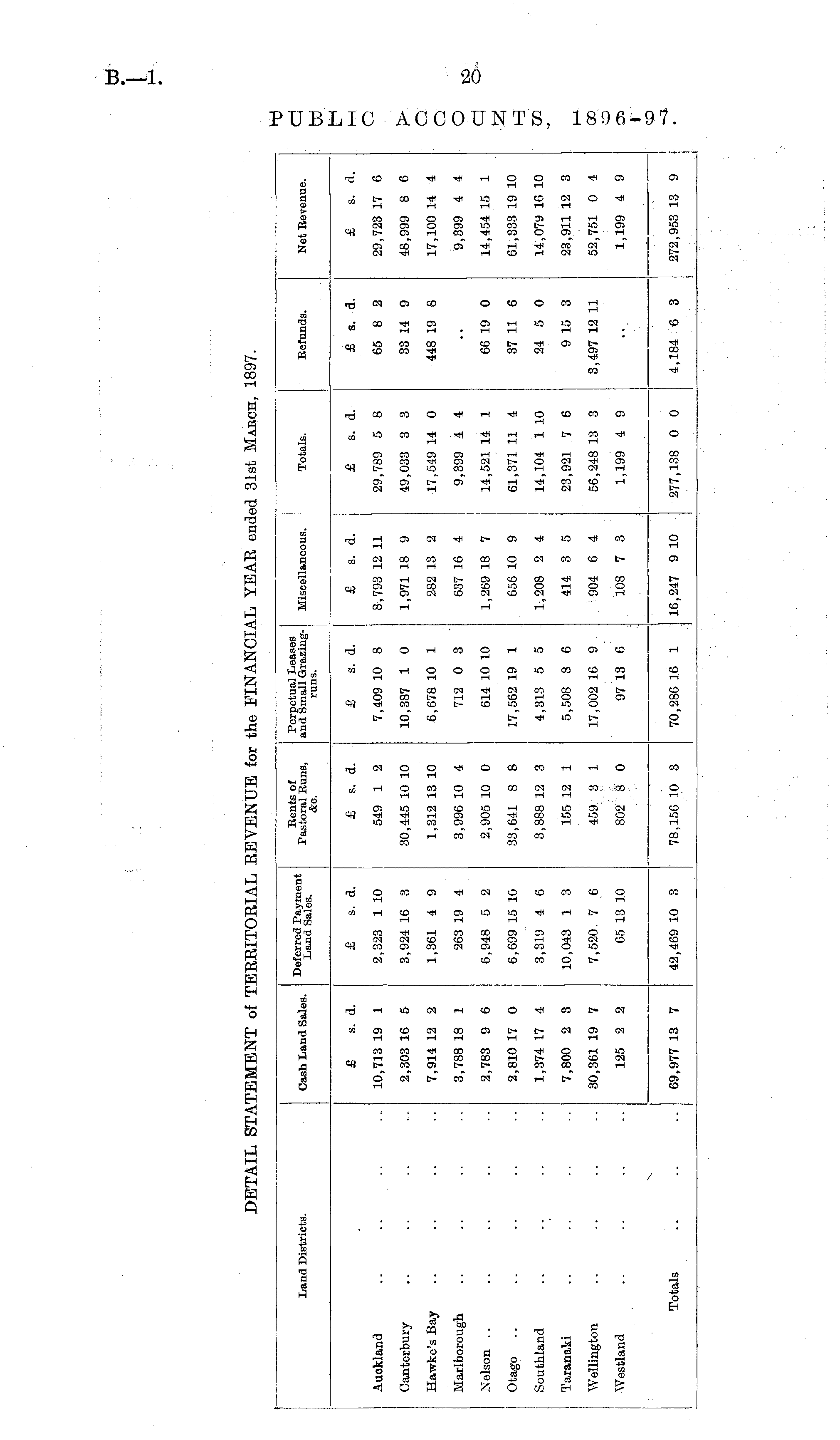 Land Districts. Gash Land Sales. Deferred Payment Land Sales. Rents of Pastoral Runs, &c. Perpetual Leases and Small Grazingruns. Miscellaneous. Totals. Refunds. Net Revenue. £ s. d. £ s. d. £ s. d. £ s. d. £ s. d. £ s. d. £ s. d. £ s. d. Auckland 10,713 19 1 2,323 1 10 549 1 2 7,409 10 8 8,793 12 11 29,789 5 8 65 8 2 29,723 17 6 Canterbury 2,303 16 5 3,924 16 3 30,445 10 10 10,387 1 0 1,971 18 9 49,033 3 3 33 14 9 48,999 8 6 Hawke's Bay 7,914 12 2 1,361 4 9 1,312 13 10 6,678 10 1 282 13 2 17,549 14 0 448 19 8 17,100 14 4 Marlborough 3,788 18 1 263 19 4 3,996 10 4 712 0 3 637 16 4 9,399 4 4 9,399 4 4 Nelson 2,783 9 6 6,948 5 2 2,905 10 0 614 10 10 1,269 18 7 14,521 14 1 66 19 0 14,454 15 1 Otago 2,810 17 0 6,699 15 10 33,641 8 8 17,562 19 1 656 10 9 61,371 11 4 37 11 6 61,333 19 10 Southland 1,374 17 4 3,319 4 6 3,888 12 3 4,313 5 5 1,208 2 4 14,104 1 10 24 5 0 14,079 16 10 Taranaki 7,800 2 3 10,043 1 3 155 12 1 5,508 8 6 414 3 5 23,921 7 6 9 15 3 23,911 12 3 Wellington 30,361 19 7 7,520 7 6 459 3 1 17,002 16 9 97 13 6 904 6 4 56,248 13 3 3,497 12 11 52,751 0 4 Westland 125 2 2 65 13 10 802 8 0 108 7 3 1,199 4 9 1,199 4 9 \ Totals 69,977 13 7 42,469 10 3 78,156 10 3 70,286 16 1 16,247 9 10 4,184 6 3 272,953 13 9 277,138 0 0