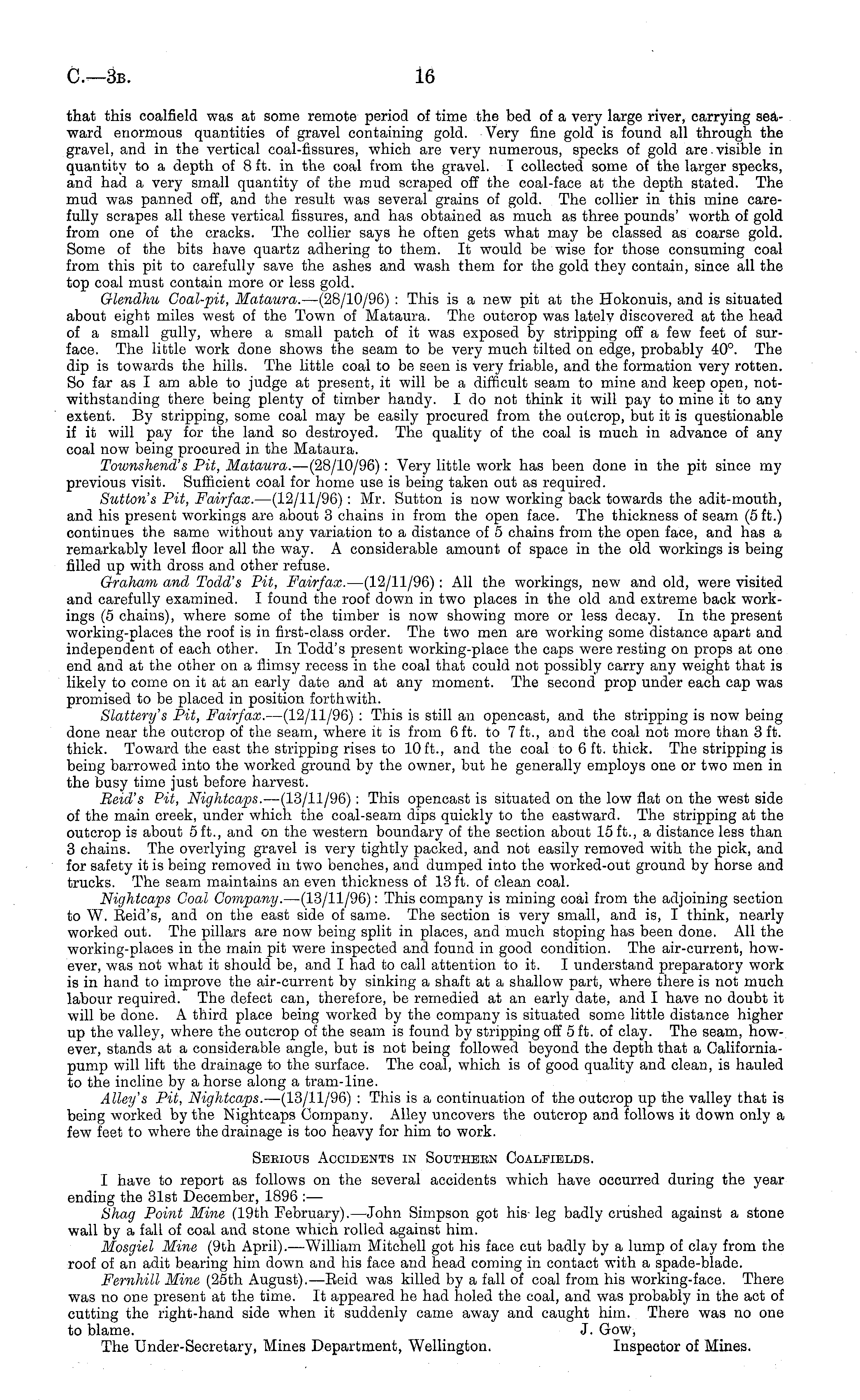 that this coalfield was at some remote period of time the bed of a very large river, carrying seaward enormous quantities of gravel containing gold. Very fine gold is found all through the gravel, and in the vertical coal-fissures, which are very numerous, specks of gold are visible in quantity to a depth of 8 ft. in the coal from the gravel. I collected some of the larger specks, and had a very small quantity of the mud scraped off the coal-face at the depth stated. The mud was panned off, and the result was several grains of gold. The collier in this mine carefully scrapes all these vertical fissures, and has obtained as much as three pounds' worth of gold from one of the cracks. The collier says he often gets what may be classed as coarse gold. Some of the bits have quartz adhering to them. It would be wise for those consuming coal from this pit to carefully save the ashes and wash them for the gold they contain, since all the top coal must contain more or less gold. Olendhu Coal-pit, Mataura. —(2B/10/96) : This is a new pit at the Hokonuis, and is situated about eight miles west of the Town of Mataura. The outcrop was lately discovered at the head of a small gully, where a small patch of it was exposed by stripping off a few feet of surface. The little work done shows the seam to be very much tilted on edge, probably 40°. The dip is towards the hills. The little coal to be seen is very friable, and the formation very rotten. So far as I am able to judge at present, it will be a difficult seam to mine and keep open, notwithstanding there being plenty of timber handy. 1 do not think it will pay to mine it to any extent. By stripping, some coal may be easily procured from the outcrop, but it is questionable if it will pay for the land so destroyed. The quality of the coal is much in advance of any coal now being procured in the Mataura. Townshend's Pit, Mataura. —(28/10/96): Very little work has been done in the pit since my previous visit. Sufficient coal for home use is being taken out as required. Sutton's Pit, Fairfax. —(12/11/96): Mr. Sutton is now working back towards the adit-mouth, and his present workings are about 3 chains in from the open face. The thickness of seam (5 ft.) continues the same without any variation to a distance of 5 chains from the open face, and has a remarkably level floor all the way. A considerable amount of space in the old workings is being filled up with dross and other refuse. Graham and Todd's Pit, Fairfax. —(12/11/96): All the workings, new and old, were visited and carefully examined. I found the roof down in two places in the old and extreme back workings (5 chains), where some of the timber is now showing more or less decay. In the present working-places the roof is in first-class order. The two men are working some distance apart and independent of each other. In Todd's present working-place the caps were resting on props at one end and at the other on a flimsy recess in the coal that could not possibly carry any weight that is likely to come on it at an early date and at any moment. The second prop under each cap was promised to be placed in position forthwith. Slattery's Pit, Fairfax. —(12/11/96) : This is still an opencast, and the stripping is now being done near the outcrop of the seam, where it is from 6 ft. to 7 ft., and the coal not more than 3 ft. thick. Toward the east the stripping rises to 10 ft., and the coal to 6 ft. thick. The stripping is being barrowed into the worked ground by the owner, but he generally employs one or two men in the busy time just before harvest. Reid's Pit, Nightcaps. —(l 3/11/96) : This opencast is situated on the low flat on the west side of the main creek, under which the coal-seam dips quickly to the eastward. The stripping at the outcrop is about 5 ft., and on the western boundary of the section about 15 ft., a distance less than 3 chains. The overlying gravel is very tightly packed, and not easily removed with the pick, and for safety it is being removed in two benches, and dumped into the worked-out ground by horse and trucks. The seam maintains an even thickness of 13 ft. of clean coal. Nightcaps Goal Company. —(l 3/11/96): This company is mining coal from the adjoining section to W. Eeid's, and on the east side of same. The section is very small, and is, I think, nearly worked out. The pillars are now being split in places, and much stoping has been done. All the working-places in the main pit were inspected and found in good condition. The air-current, however, was not what it should be, and I had to call attention to it. I understand preparatory work is in hand to improve the air-current by sinking a shaft at a shallow part, where there is not much labour required. The defect can, therefore, be remedied at an early date, and I have no doubt it will be done. A third place being worked by the company is situated some little distance higher up the valley, where the outcrop of the seam is found by stripping off 5 ft. of clay. The seam, however, stands at a considerable angle, but is not being followed beyond the depth that a Californiapump will lift the drainage to the surface. The coal, which is of good quality and clean, is hauled to the incline by a horse along a tram-line. Alley's Pit, Nightcaps. —(13/11/96) : This is a continuation of the outcrop up the valley that is being worked by the Nightcaps Company. Alley uncovers the outcrop and follows it down only a few feet to where the drainage is too heavy for him to work. Seeious Accidents in Southern Coalfields. I have to report as follows on the several accidents which have occurred during the year ending the 31st December, 1896 :— Shag Point Mine (19th February).—John Simpson got his leg badly crushed against a stone wall by a fall of coal and stone which rolled against him. Mosgiel Mine (9th April). —William Mitchell got his face cut badly by a lump of clay from the roof of an adit bearing him down and his face and head com