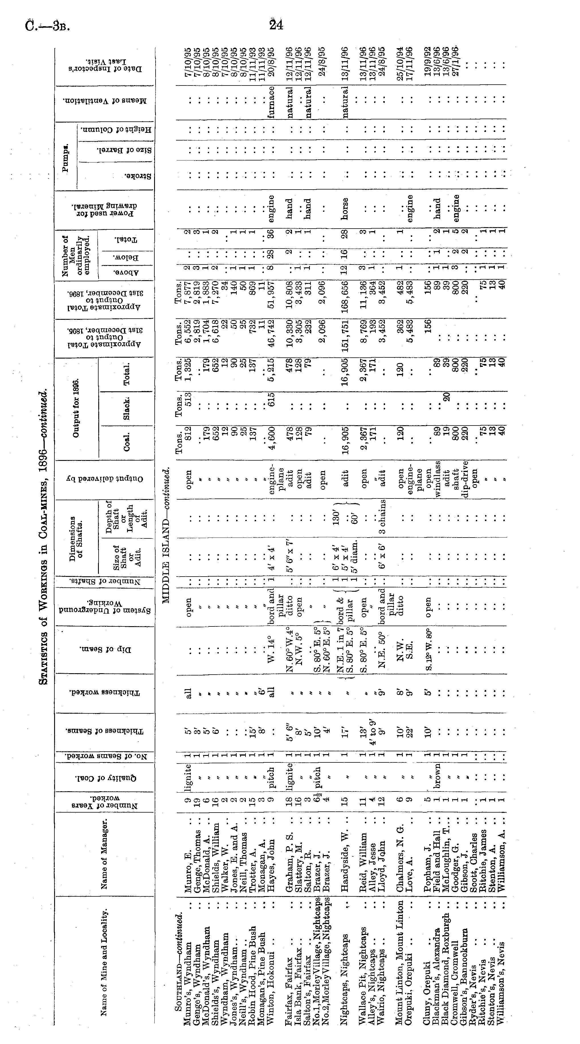 Name of Mine and Locality. Name of Manager. 1 © o 55 ■s o . ■s ■a o 6 ■■Io I I at i DO P. 5 i o ■a a a> Kβ 5 Depth of Size of Shaft Shaft or or Length Adit. of Adit. Dimensions of Shafts. 0 Pi 5 Coal. Slack. Total. Output for 1896. 111 Number of Men ordinarily employed. 6 te ! rl n imps. •I 1 3 3 c> S ft a» Jib Q I a: Southland — continued. Munro's, Wyndham Genge's, Wyndham McDonald's, Wyndham Shields's, Wyndham Wyndham, Wyndham Jones's, Wyndham.. Neill's, Wyndham .. Robin Hood, Pine Bush Monagan's, Pine Bush Winton, Hokonui Mil >LE ISLAND— cor. ttinued. Munro, E. Genge, Thomas .. McDonald, A. .. Shields, William Walker, W. Jones, E. and A. Neill, Thomas .. Trotter, A. Monagan, A. Hayes, John 9 16 I 2 15 3 9 lignite 1 1 1 1 1 1 1 1 1 1 5' 3' 5' 6' all open open Tons. 812 Tons. 513 Tons. 1,325 Tons. 6,552 2,819 1,704 6,618 22 50 25 732 11 46,742 Tons. 7,877 2,819 1,883 7,270 34 140 50 869 11 51,957 2 3 1 2 2 3 1 2 7/10/95 7/10/95 8/10/95 8/10/95 7/10/95 8/10/95 8/10/95 11/11/93 11/11/93 20/8/95 •I •• 179 652 12 90 25 137 179 652 12 90 25 137 .. 1 1 1 1 1 1 " 15' 8' It 6' all " I pitch W. 14° bord and pillar ditto 1 ■• •■ engineplane adit open adit 4 i<300 615 5,215 1 8 28 36 engine furnace 4'x4' Fairfax, Fairfax Isla Bank, Fairfax Salton's, Fairfax No.l,Morley Village, Nightcaps No.2,Morley Village, Nightcaps Graham, P. S. Slattery, M. Salton, R. Brazer, J. Brazer, J. 18 16 3 4 lignite pitch 1 1 1 1 1 5' 6" 8' 5' 10' 4' N.60°W.4° N.W. 5° S. 80° E. 5° N.60°E.5° open I • 5'6"x7' .. 478 128 79 478 128 79 10,330 3,305 232 10,808 3,433 311 1 1 2 2 1 1 hand hand natural natural 12/11/96 12/11/96 12/11/96 I " open 2,096 2,096 24/8/95 Nightcaps, Nightcaps ,. Handyside, W. .. 15 17' ! N.E. 1 in 7 S. 80° E. 5° bord & j pillar 1 1 1 1 6' x 4' I 130' ) 5'x4' .. L 5' diam. 60' J adit 16,905 16,905 151,751 168,656 12 161 28 horse natural 13/11/96 Wallace Pit, Nightcaps Alley's, Nightcaps Wairio, Nightcaps Reid, William .. Alley, Jesse Lloyd, John 11 1 1 1 13' 4' to 9' 9' S. 80° E. 5° open open 2,367 171 2,367 171 8,769 193 3,452 11,136 364 3,452 3 1 3 1 13/11/96 13/11/96 24/8/95 ' 9' N.E.' 50° 6' x 6' 3 chains adit Mount Linton, Mount Linton Orepuki. Orepuki .. Chalmers, N. G. Love, A. 6 9 . 10' 22' 8' 9' N.W. S.E. bord and pillar ditto .. open engineplane open windlass adit shaft dip-drive open 120 120 362 5,483 482 5,483 1 1 engine 25/10/94 17/11/96 1 1 I • • Cluny, Orepuki Blackman's, Alexandra Black Diamond, Roxburgh .. Cromwell, Cromwell Gibson's, Bannockburn Ryder's, Nevis Ritchie's, Nevis Stenton's, Nevis Williamson's, Nevis Popham, J. Field ana Hall .. McLoughlin, T... Goodger, G. Gibson, J. Scott, Charles .. Ritchie, James .. Stenton, A. Williamson, A. .. 5 1 1 1 1 1 1 1 1 1 10' 5' S. 12° W. 80° open 89 19 800 220 89 39 800 220 156 156 89 39 800 220 hand 19/9/92 13/6/96 13/6/96 27/1/96 brown .. "20 1 1 3 1 2 1 5 2 2 2 engine 1 i i •• 75 13 40 75 13 40 1 1 1 1 1 1 ■• 1 75 13 40 .. ■• • • I . I .. 1 ..