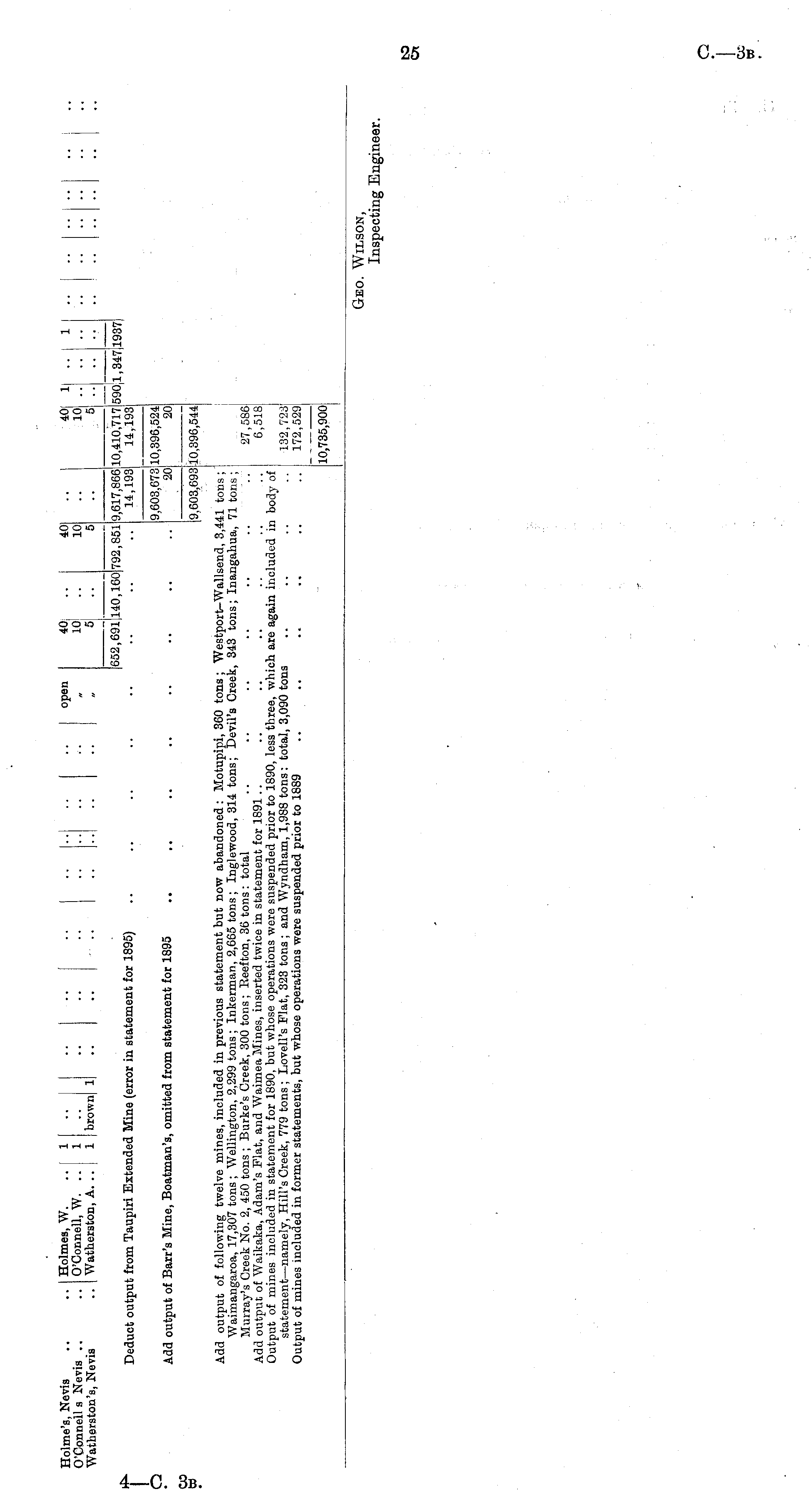 Holme'a, Nevis .. .. Holmes, W. .. 1 .. .. .. .. .. open 40 40 O'Connells Nevis .. .. O'Oonnell, W. .. 1 .. .. .. .. .. „ 10 10 Watherston's, Nevia .. Watherston, A. .. 1 brown 1 .. .. .. .. „ 5 .. 5 652,691140,160 792,851 Deduct output from Taupiri Extended Mine (error in statement for 1895) •• 40' 10 5 1 .. 1 590Jl, 3471937 9,617,866: 14,193 10,410'717 14,193 Add output of Barr's Mine, Boatman's, omitted from statement for 1895 9,603,673 20 10,396,524 20 9,603,693 10,396,544 Add output oJ following twelve mines, included in previous statement but now abandoned : Motupipi, 360 tons ; Westport-Wallsend, 3,4' Waimangaroa, 17,307 tons ; Wellington, 2,299 tons ; Inkerman, 2,665 tons ; Inglewood, 314 tons; Devil's Creek, 343 tons; Inangahua, Murray's Creek No. 2, 450 tons ; Burke's Creek, 300 tons ; Reefton, 36 tons : total Add output of Waikaka, Adam's Plat, and Waimea Mines, inserted twice in statement for 1891 Output of mines included in statement for 1890, but whose operations were suspended prior to 1890, less three, which are again included in statement —namely, Hill's Creek, 779 tons ; Lovell's Plat, 323 tons ; and Wyndham, 1,988 tons: total, 3,090 tons Output of mines included in former statements, but whose operations were suspended prior to 1889 41 tons; | 71 tons ; | 27,586 6,518 i body of 132,7231 172,529 10,735,900 Geo. Wilson, Inspecting Engineer.