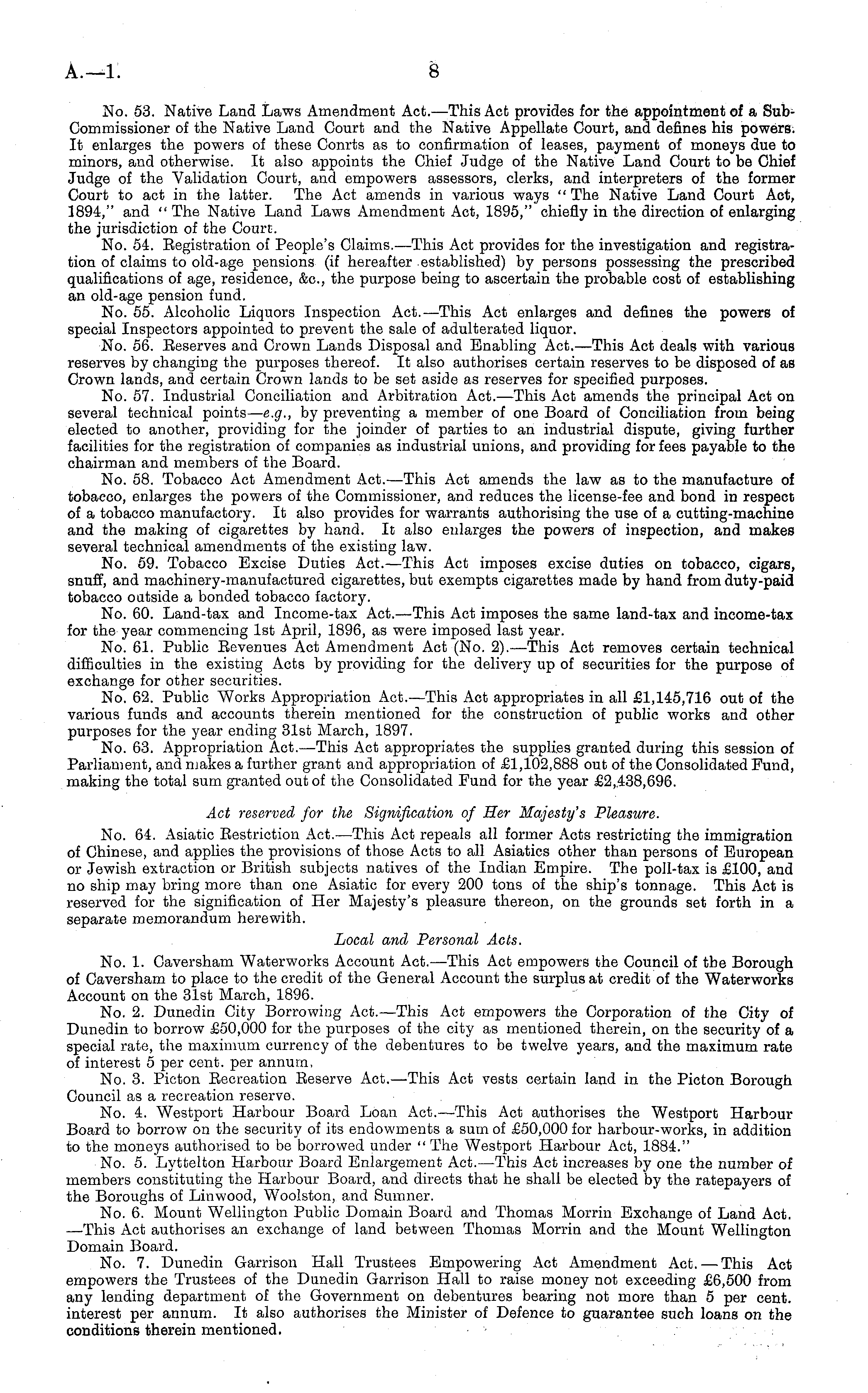 No. 53. Native Land Laws Amendment Act. —This Act provides for the appointment of a SubCommissioner of the Native Land Court and the Native Appellate Court, and defines his powers. It enlarges the powers of these Conrts as to confirmation of leases, payment of moneys due to minors, and otherwise. It also appoints the Chief Judge of the Native Land Court to be Chief Judge of the Validation Court, and empowers assessors, clerks, and interpreters of the former Court to act in the latter. The Act amends in various ways " The Native Land Court Act, 1894," and " The Native Land Laws Amendment Act, 1895," chiefly in the direction of enlarging the jurisdiction of the Court. No. 54. Eegistration of People's Claims.—This Act provides for the investigation and registration of claims to old-age pensions (if hereafter established) by persons possessing the prescribed qualifications of age, residence, &c, the purpose being to ascertain the probable cost of establishing an old-age pension fund. No. 55. Alcoholic Liquors Inspection Act.—This Act enlarges and defines the powers of special Inspectors appointed to prevent the sale of adulterated liquor. No. 56. Eeserves and Crown Lands Disposal and Enabling Act.—This Act deals with various reserves by changing the purposes thereof. It also authorises certain reserves to be disposed of as Crown lands, and certain Crown lands to be set aside as reserves for specified purposes. No. 57. Industrial Conciliation and Arbitration Act.—This Act amends the principal Act on several technical points— e.g., by preventing a member of one Board of Conciliation from being elected to another, providing for the joinder of parties to an industrial dispute, giving further facilities for the registration of companies as industrial unions, and providing for fees payable to the chairman and members of the Board. No. 58. Tobacco Act Amendment Act.—This Act amends the law as to the manufacture of tobacco, enlarges the powers of the Commissioner, and reduces the license-fee and bond in respect of a tobacco manufactory. It also provides for warrants authorising the use of a cutting-machine and the making of cigarettes by hand. It also enlarges the powers of inspection, and makes several technical amendments of the existing law. No. 59. Tobacco Excise Duties Act. —This Act imposes excise duties on tobacco, cigars, snuff, and machinery-manufactured cigarettes, but exempts cigarettes made by hand from duty-paid tobacco outside a bonded tobacco factory. No. 60. Land-tax and Income-tax Act.—This Act imposes the same land-tax and income-tax for the year commencing Ist April, 1896, as were imposed last year. No. 61. Public Eevenues Act Amendment Act (No. 2). —This Act removes certain technical difficulties in the existing Acts by providing for the delivery up of securities for the purpose of exchange for other securities. No. 62. Public Works Appropriation Act.—This Act appropriates in all £1,145,716 out of the various funds and accounts therein mentioned for the construction of public works and other purposes for the year ending 31st March, 1897. No. 63. Appropriation Act.—This Act appropriates the supplies granted during this session of Parliament, and makes a further grant and appropriation of £1,102,888 out of the Consolidated Fund, making the total sum granted out of the Consolidated Fund for the year £2,438,696. Act reserved for the Signification of Her Majesty's Pleasure. No. 64. Asiatic Eestriction Act.—This Act repeals all former Acts restricting the immigration of Chinese, and applies the provisions of those Acts to all Asiatics other than persons of European or Jewish extraction or British subjects natives of the Indian Empire. The poll-tax is £100, and no ship may bring more than one Asiatic for every 200 tons of the ship's tonnage. This Act is reserved for the signification of Her Majesty's pleasure thereon, on the grounds set forth in a separate memorandum herewith. Local and Personal Acts. No. 1. Caversham Waterworks Account Act.—This Act empowers the Council of the Borough of Caversham to place to the credit of the General Account the surplus at credit of the Waterworks Account on the 31st March, 1896. No. 2. Dunedin City Borrowing Act.—This Act empowers the Corporation of the City of Dunedin to borrow £50,000 for the purposes of the city as mentioned therein, on the security of a special rate, the maximum currency of the debentures to be twelve years, and the maximum rate of interest 5 per cent, per annum. No. 3. Picton Eecreation Eeserve Act.—This Act vests certain land in the Picton Borough Council as a recreation reserve. No. 4. Westport Harbour Board Loan Act.—This Act authorises the Westport Harbour Board to borrow on the security of its endowments a sum of £50,000 for harbour-works, in addition to the moneys authorised to be borrowed under " The Westport Harbour Act, 1884." No. 5. Lyttelton Harbour Board Enlargement Act.—This Act increases by one the number of members constituting the Harbour Board, and directs that he shall be elected by the ratepayers of the Boroughs of Linwood, Woolston, and Sumner. No. 6. Mount Wellington Public Domain Board and Thomas Morrin Exchange of Land Act. —This Act authorises an exchange of land between Thomas Morrin and the Mount Wellington Domain Board. No. 7. Dunedin Garrison Hall Trustees Empowering Act Amendment Act. — This Act empowers the Trustees of the Dunedin Garrison Hall to raise money not exceeding £6,500 from any lending department of the Government on debentures bearing not more than 5 per cent, interest per annum. It also authorises the Minister of Defence to guarantee such loans on the conditions therein mentioned. •