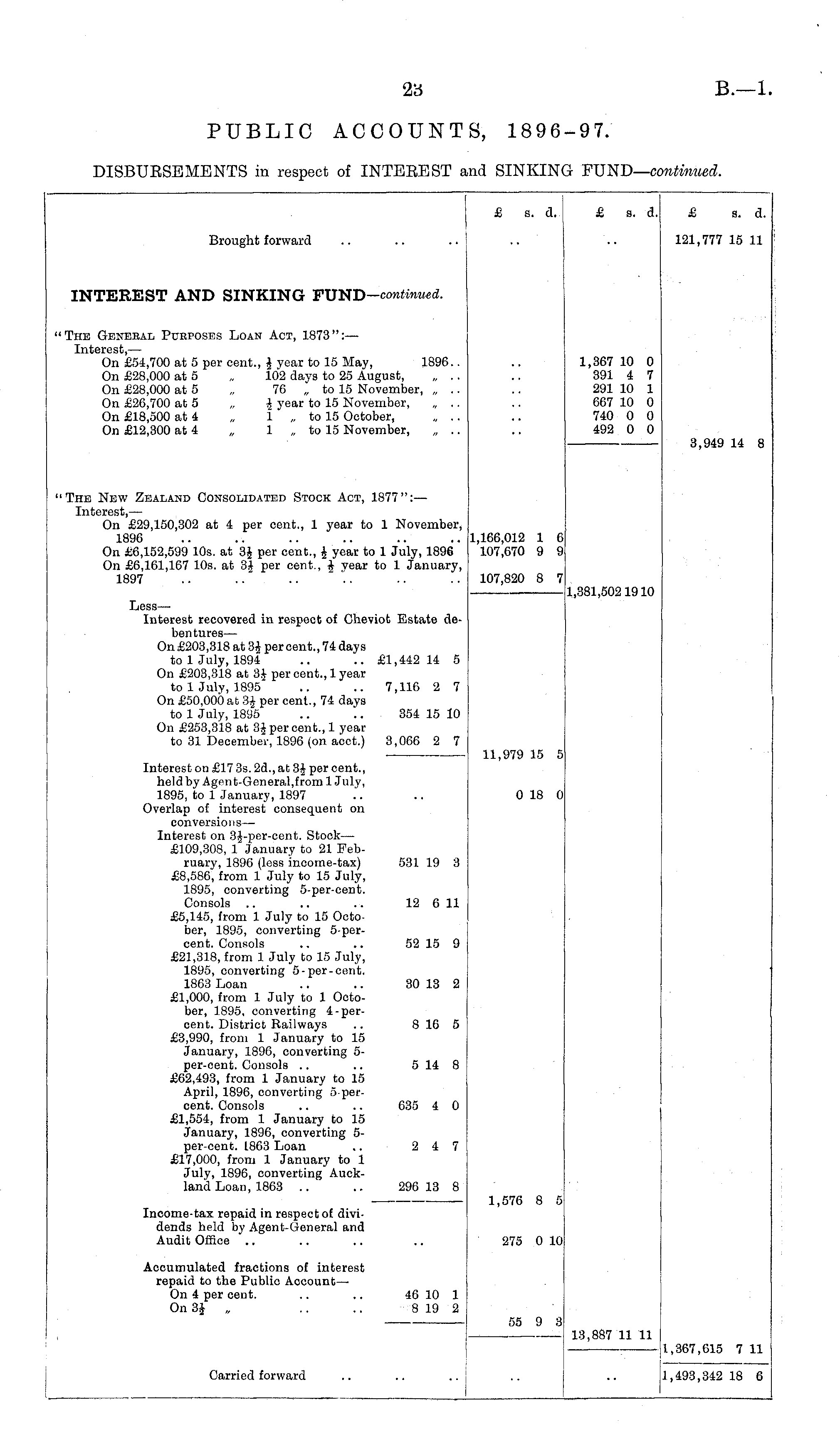£ s. d. £ s. d. £ s. d. Brought forward 121,777 15 11 INTEREST AND SINKING FUND -continued. : 'The Genebad Purposes Loan Act, 1873":— Interest, — On £54,700 at 5 per cent., J year to 15 May, 1896.. On £28,000 at 5 „ 102 days to 25 August, „ .. On £28,000 at 5 „ 76 , to 15 November, „ .. On £26,700 at 5 „ J year to 15 November, „ .. On £18,500 at 4 „ 1 „ to 15 October, „ .. On £12,300 at 4 „ 1 „ to 15 November, „ .. 1,367 10 0 391 4 7 291 10 1 667 10 0 740 0 0 492 0 0 3,949 14 8 "The New Zealand Consolidated Stock Act, 1877": — Interest, — On £29,150,302 at 4 per cent., 1 year to 1 November, 1896 On £6,152,599 10s. at 3J per cent., £ year to 1 July, 1896 On £6,161,167 10s. at 3J per cent., i vear to 1 January, 1897 1,166,012 1 6 107,670 9 9 107,820 8 7 Less— Interest recovered in respect of Cheviot Estate debentures — On £203,318 at 3£ percent., 74 days tol July, 1894 .. .. £1,442 14 5 On £203,318 at 8J per cent., 1 year tol July, 1895 .. .. 7,116 2 7 On £50,000 at 8$ per cent., 74 days to 1 July, 1895 .. .. 354 15 10 On £253,318 at 3J percent., 1 year to 31 December, 1896 (on acct.) 3,066 2 7 Interest on £17 3s. 2d., at 3J per cent., held by Agent-General,from 1 July, 1895, to 1 January, 1897 Overlap of interest consequent on conversions— Interest on 3J-per-cent. Stock — £109,308, 1 January to 21 February, 1896 (less income-tax) 531 19 3 £8,586'; from 1 July to 15 July, 1895, converting 5-per-cent. Consols .. .. .. 12 6 11 £5,145, from 1 July to 15 October, 1895, converting 5-per-cent. Consols .. .. 52 15 9 £21,318, from 1 July to 15 July, 1895, converting 5-per-cent. 1863 Loan .. .. 30 13 2 £1,000, from 1 July to 1 October, 1895, converting 4-per-cent. District Railways .. 8 16 5 £3,990, from 1 January to 15 January, 1896, converting 5-per-cent. Consols .. .. 5 14 8 £62,493, from 1 January to 15 April, 1896, converting 5-per-cent. Consols .. .. 635 4 0 £1,554, from 1 January to 15 January, 1896, converting 5-per-cent. 1863 Loan .. 2 4 7 £17,000, from 1 January to 1 July, 1896, converting Auckland Loan, 1863 .. .. 296 13 8 11,979 15 5 0 18 0 Income-tax repaid in respect of dividends held by Agent-General and Audit Office Accumulated fractions of interest repaid to the Public AccountOn 4 per cent. .. .. 46 10 1 On 3J „ .. .. 8 19 2 1,576 8 5 275 0 10 1,367,615 7 11 55 9 3 13,887 11 11 Carried forward •• 1,493,342 18 6