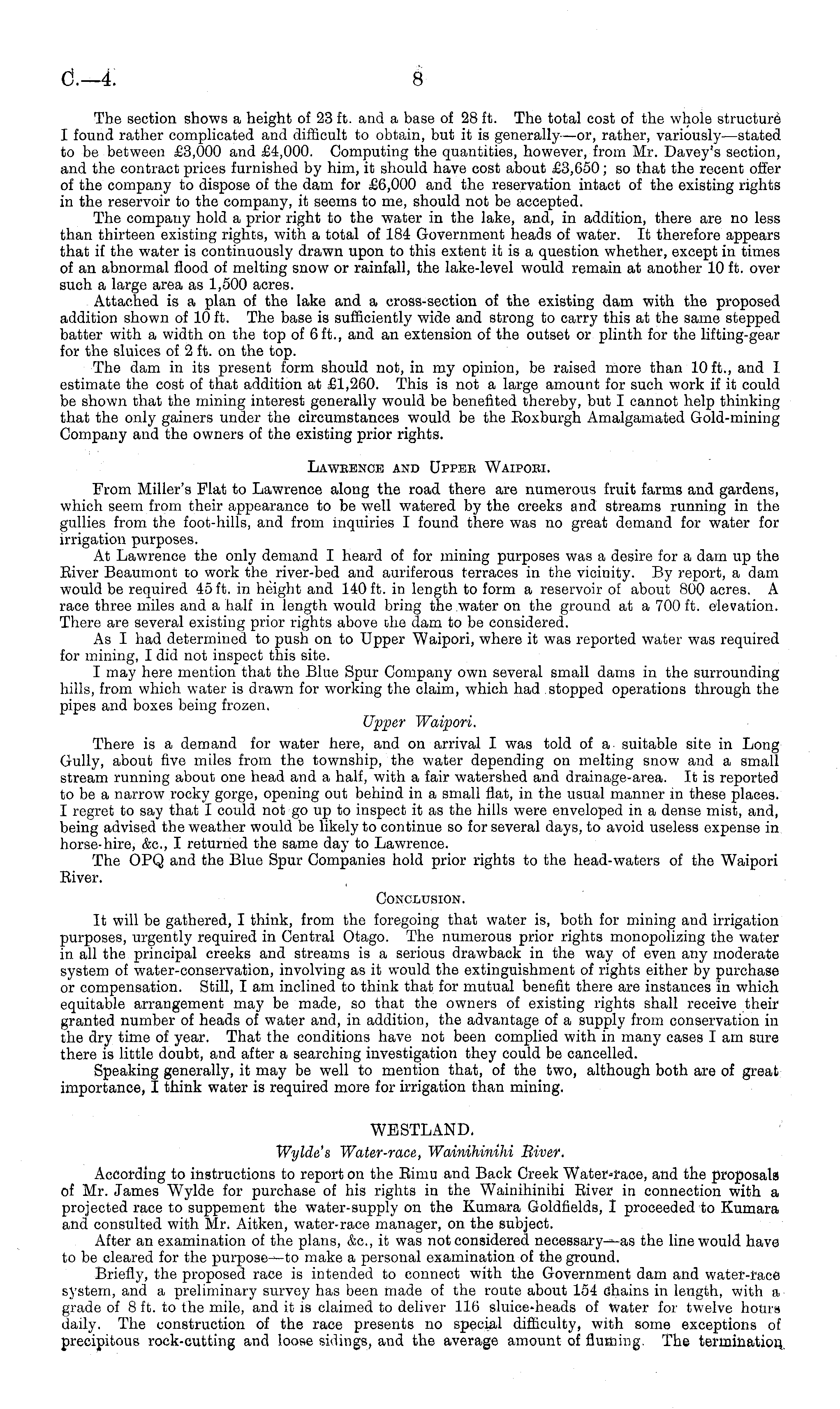 The section shows a height of 23 ft. and a base of 28 ft. The total cost of the whole structure I found rather complicated and difficult to obtain, but it is generally—or, rather, variously—stated to be between £3,000 and £4,000. Computing the quantities, however, from Mr. Davey's section, and the contract prices furnished by him, it should have cost about £3,650; so that the recent offer of the company to dispose of the dam for £6,000 and the reservation intact of the existing rights in the reservoir to the company, it seems to me, should not be accepted. The company hold a prior right to the water in the lake, and, in addition, there are no less than thirteen existing rights, with a total of 184 Government heads of water. It therefore appears that if the water is continuously drawn upon to this extent it is a question whether, except in times of an abnormal flood of melting snow or rainfall, the lake-level would remain at another 10 ft. over such a large area as 1,500 acres. Attached is a plan of the lake and a cross-section of the existing dam with the proposed addition shown of 10 ft. The base is sufficiently wide and strong to carry this at the same stepped batter with a width on the top of 6 ft., and an extension of the outset or plinth for the lifting-gear for the sluices of 2 ft. on the top. The dam in its present form should not, in my opinion, be raised more than 10 ft., and I estimate the cost of that addition at £1,260. This is not a large amount for such work if it could be shown that the mining interest generally would be benefited thereby, but I cannot help thinking that the only gainers under the circumstances would be the Eoxburgh Amalgamated Gold-mining Company and the owners of the existing prior rights. Laweence and Upper Waipoei. Prom Miller's Flat to Lawrence along the road there are numerous fruit farms and gardens, which seem from their appearance to be well watered by the creeks and streams running in the gullies from the foot-hills, and from inquiries I found there was no great demand for water for irrigation purposes. At Lawrence the only demand I heard of for mining purposes was a desire for a dam up the Eiver Beaumont to work the river-bed and auriferous terraces in the vicinity. By report, a dam would be required 45 ft. in height and 140 ft. in length to form a reservoir of about 800 acres. A race three miles and a half in length would bring the water on the ground at a 700 ft. elevation. There are several existing prior rights above the dam to be considered. As I had determined to push on to Upper Waipori, where it was reported water was required for mining, I did not inspect this site. I may here mention that the Blue Spur Company own several small dams in the surrounding hills, from which water is drawn for working the claim, which had stopped operations through the pipes and boxes being frozen. Upper Waipori. There is a demand for water here, and on arrival I was told of a suitable site in Long Gully, about five miles from the township, the water depending on melting snow and a small stream running about one head and a half, with a fair watershed and drainage-area. It is reported to be a narrow rocky gorge, opening out behind in a small flat, in the usual manner in these places. I regret to say that I could not go up to inspect it as the hills were enveloped in a dense mist, and, being advised the weather would be likely to continue so for several days, to avoid useless expense in horse-hire, &c, I returned the same day to Lawrence. The OPQ and the Blue Spur Companies hold prior rights to the head-waters of the Waipori Eiver. Conclusion. It will be gathered, I think, from the foregoing that water is, both for mining and irrigation purposes, urgently required in Central Otago. The numerous prior rights monopolizing the water in all the principal creeks and streams is a serious drawback in the way of even any moderate system of water-conservation, involving as it would the extinguishment of rights either by purchase or compensation. Still, lam inclined to think that for mutual benefit there are instances in which equitable arrangement may be made, so that the owners of existing rights shall receive their granted number of heads of water and, in addition, the advantage of a supply from conservation in the dry time of year. That the conditions have not been complied with in many cases lam sure there is little doubt, and after a searching investigation they could be cancelled. Speaking generally, it may be well to mention that, of the two, although both are of great importance, I think water is required more for irrigation than mining. WESTLAND. Wylde's Water-race, Wainihinihi River. According to instructions to report on the Eimu and Back Creek and the proposals of Mr. James Wylde for purchase of his rights in the Wainihinihi River in connection with a projected race to suppement the water-supply on the Kumara Goldfields, I proceeded to Kumara and consulted with Mr. Aitken, water-race manager, on the subject. After an examination of the plans, &c, it was not considered necessary---as the line would have to be cleared for the purpose —to make a personal examination of the ground. Briefly, the proposed race is intended to connect with the Government dam and water-race system, and a preliminary survey has been made of the route about 154 chains in length, with a grade of 8 ft. to the mile, and it is claimed to deliver 116 sluice-heads of Water for twelve hours daily. The construction of the race presents no special difficulty, with some exceptions of precipitous rock-cutting and loose sidings, and the average amount of fluaing. The termination..