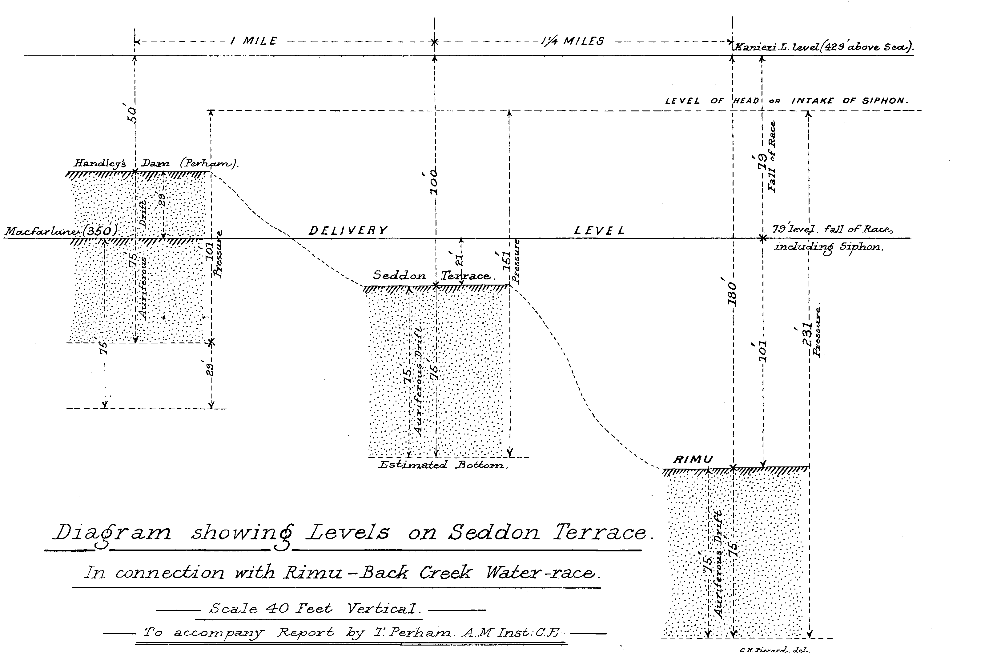 Diagram showing Levels on Seddon Terrace. In connection, with Rimu-Back Creek Water-race.