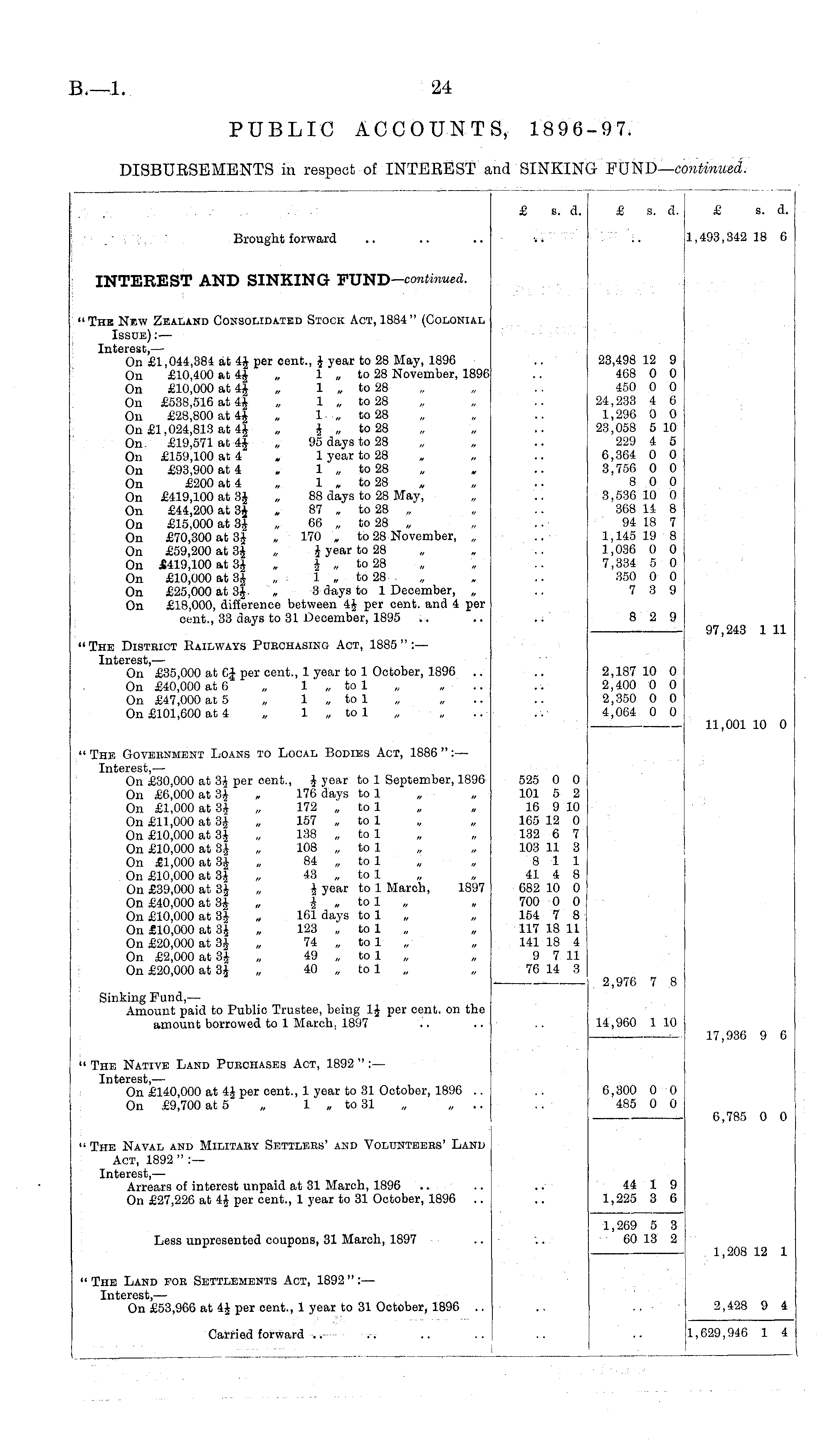 £ s. d. £ s. d. £ s. d. Brought forward V » 1,493,342 18 6 INTEREST AND SINKING FUND- -continued. " The New Zealand Consolidated Stock Act, 1884" (Colonial Issue) :— Interest, — On £1,044,384 at 4J per cent., 4 year to 28 May, 1896 On £10,400 at 4| „ 1 ,, to 28 November, 1896 On £10,000 at 4J „ 1 „ to 28 On £538,516 at 4J „ 1 „ to 28 On £28,800 at 4| „ 1 „ to 28 On £1,024,813 at 4| „ 4 „ to 28 On £19,571 at 4| „ 95 days to 28 On £159,100 at 4 . 1 year to 28 On £93,900 at 4 „ 1 „ to 28 On £200 at 4 „ 1 „ to 28 On £419,100 at 3J „ 88 days to 28 May, On £44,200 at 3J „ 87 „ to 28 „ On £15,000 at 3J „ 66 „ to 28 „ On £70,300 at 34 » 170 » to 28 November, „ On £59,200 at 34 „ i year to 28 On J8419.100 at 3| „ J „ to 28 On £10,000 at 3| „ 1 „ to 28 On £25,000 at 3| „ 3 days to 1 December, „ On £18,000, difference between 4J per cent, and 4 per cent., 33 days to 31 December, 1895 23,498 12 9 468 0 0 450 0 0 24,233 4 6 1,296 0 0 23,058 5 10 229 4 5 6,364 0 0 3,756 0 0 8 0 0 3,536 10 0 368 14 8 94 18 7 1,145 19 8 1,036 0 0 7,334 5 0 350 0 0 7 3 9 8 2 9 "The District Railways Purchasing Act, 1885":— Interest, — On £35,000 at 6J per cent., 1 year to 1 October, 1896 .. On £40,000 at 6 „ 1 „ to 1 On £47,000 at 5 „ 1 „ to 1 On £101,600 at 4 „ 1 „ to 1 97,243 1 11 2,187 10 0 2,400 0 0 2,350 0 0 4,064 0 0 11,001 10 0 " The Government Loans to Local Bodies Act, 1886 ":— Interest, — On £30,000 at o\ per cent., J year to 1 September, 1896 On £6,000 at 3J „ 176 days to 1 On £1,000 at 34 „ 172 „ to 1 On £11,000 at 3J „ 157 „ tol On £10,000 at 3J „ 138 „ to 1 On £10,000 at 3J „ 108 „ to 1 On £1,000 at 3| „ 84 „ to 1 „ On £10,000 at 34 „ 43 „ to 1 On £39,000 at 34 „ 4 year to 1 March, 1897 On £40,000 at 3| „ 4 „ to 1 On £10,000 at 34 „ 161 days to 1 On £10,000 at 34 „ 123 „ to 1 „ On £20,000 at 34 „ 74 „ to 1 On £2,000 at 34 „ 49 „ to 1 On £20,000 at 3| „ 40 „ to 1 525 0 0 101 5 2 16 9 10 165 12 0 132 6 7 103 11 3 8 11 41 4 8 682 10 0 700 0 0 154 7 8 117 18 11 141 18 4 9 7 11 76 14 3 2,976 7 8 Sinking Fund, — Amount paid to Public Trustee, being 14 per cent, on the amount borrowed to 1 March, 1897 14,960 1 10 " The Native Land Pubchases Act, 1892 " :— Interest, — On £140,000 at 44 per cent., 1 year to 31 October, 1896 .. On £9,700 at 5 „ 1 „ to 31 „ „ .. 17,936 9 6 6,300 0 0 485 0 0 6,785 0 0 " The Naval and Military Settlers' and Volunteers' Land Act, 1892 " :— Interest, — Arrears of interest unpaid at 31 March, 1896 On £27,226 at 44 per cent., 1 year to 31 October, 1896 .. 44 1 9 1,225 3 6 1,269 5 3 60 13 2 Less unpresented coupons, 31 March, 1897 "The Land for Settlements Act, 1892": — Interest, — On £53,966 at 44 per cent., 1 year to 31 October, 1896 .. 1,208 12 1 2,428 9 4 Carried forward ..— 1,629,946 1 4
