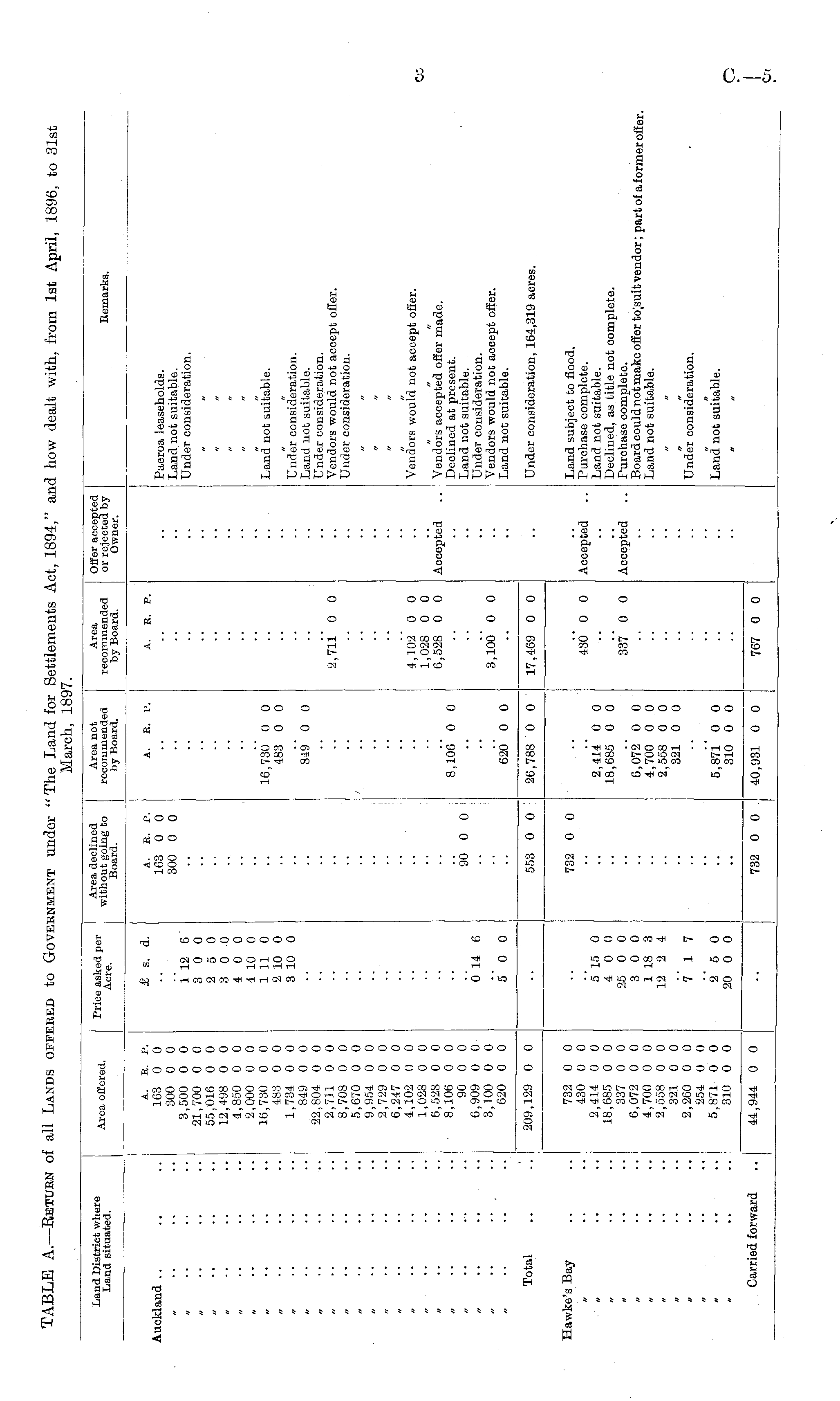 Land District where Land situated. Area offered. Price asked per Acre. Area declined without going to Board. Area not recommended by Board. Area recommended by Board. Offer accepted or rejected by Owner. Eemarks. Auckland A. e. p. 163 0 0 300 0 0 3,500 0 0 21,700 0 0 55,016 0 0 12,498 0 0 4,850 0 0 2,000 0 0 16,730 0 0 483 0 0 1,734 0 0 849 0 0 22,804 0 0 2,711 0 0 8,708 0 0 5,670 0 0 9,954 0 0 2,729 0 0 6,247 0 0 4,102 0 0 1,028 0 0 6,528 0 0 8,106 0 0 90 0 0 6,909 0 0 3,100 0 0 620 0 0 £ s. d. 1 12 6' 3 0 0 2 5 0 3 0 0 4 0 0 4 10 0 1 11 0 2 10 0 3 10 0 A. B. P. 163 0 0 300 0 0 A. B. P. 16,730 0 0 483 0 0 849 0 0 A. E. P. 2,711 0 0 Paeroa leaseholds. Land not suitable. Under consideration. Land not suitable. Under consideration. Land not suitable. Under consideration. Vendors would not accept offer. Under consideration. - • \> ■■ ; i : 4,102 0 0 1,028 0 0 6,528 0 0 Vendors would not accept offer. " 8,106 0 0 Accepted Vendors accepted offer made. Declined at present. Land not suitable. Under consideration. Vendors would not accept offer. Land not suitable. 0 14 6 90 0 0 ' 5 0 0 620 0 0 3,100 0 0 - Total 209,129 0 0 553 0 0 26,788 0 0 17,469 0 0 Under consideration, 164,319 acres. Hawke's Bay 732 0 0 430 0 0 2,414 0 0 18,685 0 0 337 0 0 6,072 0 0 4,700 0 0 2,558 0 0 321 0 0 2,260 0 0 254 0 0 5,871 0 0 310 0 0 732 0 0 430' 0 0 Accepted Land subject to flood. Purchase complete. Land not suitable. Declined, as title not complete. Purchase complete. Board could not make offer vendor; part of a former offer. Land not suitable. 5 15 0 4 0 0 25 0 0 3 0 0 1 18 3 12 2 4 2,414 0 0 18,685 0 0 6,072 0 0 4,700 0 0 2,558 0 0 321 0 0 337' 0 0 Accepted 7 17 Under consideration. 2 5 0 20 0 0 5,87l' 0 0 310 0 0 Land not suitable. Carried forward 44,944 0 0 732 0 0 . • • 40,931 0 0 767 0 0