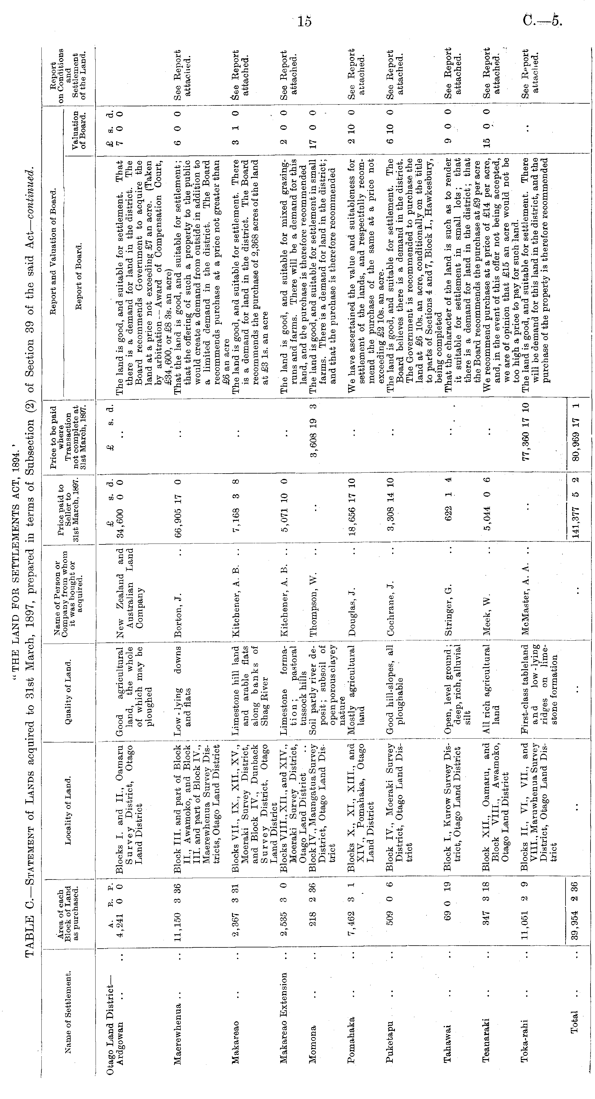 Price to be paid Report and Valuation of Board. Report on Conditions and Settlement of the Land. Name of Settlement. Area of each Block of Land as purchased. Locality of Land. Quality of Land. Name of Person or Company from whom it was bought or acquired. Price paid to Seller to 31st March, 1897. Transaction not complete at 31st March, 1897. Report of Board. Valuation of Board. Otago Land District — Ardgowan A. R. P. 4,241 0 0 Blocks I. and II., Oamaru Survey District, Otago Land District £ s. d. Good agricultural New Zealand and 34,600 0 0 land, the whole Australian Land of which may be Company ploughed £ s. d. The land is good, and suitable for settlement. That there is a demand for land in the district. The Board recommends Government to acquire the land at a price not exceeding £7 an acre. (Taken by arbitration — Award of Compensation Court, £34,600, or £8 3s. an acre) That the land is good, and suitable for settlement; that the offering of such a property to the public would create a demand from outside in addition to a limited demand in the district. The Board recommends purchase at a price not greater than £6 an acre The land is good, and suitable for settlement. There is a demand for land in the district. The Board recommends the purchase of 2,368 acres of the land at £3 Is. an acre £ s. d. 7 0 0 Maerewhenua .. 11,150 3 36 Block III. and part of Block II., Awamoko, and Block III. and part of Block IV., Maerewhenua Survey Districts, Otago Land District Low-lying downs Borton, J. .. 66,905 17 0 and flats 6 0 0 See Report attached. Makareao 2,367 3 31 Blocks VII., IX., XII., XV., Moeraki Survey District, and Block IV., Dunback Survey District, Otago Land District Blocks VIII., XII., and XIV., Moeraki Survey District, Otago Land District Block IV., Maungatua Survey District, Otago Land District Limestone hill land Kitchener, A. B. .. 7,168 3 8 and arable flats along banks of Shag River 3 10 See Report attached. Makareao Extension 2,535 3 0 Limestone forma- Kitchener, A. B. .. 5,071 10 0 tion ; pastoral tussock hills Soil partly river de- Thompson, W. posit; subsoil of open porous clayey nature Mostly agricultural Douglas, J. .. 18,656 17 10 land The land is good, and suitable for mixed grazingruns and farms. There will be a demand for this land, and the purchase is therefore recommended The land is good, and suitable for settlement in small farms. There is a demand for land in the district; and that the purchase is therefore recommended 2 0 0 See Report attached. Momona 218 2 36 3,608 19 3 17 0 0 Pomahaka 7,462 3 1 Blocks X„ XL, XIII., and XIV., Pomahaka, Otago Land District We have ascertained the value and suitableness for settlement of the lands, and respectfully recommend the purchase of the same at a price not exceeding £2 10s. an acre. The land is good, and suitable for settlement. The Board believes there is a demand in the district. The Government is recommended to purchase the land at £6 10s. an acre, conditionally on the title to parts of Sections 4 and 7, Block I., Hawkesbury, being completed That the character of the land is such as to render it suitable for settlement in small lots; that there is a demand for land in the district; that the Board recommends the purchase at £9 per acre We recommend purchase at a price of £14 per acre, and, in the eyent of this offer not being accepted, we are of opinion that £15 an acre would not be too high a price to pay for such land. The land is good, and suitable for settlement. There will be demand for this land in the district, and the purchase of the property is therefore recommended 2 10 0 See Report attached. Puketapu 509 0 6 Block IV., Moeraki Survey District, Otago Land District Good hill-slopes, all Cochrane, J. .. 3,308 14 10 ploughable 6 10 0 See Report attached. I Tahawai 69 0 19 Block I., Kurow Survey District, Otago Land District Open, level ground ; ; Stringer, G. .. 622 1 4 deep, rich, alluvial ' silt See Report attached. 9 0 0 Teanaraki 347 3 18 Block XII., Oamaru, and Block VIII., Awamoko, Otago Land District All rich agricultural Meek, W. .. 5,044 0 6 land 15 0 0 See Report attached. Toka-rahi 11,051 2 9 Blocks II., VI., VII., and VIII., Maruwhenua Survey District, Otago Land District Pirst-class tableland McMaster, A. A. .. and low-lying ridges on limestone formation 77,360 17 10 See Rpport attached. Total .. 39,954 2 36 r ,. . 141,377 5 2 141,377 5 2 80,969 17 1