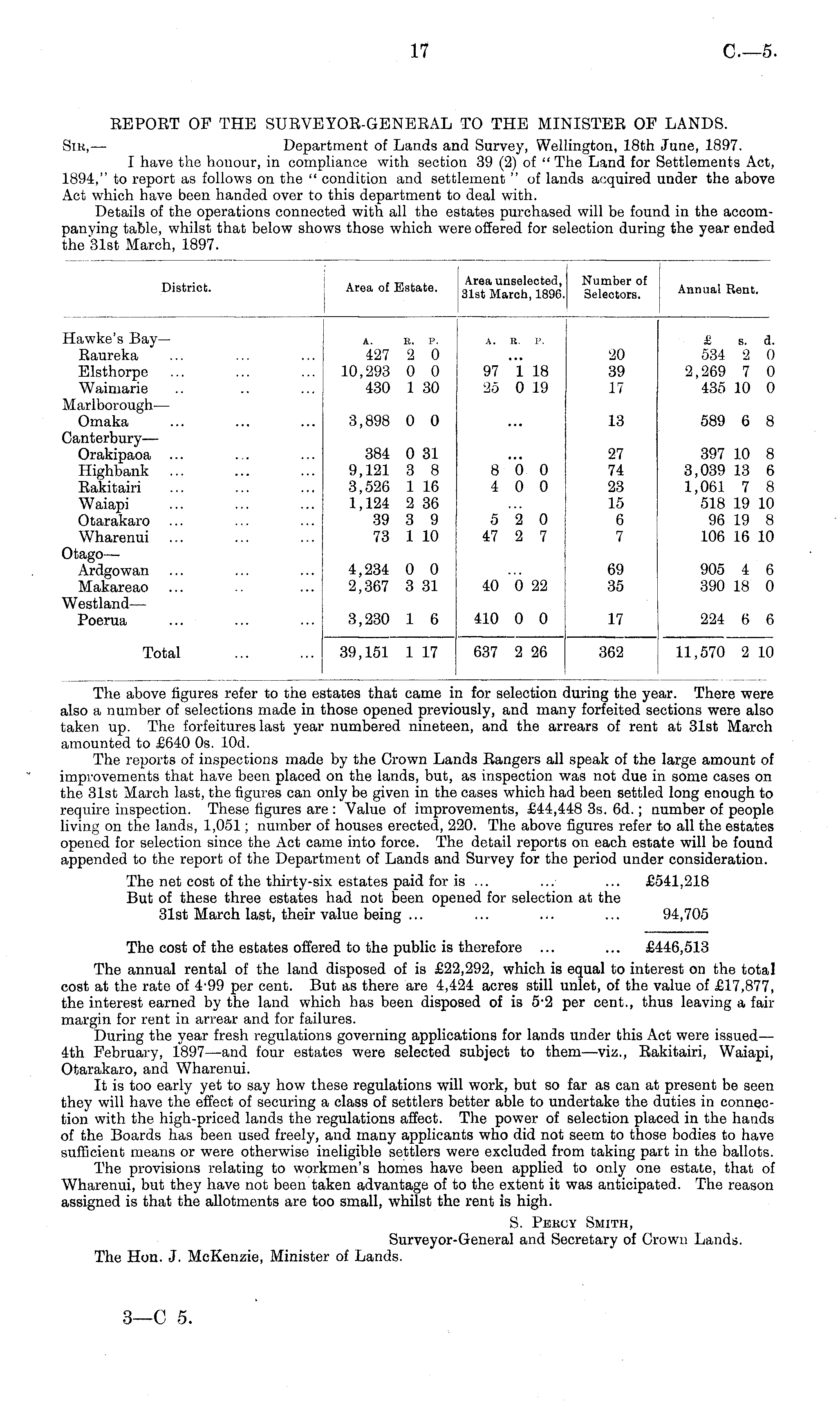 The above figures refer to the estates that came in for selection during the year. There were also a number of selections made in those opened previously, and many forfeited sections were also taken up. The forfeitures last year numbered nineteen, and the arrears of rent at 31st March amounted to £640 os. lOd. The reports of inspections made by the Crown Lands Eangers all speak of the large amount of improvements that have been placed on the lands, but, as inspection was not due in some cases on the 31st March last, the figures can only be given in the cases which had been settled long enough to require inspection. These figures are : Value of improvements, £44,448 3s. 6d.; number of people living on the lands, 1,051; number of houses erected, 220. The above figures refer to all the estates opened for selection since the Act came into force. The detail reports on each estate will be found appended to the report of the Department of Lands and Survey for the period under consideration. The net cost of the thirty-six estates paid for is ... ... ... £541,218 But of these three estates had not been opened for selection at the 31st March last, their value being ... ... ... ... 94,705 The cost of the estates offered to the public is therefore ... ... £446,513 The annual rental of the land disposed of is £22,292, which is equal to interest on the total cost at the rate of 4-99 per cent. But as there are 4,424 acres still unlet, of the value of £17,877, the interest earned by the land which has been disposed of is 52 per cent., thus leaving a fair margin for rent in arrear and for failures. During the year fresh regulations governing applications for lands under this Act were issued— 4th February, 1897—and four estates were selected subject to them—viz., Eakitairi, Waiapi, Otarakaro, and Wharenui. It is too early yet to say how these regulations will work, but so far as can at present be seen they will have the effect of securing a class of settlers better able to undertake the duties in connection with the high-priced lands the regulations affect. The power of selection placed in the hands of the Boards has been used freely, and many applicants who did not seem to those bodies to have sufficient means or were otherwise ineligible settlers were excluded from taking part in the ballots. The provisions relating to workmen's homes have been applied to only one estate, that of Wharenui, but they have not been taken advantage of to the extent it was anticipated. The reason assigned is that the allotments are too small, whilst the rent is high. S. Percy Smith, Surveyor-General and Secretary of Crown Lands. The Hon. J. McKenzie, Minister of Lands.