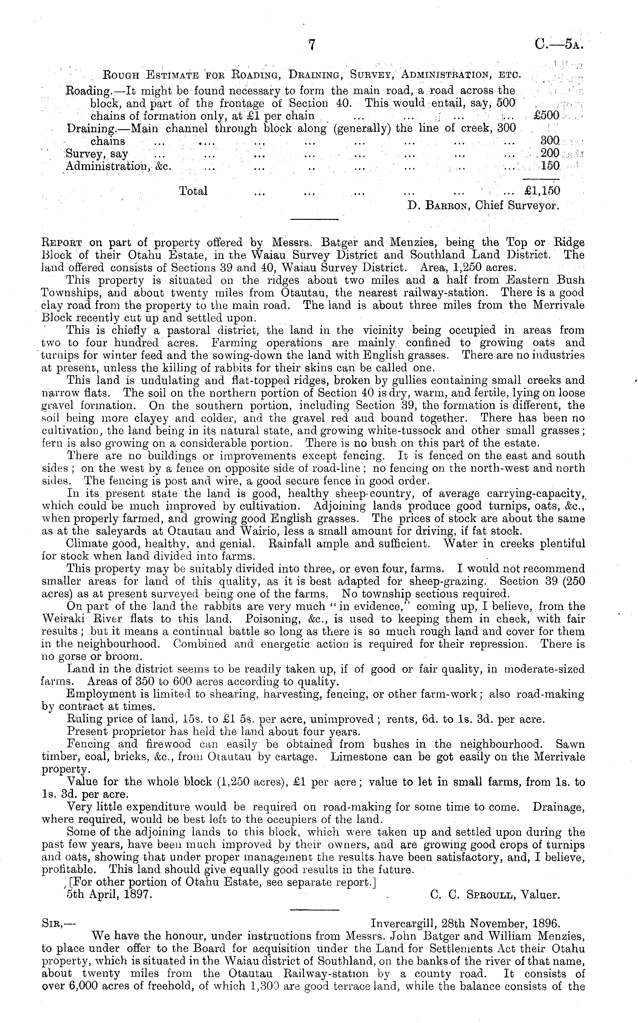 Sib,— Invercargill, 28th November, 1896. We have the honour, under instructions from Messrs. John Batger and William Menzies, to place under offer to the Board for acquisition under the Land for Settlements Act their Otahu property, which is situated in the Waiau district of Southland, on the banks of the river of that name, about twenty miles from the Otautau Eailway-station by a county road. It consists of over 6,000 acres of freehold, of which 1,300 are good ten-ace land, while the balance consists of the