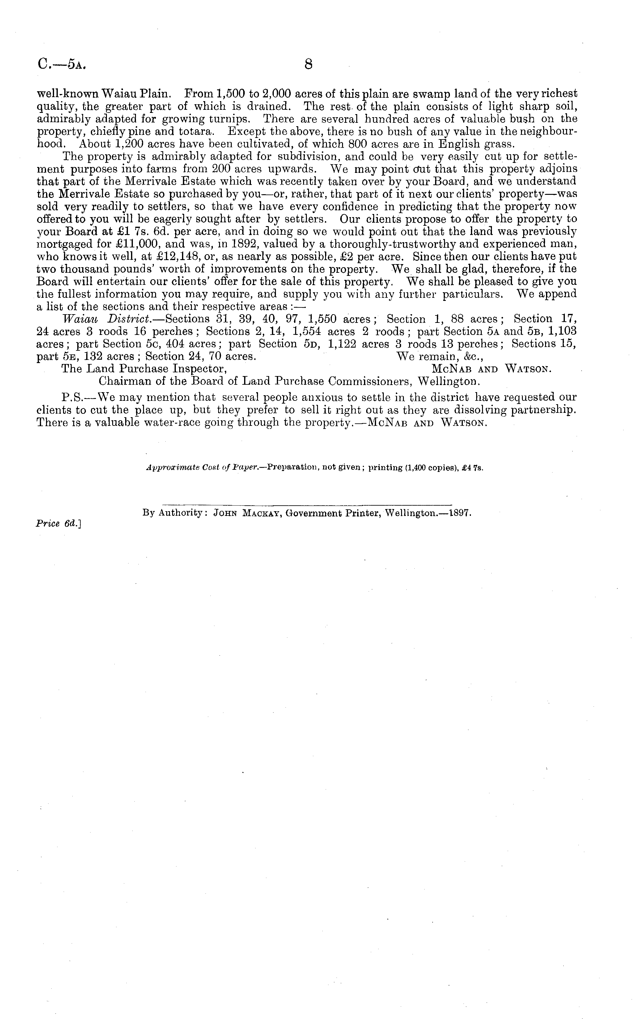 well-known Waiau Plain. Prom 1,500 to 2,000 acres of this plain are swamp land of the very richest quality, the greater part of which is drained. The rest of the plain consists of light sharp soil, admirably adapted for growing turnips. There are several hundred acres of valuable bush on the property, chiefly pine and totara. Except the above, there is no bush of any value in the neighbourhood. About 1,200 acres have been cultivated, of which 800 acres are in English grass. The property is admirably adapted for subdivision, and could be very easily cut up for settlement purposes into farms from 200 acres upwards. We may point out that this property adjoins that part of the Merrivale Estate which was recently taken over by your Board, and we understand the Merrivale Estate so purchased by you—or, rather, that part of it next our clients' property—was sold very readily to settlers, so that we have every confidence in predicting that the property now offered to you will be eagerly sought after by settlers. Our clients propose to offer the property to your Board at £1 7s. 6d. per acre, and in doing so we would point out that the land was previously mortgaged for £11,000, and was, in 1892, valued by a thoroughly-trustworthy and experienced man, who knows it well, at £12,148, or, as nearly as possible, £2 per acre. Since then our clients have put two thousand pounds' worth of improvements on the property. We shall be glad, therefore, if the Board will entertain our clients' offer for the sale of this property. We shall be pleased to give you the fullest information you may require, and supply you with any further particulars. We append a list of the sections and their respective areas : — Waiau District. —Sections 31, 39, 40, 97, 1,550 acres ; Section 1, 88 acres; Section 17, 24 acres 3 roods 16 perches; Sections 2, 14, 1,554 acres 2 roods ; part Section 5a and sb, 1,103 acres; part Section sc, 404 acres; part Section sd, 1,122 acres 3 roods 13 perches; Sections 15, part sb, 132 acres ; Section 24, 70 acres. We remain, &c, The Land Purchase Inspector, McNab and Watson. Chairman of the Board of Land Purchase Commissioners, Wellington. P.S. —We may mention that several people anxious to settle in the district have requested our clients to cut the place up, but they prefer to sell it right out as they are dissolving partnership. There is a valuable water-race going through the property.—MoNab and Watson. Apjjroximate Cost of Paper.— Preparation, not given ; printing (1,400 copies), £i 7s.