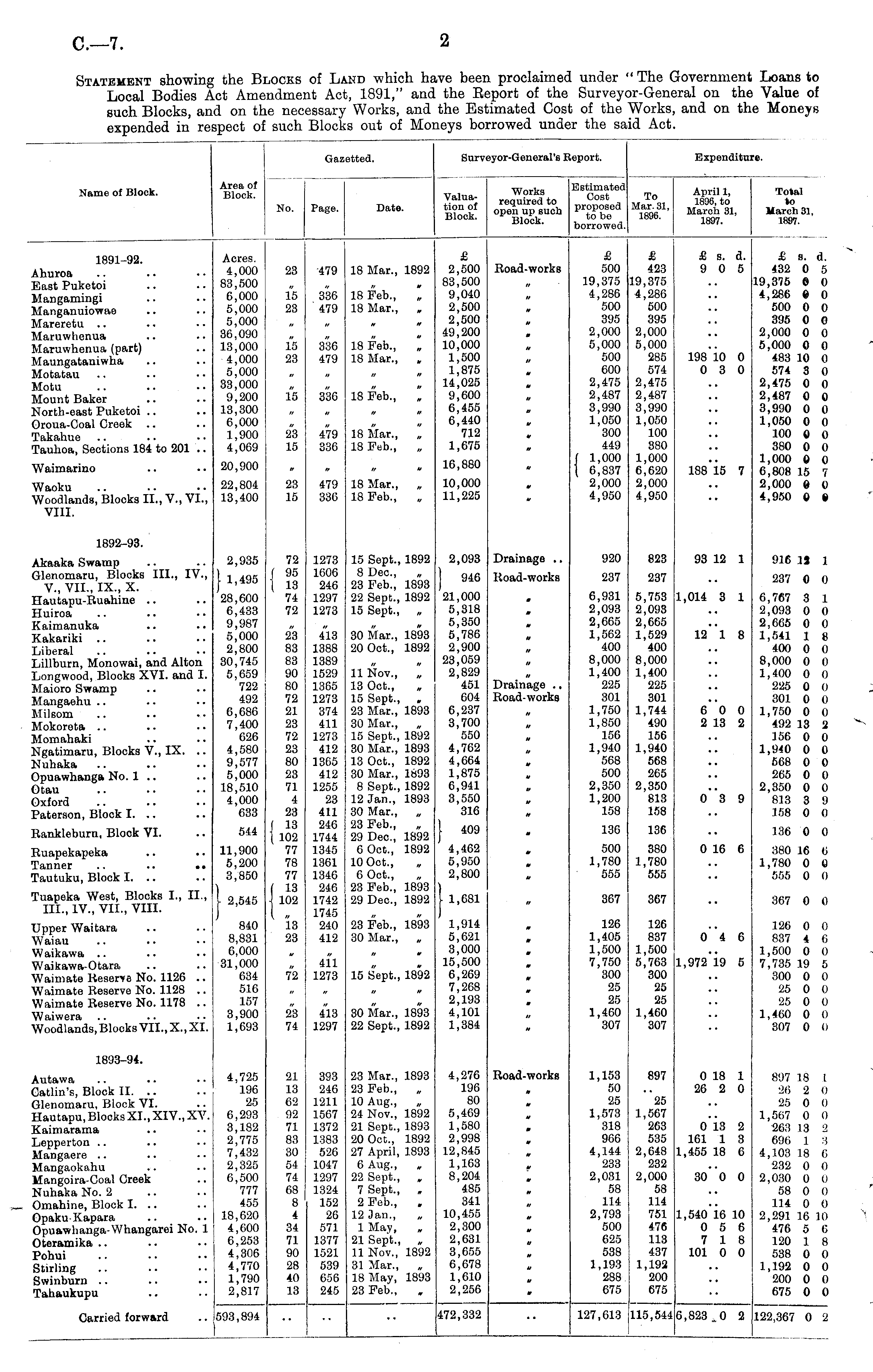 Statement showing the Blocks of Land which have been proclaimed under "The Government Loans to Local Bodies Act Amendment Act, 1891," and the Report of the Surveyor-General on the Value of such Blocks, and on the necessary Works, and the Estimated Cost of the Works, and on the Moneys expended in respect of such Blocks out of Moneys borrowed under the said Act.