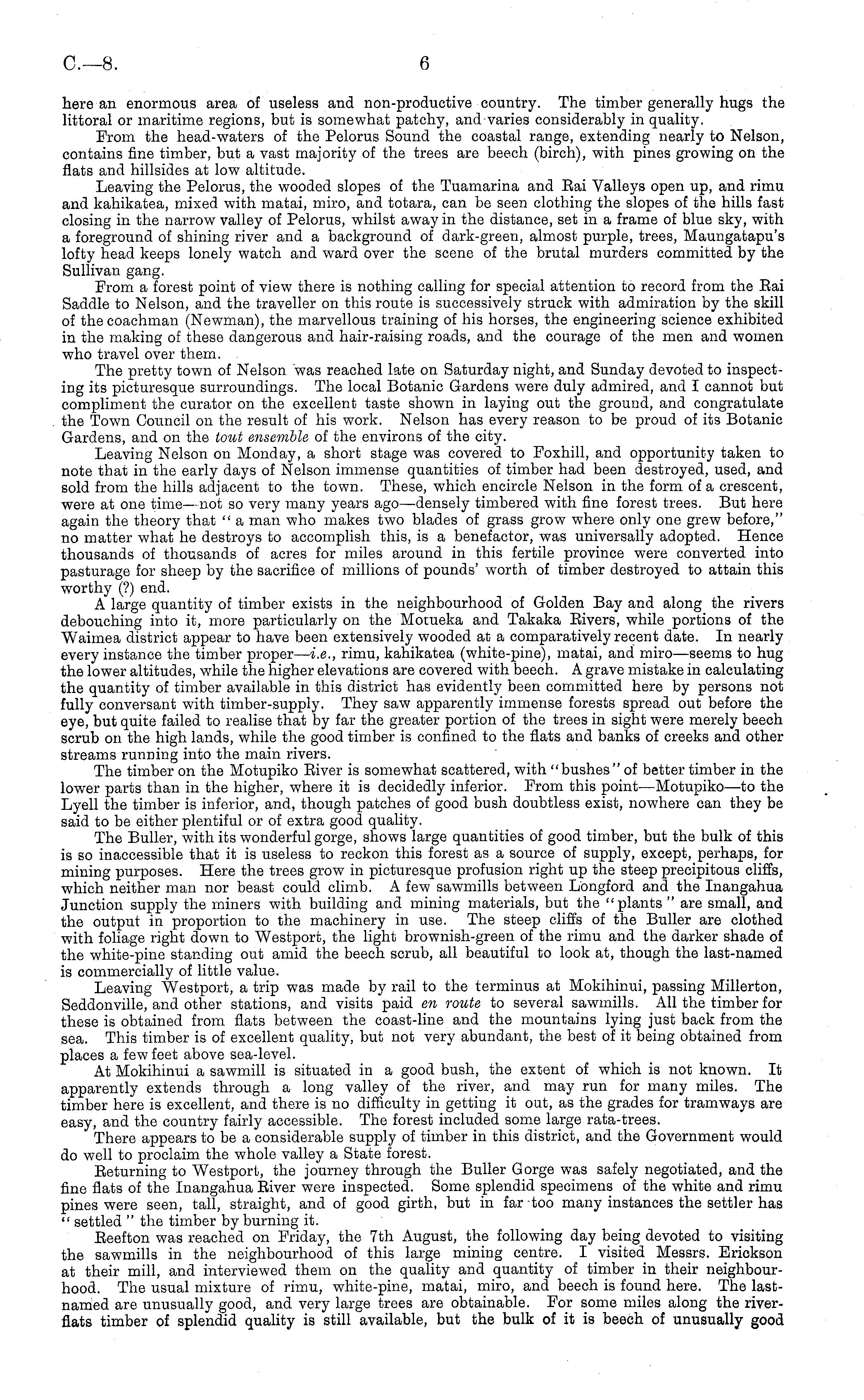 here an enormous area of useless and non-productive country. The timber generally hugs the littoral or maritime regions, but is somewhat patchy, and varies considerably in quality. From the head-waters of the Pelorus Sound the coastal range, extending nearly to Nelson, contains fine timber, but a vast majority of the trees are beech (birch), with pines growing on the flats and hillsides at low altitude. Leaving the Pelorus, the wooded slopes of the Tuamarina and Eai Valleys open up, and rimu and kahikatea, mixed with matai, miro, and totara, can be seen clothing the slopes of the hills fast closing in the narrow valley of Pelorus, whilst away in the distance, set in a frame of blue sky, with a foreground of shining river and a background of dark-green, almost purple, trees, Maungatapu's lofty head keeps lonely watch and ward over the scene of the brutal murders committed by the Sullivan gang. From a forest point of view there is nothing calling for special attention to record from the Eai Saddle to Nelson, and the traveller on this route is successively struck with admiration by the skill of the coachman (Newman), the marvellous training of his horses, the engineering science exhibited in the making of these dangerous and hair-raising roads, and the courage of the men and women who travel over them. The pretty town of Nelson was reached late on Saturday night, and Sunday devoted to inspecting its picturesque surroundings. The local Botanic Gardens were duly admired, and I cannot but compliment the curator on the excellent taste shown in laying out the ground, and congratulate the Town Council on the result of his work. Nelson has every reason to be proud of its Botanic Gardens, and on the tout ensemble of the environs of the city. Leaving Nelson on Monday, a short stage was covered to Foxhill, and opportunity taken to note that in the early days of Nelson immense quantities of timber had been destroyed, used, and sold from the hills adjacent to the town. These, which encircle Nelson in the form of a crescent, were at one time —not so very many years ago—densely timbered with fine forest trees. But here again the theory that " a man who makes two blades of grass grow where only one grew before," no matter what he destroys to accomplish this, is a benefactor, was universally adopted. Hence thousands of thousands of acres for miles around in this fertile province were converted into pasturage for sheep by the sacrifice of millions of pounds' worth of timber destroyed to attain this worthy (?) end. A large quantity of timber exists in the neighbourhood of Golden Bay and along the rivers debouching into it, more particularly on the Motueka and Takaka Eivers, while portions of the Waimea district appear to have been extensively wooded at a comparatively recent date. In nearly every instance the timber proper — i.e., rimu, kahikatea (white-pine), matai, and miro—seems to hug the lower altitudes, while the higher elevations are covered with beech. A grave mistake in calculating the quantity of timber available in this district has evidently been committed here by persons not fully conversant with timber-supply. They saw apparently immense forests spread out before the eye, but quite failed to realise that by far the greater portion of the trees in sight were merely beech scrub on the high lands, while the good timber is confined to the flats and banks of creeks and other streams running into the main rivers. The timber on the Motupiko Eiver is somewhat scattered, with "bushes" of better timber in the lower parts than in the higher, where it is decidedly inferior. From this point—Motupiko —to the Lyell the timber is inferior, and, though patches of good bush doubtless exist, nowhere can they be said to be either plentiful or of extra good quality. The Buller, with its wonderful gorge, shows large quantities of good timber, but the bulk of this is so inaccessible that it is useless to reckon this forest as a source of supply, except, perhaps, for mining purposes. Here the trees grow in picturesque profusion right up the steep precipitous cliffs, which neither man nor beast could climb. A few sawmills between Longford and the Inangahua Junction supply the miners with building and mining materials, but the "plants " are small, and the output in proportion to the machinery in use. The steep cliffs of the Buller are clothed with foliage right down to Westport, the light brownish-green of the rimu and the darker shade of the white-pine standing out amid the beech scrub, all beautiful to look at, though the last-named is commercially of little value. Leaving Westport, a trip was made by rail to the terminus at Mokihinui, passing Millerton, Seddonville, and other stations, and visits paid en route to several sawmills. All the timber for these is obtained from flats between the coast-line and the mountains lying just back from the sea. This timber is of excellent quality, but not very abundant, the best of it being obtained from places a few feet above sea-level. At Mokihinui a sawmill is situated in a good bush, the extent of which is not known. It apparently extends through a long valley of the river, and may run for many miles. The timber here is excellent, and there is no difficulty in getting it out, as the grades for tramways are easy, and the country fairly accessible. The forest included some large rata-trees. There appears to be a considerable supply of timber in this district, and the Government would do well to proclaim the whole valley a State forest. Eeturning to Westport, the journey through the Buller Gorge was safely negotiated, and the fine flats of the Inangahua Eiver were inspected. Some splendid specimens of the white and rimu pines were seen, tall, straight, and of good girth, but in far -too many instances the settler has " settled " the timber by burning it. Eeefton was reached on Friday, the 7th August, the following day being devoted to visiting the sawmills in the nei