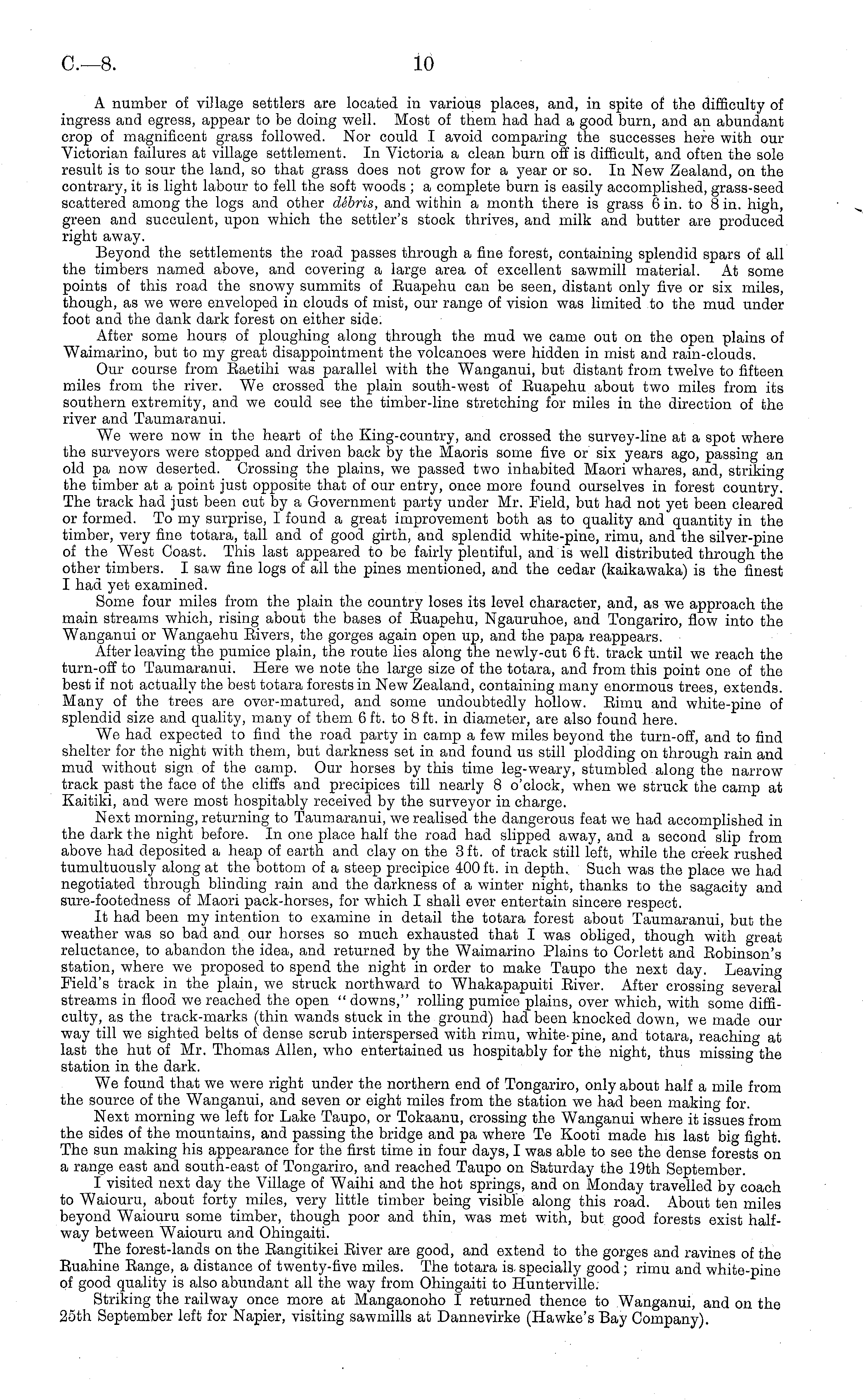 A number of village settlers are located in various places, and, in spite of the difficulty of ingress and egress, appear to be doing well. Most of them had had a good burn, and an abundant crop of magnificent grass followed. Nor could I avoid comparing the successes here with our Victorian failures at village settlement. In Victoria a clean burn off is difficult, and often the sole result is to sour the land, so that grass does not grow for a year or so. In New Zealand, on the contrary, it is light labour to fell the soft woods ; a complete burn is easily accomplished, grass-seed scattered among the logs and other dSbris, and within a month there is grass 6 in. to 8 in. high, green and succulent, upon which the settler's stock thrives, and milk and butter are produced right away. Beyond the settlements the road passes through a fine forest, containing splendid spars of all the timbers named above, and covering a large area of excellent sawmill material. At some points of this road the snowy summits of Euapehu can be seen, distant only five or six miles, though, as we were enveloped in clouds of mist, our range of vision was limited to the mud under foot and the dank dark forest on either side. After some hours of ploughing along through the mud we came out on the open plains of Waimarino, but to my great disappointment the volcanoes were hidden in mist and rain-clouds. Our course from Eaetihi was parallel with the Wanganui, but distant from twelve to fifteen miles from the river. We crossed the plain south-west of Euapehu about two miles from its southern extremity, and we could see the timber-line stretching for miles in the direction of the river and Taumaranui. We were now in the heart of the King-country, and crossed the survey-line at a spot where the surveyors were stopped and driven back by the Maoris some five or six years ago, passing an old pa now deserted. Crossing the plains, we passed two inhabited Maori whares, and, striking the timber at a point just opposite that of our entry, once more found ourselves in forest country. The track had just been cut by a Government party under Mr. Field, but had not yet been cleared or formed. To my surprise, I found a great improvement both as to quality and quantity in the timber, very fine totara, tall and of good girth, and splendid white-pine, rimu, and the silver-pine of the West Coast. This last appeared to be fairly plentiful, and is well distributed through the other timbers. I saw fine logs of all the pines mentioned, and the cedar (kaikawaka) is the finest I had yet examined. Some four miles from the plain the country loses its level character, and, as we approach the main streams which, rising about the bases of Euapehu, Ngauruhoe, and Tongariro, flow into the Wanganui or Wangaehu Eivers, the gorges again open up, and the papa reappears. After leaving the pumice plain, the route lies along the newly-cut 6 ft. track until we reach the turn-off to Taumaranui. Here we note the large size of the totara, and from this point one of the best if not actually the best totara forests in New Zealand, containing many enormous trees, extends. Many of the trees are over-matured, and some undoubtedly hollow. Eimu and white-pine of splendid size and quality, many of them 6 ft. to 8 ft. in diameter, are also found here. We had expected to find the road party in camp a few miles beyond the turn-off, and to find shelter for the night with them, but darkness set in and found us still plodding on through rain and mud without sign of the camp. Our horses by this time leg-weary, stumbled along the narrow track past the face of the cliffs and precipices till nearly 8 o'clock, when we struck the camp at Kaitiki, and were most hospitably received by the surveyor in charge. Next morning, returning to Taumaranui, we realised the dangerous feat we had accomplished in the dark the night before. In one place half the road had slipped away, and a second slip from above had deposited a heap of earth and clay on the 3 ft. of track still left, while the creek rushed tumultuously along at the bottom of a steep precipice 400 ft. in depth. Such was the place we had negotiated through blinding rain and the darkness of a winter night, thanks to the sagacity and sure-footedness of Maori pack-horses, for which I shall ever entertain sincere respect. It had been my intention to examine in detail the totara forest about Taumaranui, but the weather was so bad and our horses so much exhausted that I was obliged, though with great reluctance, to abandon the idea, and returned by the Waimarino Plains to Corlett and Eobinson's station, where we proposed to spend the night in order to make Taupo the next day. Leaving Field's track in the plain, we struck northward to Whakapapuiti Eiver. After crossing several streams in flood we reached the open " downs," rolling pumice plains, over which, with some difficulty, as the track-marks (thin wands stuck in the ground) had been knocked down, we made our way till we sighted belts of dense scrub interspersed with rimu, white-pine, and totara, reaching at last the hut of Mr. Thomas Allen, who entertained us hospitably for the night, thus missing the station in the dark. We found that we were right under the northern end of Tongariro, only about half a mile from the source of the Wanganui, and seven or eight miles from the station we had been making for. Next morning we left for Lake Taupo, or Tokaanu, crossing the Wanganui where it issues from the sides of the mountains, and passing the bridge and pa where Te Kooti made his last big fight. The sun making his appearance for the first time in four days, I was able to see the dense forests on a range east and south-east of Tongariro, and reached Taupo on Saturday the 19th September. I visited next day the Village of Waihi and the hot springs, and on Monday travelled by coach to Waiouru, about forty miles, very little timber being visible along this road. About ten miles beyond Waiouru som