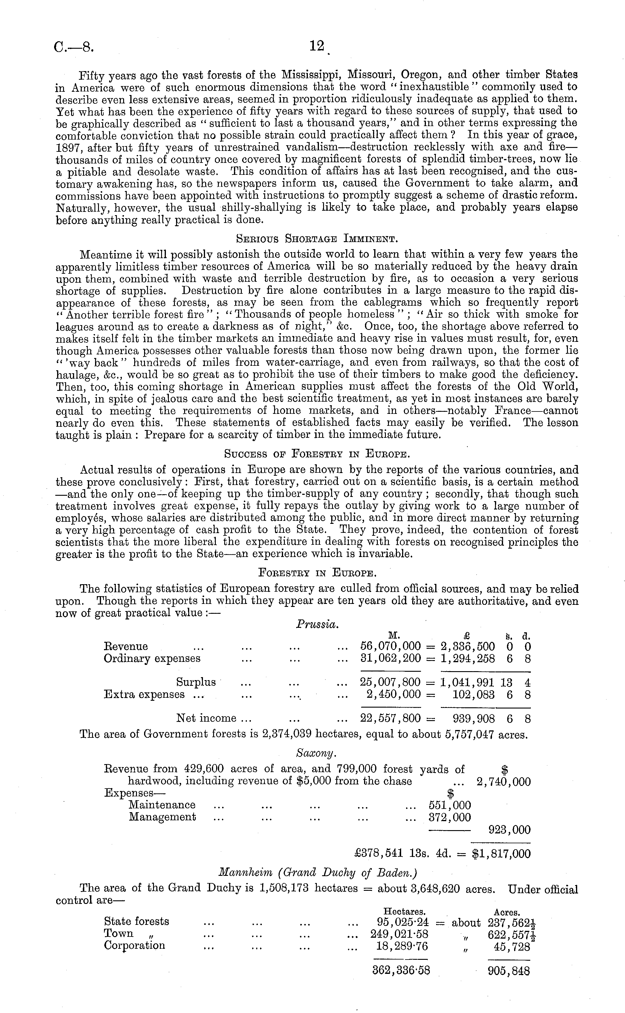 Fifty years ago the vast forests of the Mississippi, Missouri, Oregon, and other timber States in America were of such enormous dimensions that the word "inexhaustible" commonly used to describe even less extensive areas, seemed in proportion ridiculously inadequate as applied to them. Yet what has been the experience of fifty years with regard to these sources of supply, that used to be graphically described as " sufficient to last a thousand years," and in other terms expressing the comfortable conviction that no possible strain could practically affect them ? In this year of grace, 1897, after but fifty years of unrestrained vandalism —destruction recklessly with axe and fire— thousands of miles of country once covered by magnificent forests of splendid timber-trees, now lie a pitiable and desolate waste. This condition of affairs has at last been recognised, and the customary awakening has, so the newspapers inform us, caused the Government to take alarm, and commissions have been appointed with instructions to promptly suggest a scheme of drastic reform. Naturally, however, the usual shilly-shallying is likely to take place, and probably years elapse before anything really practical is done. Sebious Shobtage Imminent. Meantime it will possibly astonish the outside world to learn that within a very few years the apparently limitless timber resources of America will be so materially reduced by the heavy drain upon them, combined with waste and terrible destruction by fire, as to occasion a very serious shortage of supplies. Destruction by fire alone contributes in a large measure to the rapid disappearance of these forests, as may be seen from the cablegrams which so frequently report " Another terrible forest fire " ; " Thousands of people homeless " ; " Air so thick with smoke for leagues around as to create a darkness as of night," &c. Once, too, the shortage above referred to makes itself felt in the timber markets an immediate and heavy rise in values must result, for, even though America possesses other valuable forests than those now being drawn upon, the former lie "'way back" hundreds of miles from water-carriage, and even from railways, so that the cost of haulage, &c, would be so great as to prohibit the use of their timbers to make good the deficiency. Then, too, this coming shortage in American supplies must affect the forests of the Old World, which, in spite of jealous care and the best scientific treatment, as yet in most instances are barely equal to meeting the requirements of home markets, and in others—notably France —cannot nearly do even this. These statements of established facts may easily be verified. The lesson taught is plain : Prepare for a scarcity of timber in the immediate future. Success op Fobestby in Eubope. Actual results of operations in Europe are shown by the reports of the various countries, and these prove conclusively: First, that forestry, carried out on a scientific basis, is a certain method —and the only one —of keeping up the timber-supply of any country ; secondly, that though such treatment involves great expense, it fully repays the outlay by giving work to a large number of employes, whose salaries are distributed among the public, and in more direct manner by returning a very high percentage of cash profit to the State. They prove, indeed, the contention of forest scientists that the more liberal the expenditure in dealing with forests on recognised principles the greater is the profit to the State —an experience which is invariable. Foeestby in Eubope. The following statistics of European forestry are culled from official sources, and may be relied upon. Though the reports in which they appear are ten years old they are authoritative, and even now of great practical value : — Prussia. M. £ s. d. Eevenue ... ... ... ... 56,070,000 = 2,336,500 0 0 Ordinary expenses ... ... ... 31,062,200=1,294,258 6 8 Surplus ... ... ... 25,007,800 = 1,041,99113 4 Extra expenses ... ... .... ... 2,450,000= 102,083 6 8 Net income... ... ... 22,557,800= 939,908 6 8 The area of Government forests is 2,374,039 hectares, equal to about 5,757,047 acres. Saxony. Eevenue from 429,600 acres of area, and 799,000 forest yards of $ hardwood, including revenue of $5,000 from the chase ... 2,740,000 Expenses— $ Maintenance ... ... ... ... ... 551,000 Management ... ... ... ... ... 372,000 923,000 £378,541 13s. 4d. = $1,817,000 Mannheim (Grand Duchy of Baden.) The area of the Grand Duchy is 1,508,173 hectares = about 3,648,620 acres. Under official control are— Hectares. Acres. State forests ... ... ... ... 95,025-24 = about 237,5621 Town „ 249,021-58 „ 622,557jCorporation ~. ... ... ... 18,289-76 „ 45,728 362,336-58 905,848