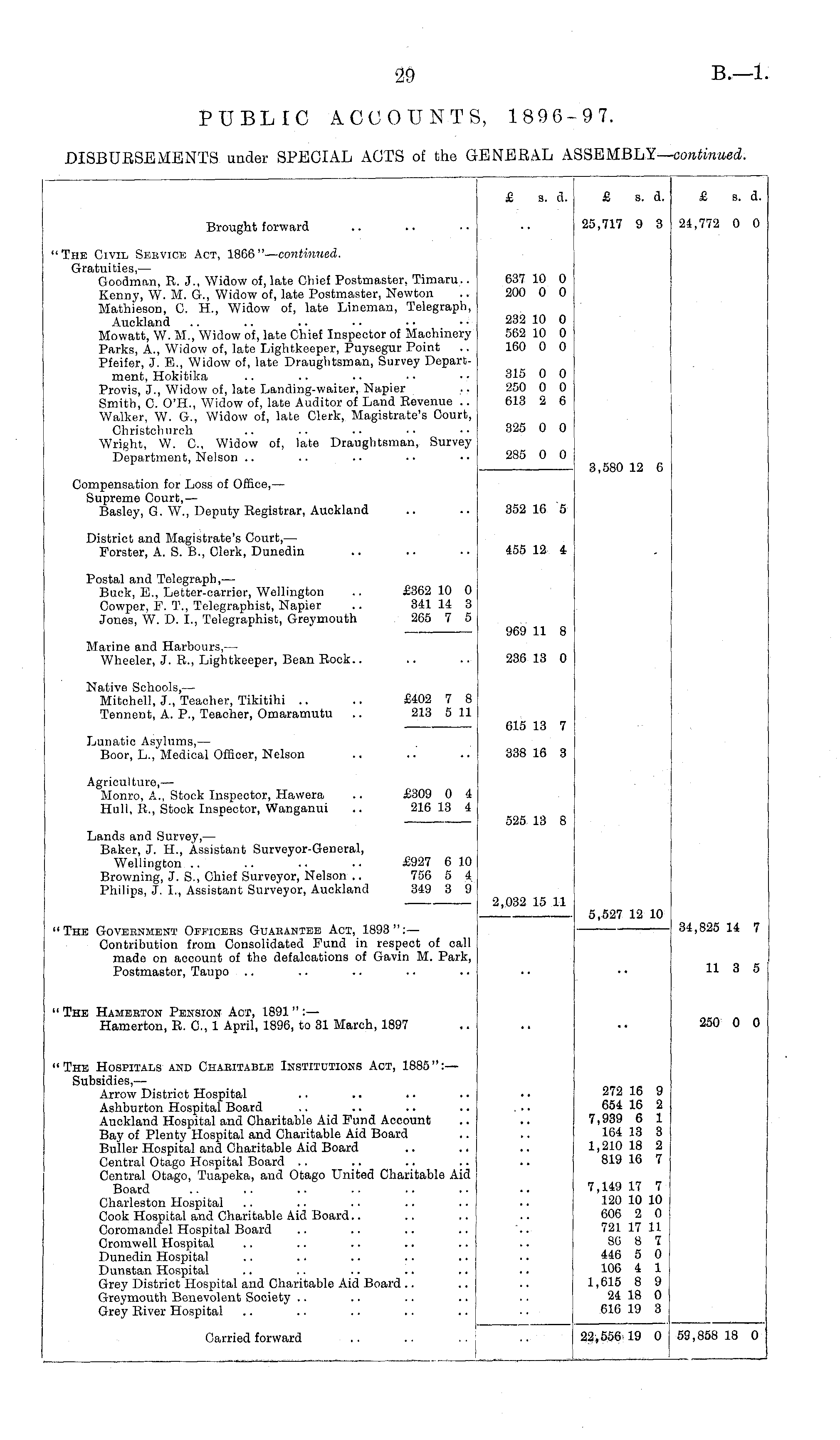£ s. d. £ s. d. £ s. d. 25,717 9 3 24,772 0 0 Brought forward 'The Civil Service Act, 1866"— continued. Gratuities, — Goodman, R. J., Widow of, late Chief Postmaster, Timaru.. Kenny, W. M. G., Widow of, late Postmaster, Newton Mathieson, C. H., Widow of, late Lineman, Telegraph, Auckland Movvatt, W. M., Widow of, late Chief Inspector of Machinery Parks, A., Widow of, late Lightkeeper, Puysegur Point Pfeifer, J. E., Widow of, late Draughtsman, Survey Department, Hokitika Provis, J., Widow of, late Landing-waiter, Napier Smith, C. O'H., Widow of, late Auditor of Land Revenue .. Walker, W. G., Widow of, late Clerk, Magistrate's Court, Christen nreh Wright, W. C, Widow of, late Draughtsman, Survey Department, Nelson 637 10 0 200 0 0 232 10 0 562 10 0 160 0 0 315 0 0 250 0 0 613 2 6 325 0 0 285 0 0 3,580 12 6 Compensation for Loss of Office, — Supreme Court, — Basley, G. W., Deputy Registrar, Auckland 352 16 5 District and Magistrate's Court, — Forster, A. S. B., Clerk, Dunedin 455 12 4 Postal and Telegraph,— Buck, E., Letter-carrier, Wellington .. £362 10 0 Cowper, F. T., Telegraphist, Napier .. 341 14 3 Jones, W. D. I., Telegraphist, Greymouth 265 7 5 969 11 8 Marine and Harbours, — Wheeler, J. R., Lightkeeper, Bean Rock.. 236 13 0 Native Schools, — Mitchell, J., Teacher, Tikitihi .. .. £402 7 8 Tennent, A. P., Teacher, Omaramutu .. 213 5 11 615 13 7 Lunatic Asylums,— Boor, L., Medical Officer, Nelson 338 16 3 Agriculture,— Monro, A., Stock Inspector, Hawera .. £309 0 4 Hull, R., Stock Inspector, Wanganui .. 216 13 4 525 13 8 Lands and Survey,— Baker, J. H., Assistant Surveyor-General, Wellington .. .. .. .. £927 6 10 Browning, J. S., Chief Surveyor, Nelson .. 756 5 4 Philips, J. I., Assistant Surveyor, Auckland 349 3 9 2,032 15 11 "The Government Officees Guarantee Act, 1893":— Contribution from Consolidated Fund in respect of call made on account of the defalcations of Gavin M. Park, Postmaster, Taupo .. 5,527 12 10 34,825 14 7 11 3 5 " The Hamerton Pension Act, 1891" :— Hamerton, R. C, 1 April, 1896, to 31 March, 1897 250 0 0 "The Hospitals and Charitable Institutions Act, 1885":— Subsidies, — Arrow District Hospital Ashburton Hospital Board Auckland Hospital and Charitable Aid Fund Account Bay of Plenty Hospital and Charitable Aid Board Buller Hospital and Charitable Aid Board Central Otago Hospital Board Central Otago, Tuapeka, and Otago United Charitable Aid Board Charleston Hospital Cook Hospital and Charitable Aid Board.. Coromandel Hospital Board Cromwell Hospital Dunedin Hospital Dunstan Hospital Grey District Hospital and Charitable Aid Board Greymouth Benevolent Society Grey River Hospital 272 16 9 654 16 2 7,939 6 1 164 13 3 1,210 18 2 819 16 7 7,149 17 7 120 10 10 606 2 0 721 17 11 86 8 7 446 5 0 106 4 1 1,615 8 9 24 18 0 616 19 3 Carried forward 22,556 19 0 59,858 18 0