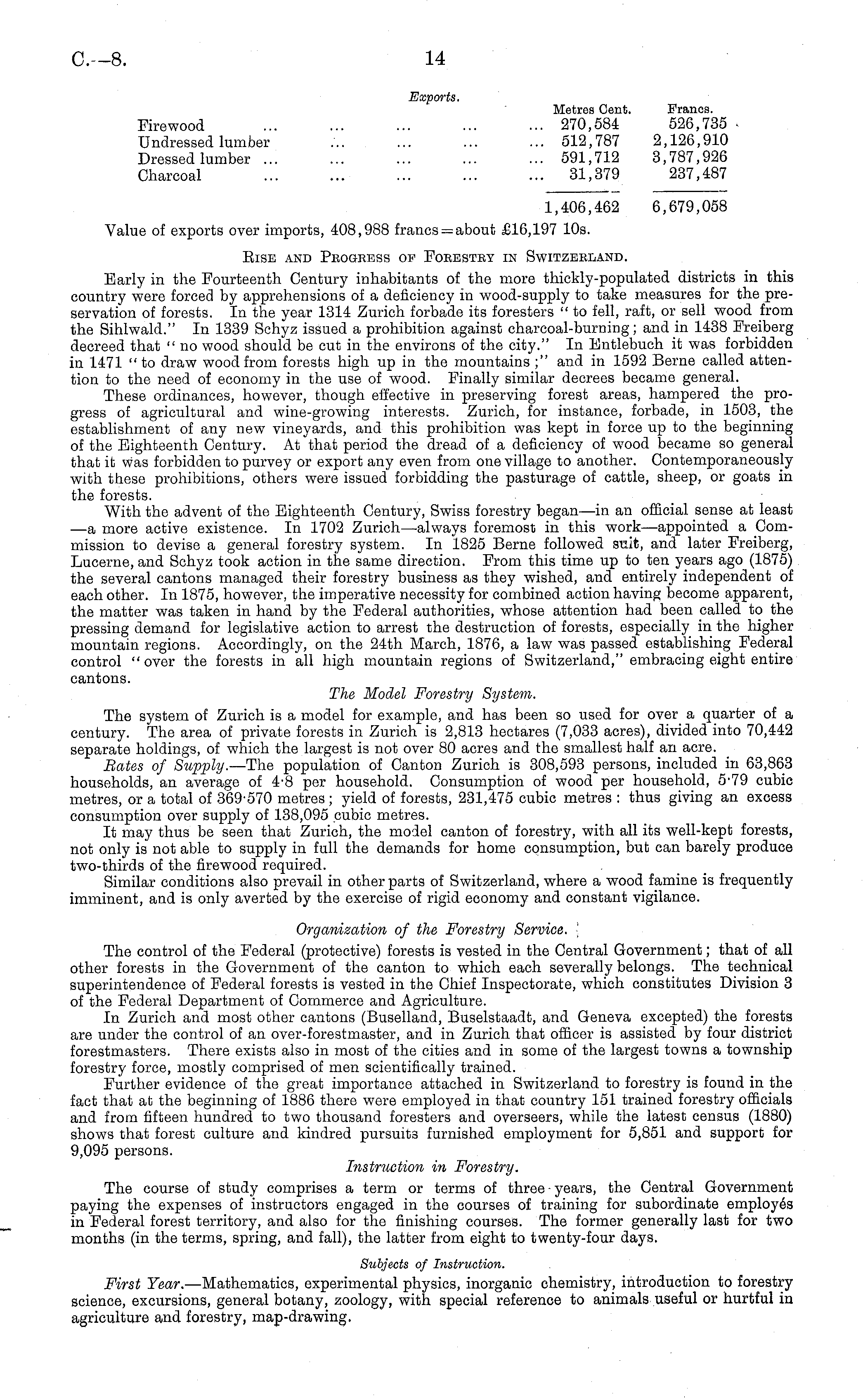 Exports. Metres Gent. Francs. Firewood ... ... ... ... ... 270,584 526,735 Undressed lumber ... 512,787 2,126,910 Dressed lumber ... ... ... 591,712 3,787,926 Charcoal 31,379 237,487 1,406,462 6,679,058 Value of exports over imports, 408,988 francs = about £16,197 10s. EISE AND PROGRESS OF FORESTRY IN SWITZERLAND. Early in the Fourteenth Century inhabitants of the more thickly-populated districts in this country were forced by apprehensions of a deficiency in wood-supply to take measures for the preservation of forests. In the year 1314 Zurich forbade its foresters "to fell, raft, or sell wood from the Sihlwald." In 1339 Schyz issued a prohibition against charcoal-burning; and in 1438 Freiberg decreed that "no wood should be cut in the environs of the city." In Entlebuch it was forbidden in 1471 "to draw wood from forests high up in the mountains ;" and in 1592 Berne called attention to the need of economy in the use of wood. Finally similar decrees became general. These ordinances, however, though effective in preserving forest areas, hampered the progress of agricultural and wine-growing interests. Zurich, for instance, forbade, in 1503, the establishment of any new vineyards, and this prohibition was kept in force up to the beginning of the Eighteenth Century. At that period the dread of a deficiency of wood became so general that it was forbidden to purvey or export any even from one village to another. Contemporaneously with these prohibitions, others were issued forbidding the pasturage of cattle, sheep, or goats in the forests. With the advent of the Eighteenth Century, Swiss forestry began —in an official sense at least —a more active existence. In 1702 Zurich—always foremost in this work —appointed a Commission to devise a general forestry system. In 1825 Berne followed snit, and later Freiberg, Lucerne, and Schyz took action in the same direction. From this time up to ten years ago (1875) the several cantons managed their forestry business as they wished, and entirely independent of each other. In 1875, however, the imperative necessity for combined action having become apparent, the matter was taken in hand by the Federal authorities, whose attention had been called to the pressing demand for legislative action to arrest the destruction of forests, especially in the higher mountain regions. Accordingly, on the 24th March, 1876, a law was passed establishing Federal control "over the forests in all high mountain regions of Switzerland," embracing eight entire cantons. The Model Forestry System. The system of Zurich is a model for example, and has been so used for over a quarter of a century. The area of private forests in Zurich is 2,813 hectares (7,033 acres), divided into 70,442 separate holdings, of which the largest is not over 80 acres and the smallest half an acre. Bates of Supply. —The population of Canton Zurich is 308,593 persons, included in 63,863 households, an average of 4'B per household. Consumption of wood per household, 5-79 cubic metres, or a total of 369-570 metres ; yield of forests, 231,475 cubic metres : thus giving an excess consumption over supply of 138,095 cubic metres. It may thus be seen that Zurich, the model canton of forestry, with all its well-kept forests, not only is not able to supply in full the demands for home consumption, but can barely produce two-thirds of the firewood required. Similar conditions also prevail in other parts of Switzerland, where a wood famine is frequently imminent, and is only averted by the exercise of rigid economy and constant vigilance. Organization of the Forestry Service. ' The control of the Federal (protective) forests is vested in the Central Government; that of all other forests in the Government of the canton to which each severally belongs. The technical superintendence of Federal forests is vested in the Chief Inspectorate, which constitutes Division 3 of the Federal Department of Commerce and Agriculture. In Zurich and most other cantons (Buselland, Buselstaadt, and Geneva excepted) the forests are under the control of an over-forestmaster, and in Zurich that officer is assisted by four district forestmasters. There exists also in most of the cities and in some of the largest towns a township forestry force, mostly comprised of men scientifically trained. Further evidence of the great importance attached in Switzerland to forestry is found in the fact that at the beginning of 1886 there were employed in that country 151 trained forestry officials and from fifteen hundred to two thousand foresters and overseers, while the latest census (1880) shows that forest culture and kindred pursuits furnished employment for 5,851 and support for 9,095 persons. Instruction in Forestry. The course of study comprises a term or terms of three years, the Central Government paying the expenses of instructors engaged in the courses of training for subordinate employes in Federal forest territory, and also for the finishing courses. The former generally last for two months (in the terms, spring, and fall), the latter from eight to twenty-four days. Subjects of Instruction. First Year. —Mathematics, experimental physics, inorganic chemistry, introduction to forestry science, excursions, general botany, zoology, with special reference to animals useful or hurtful in agriculture and forestry, map-drawing.