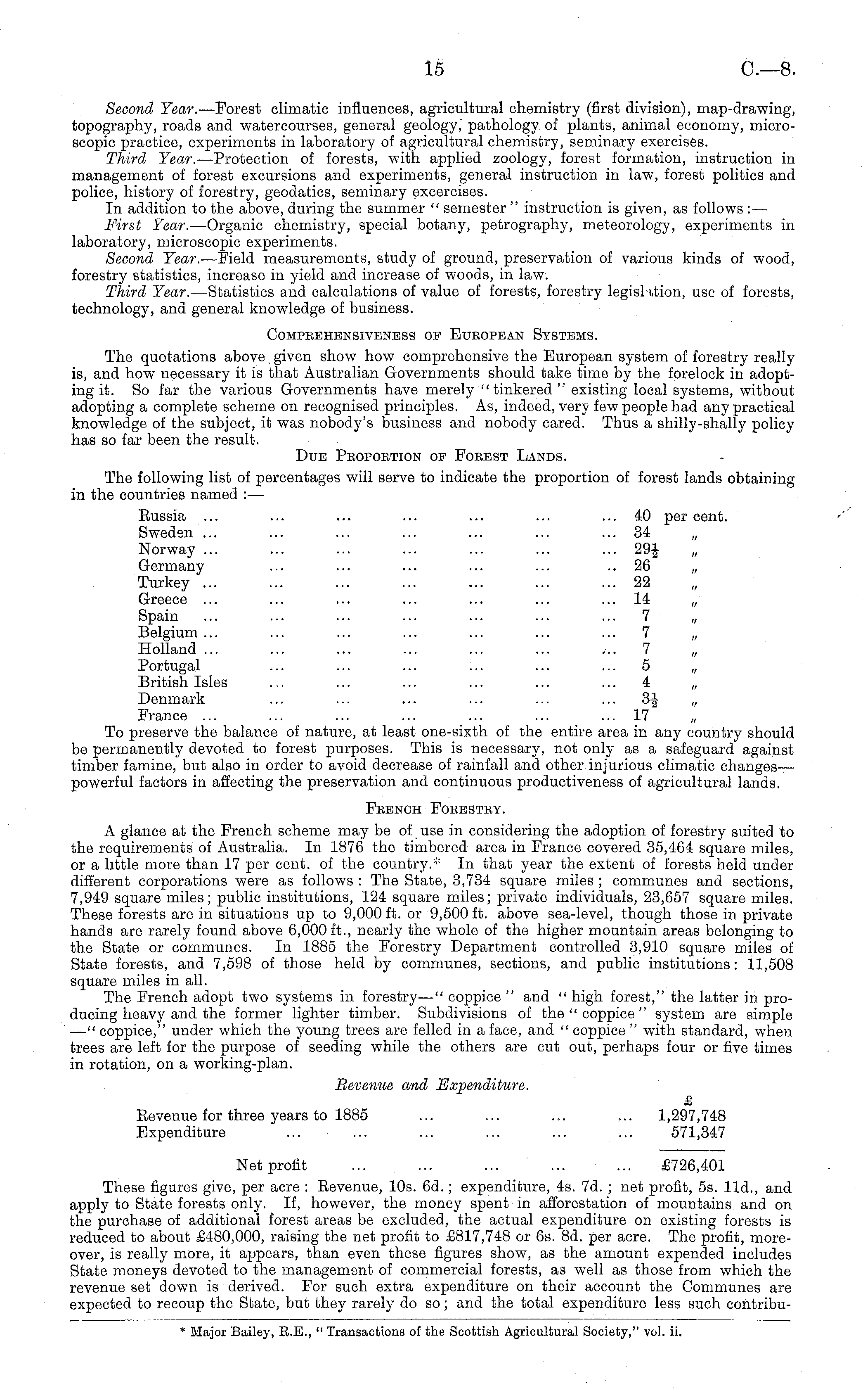 Second Tear. —Forest climatic influences, agricultural chemistry (first division), map-drawing, topography, roads and watercourses, general geology, pathology of plants, animal economy, microscopic practice, experiments in laboratory of agricultural chemistry, seminary exercises. Third Year. —Protection of forests, with applied zoology, forest formation, instruction in management of forest excursions and experiments, general instruction in law, forest politics and police, history of forestry, geodatics, seminary excercises. In addition to the above, during the summer " semester " instruction is given, as follows : — First Year. —Organic chemistry, special botany, petrography, meteorology, experiments in laboratory, microscopic experiments. Second Year. —Field measurements, study of ground, preservation of various kinds of wood, forestry statistics, increase in yield and increase of woods, in law. Third Year. —Statistics and calculations of value of forests, forestry legislation, use of forests, technology, and general knowledge of business. Comprehensiveness op European Systems. The quotations above given show how comprehensive the European system of forestry really is, and how necessary it is that Australian Governments should take time by the forelock in adopting it. So far the various Governments have merely "tinkered" existing local systems, without adopting a complete scheme on recognised principles. As, indeed, very few people had any practical knowledge of the subject, it was nobody's business and nobody cared. Thus a shilly-shally policy has so far been the result. Due Proportion of Forest Lands. The following list of percentages will serve to indicate the proportion of forest lands obtaining in the countries named :— Russia ... ... ... ... ... ... ... 40 per cent. Sweden ... ... ... ... ... ... ... 34 Norway ... ... ... ... ... ... ... 29J „ Germany ... ... ... ... ... ..26 „ Turkey ... ... ... ... ... ... ... 22 Greece ... ... ... ... ... ... ... 14 „ Spain ... ... ... ... ... ... ... 7 „ Belgium ... ... ... ... ... ... ... 7 „ Holland 7 Portugal ... ... ... ... ... ... 5 „ British Isles ... ... ... ... ... ... 4 „ Denmark ... ... ... ... ... ... 3-J „ France ... ... ... ... ... ... ... 17 „ To preserve the balance of nature, at least one-sixth of the entire area in any country should be permanently devoted to forest purposes. This is necessary, not only as a safeguard against timber famine, but also in order to avoid decrease of rainfall and other injurious climatic changes— powerful factors in affecting the preservation and continuous productiveness of agricultural lands. Fbench Forestry. A glance at the French scheme may be of use in considering the adoption of forestry suited to the requirements of Australia. In 1876 the timbered area in France covered 35,464 square miles, or a little more than 17 per cent, of the country.* In that year the extent of forests held under different corporations were as follows : The State, 3,734 square miles ; communes and sections, 7,949 square miles; public institutions, 124 square miles; private individuals, 23,657 square miles. These forests are in situations up to 9,000 ft. or 9,500 ft. above sea-level, though those in private hands are rarely found above 6,000 ft., nearly the whole of the higher mountain areas belonging to the State or communes. In 1885 the Forestry Department controlled 3,910 square miles of State forests, and 7,598 of those held by communes, sections, and public institutions: 11,508 square miles in all. The French adopt two systems in forestry —" coppice " and " high forest," the latter in producing heavy and the former lighter timber. Subdivisions of the " coppice " system are simple —" coppice," under which the young trees are felled in a face, and " coppice " with standard, when trees are left for the purpose of seeding while the others are cut out, perhaps four or five times in rotation, on a working-plan. Revenue and Expenditure. Eevenue for three years to 1885 ... ... ... ... 1,297,748 Expenditure ... ... ... ... ... ... 571,347 Net profit ... ... ... ... ... £726,401 These figures give, per acre : Eevenue, 10s. 6d.; expenditure, 4s. 7d. ; net profit, ss. lid., and apply to State forests only. If, however, the money spent in afforestation of mountains and on the purchase of additional forest areas be excluded, the actual expenditure on existing forests is reduced to about £480,000, raising the net profit to £817,748 or 6s. Bd. per acre. The profit, moreover, is really more, it appears, than even these figures show, as the amount expended includes State moneys devoted to the management of commercial forests, as well as those from which the revenue set down is derived. For such extra expenditure on their account the Communes are expected to recoup the State, but they rarely do so; and the total expenditure less such contribu-