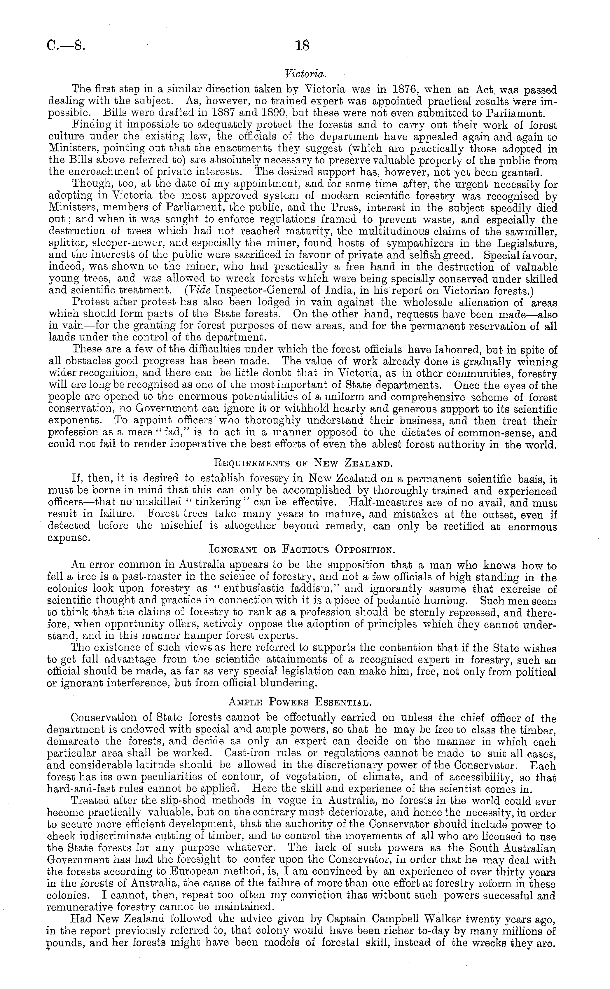 Victoria. The first step in a similar direction taken by Victoria was in 1876, when an Act was passed dealing with the subject. As, however, no trained expert was appointed practical results were impossible. Bills were drafted in 1887 and 1890, but these were not even submitted to Parliament. Finding it impossible to adequately protect the forests and to carry out their work of forest culture under the existing law, the officials of the department have appealed again and again to Ministers, pointing out that the enactments they suggest (which are practically those adopted in the Bills above referred to) are absolutely necessary to preserve valuable property of the public from the encroachment of private interests. The desired support has, however, not yet been granted. Though, too, at the date of my appointment, and for some time after, the urgent necessity for adopting in Victoria the most approved system of modern scientific forestry was recognised by Ministers, members of Parliament, the public, and the Press, interest in the subject speedily died out; and when it was sought to enforce regulations framed to prevent waste, and especially the destruction of trees which had not reached maturity, the multitudinous claims of the sawmiller, splitter, sleeper-hewer, and especially the miner, found hosts of sympathizers in the Legislature, and the interests of the public were sacrificed in favour of private and selfish greed. Special favour, indeed, was shown to the miner, who had practically a free hand in the destruction of valuable young trees, and was allowed to wreck forests which were being specially conserved under skilled and scientific treatment. (Vide Inspector-General of India, in his report on Victorian forests.) Protest after protest has also been lodged in vain against the wholesale alienation of areas which should form parts of the State forests. On the other hand, requests have been made—also in vain—for the granting for forest purposes of new areas, and for the permanent reservation of all lands under the control of the department. These are a few of the difficulties under which the forest officials have laboured, but in spite of all obstacles good progress has been made. The value of work already done is gradually winning wider recognition, and there can be little doubt that in Victoria, as in other communities, forestry will ere long be recognised as one of the most important of State departments. Once the eyes of the people are opened to the enormous potentialities of a uniform and comprehensive scheme of forest conservation, no Government can ignore it or withhold hearty and generous support to its scientific exponents. To appoint officers who thoroughly understand their business, and then treat their profession as a mere "fad," is to act in a manner opposed to the dictates of common-sense, and could not fail to render inoperative the best efforts of even the ablest forest authority in the world. Bequieements of New Zealand. If, then, it is desired to establish forestry in New Zealand on a permanent scientific basis, it must be borne in mind that this can only be accomplished by thoroughly trained and experienced officers —that no unskilled " tinkering " can be effective. Half-measures are of no avail, and must result in failure. Forest trees take many years to mature, and mistakes at the outset, even if detected before the mischief is altogether beyond remedy, can only be rectified at enormous expense. Ignorant oe Factious Opposition. An error common in Australia appears to be the supposition that a man who knows how to fell a tree is a past-master in the science of forestry, and not a few officials of high standing in the colonies look upon forestry as " enthusiastic faddism," and ignorantly assume that exercise of scientific thought and practice in connection with it is a piece of pedantic humbug. Such men seem to think that the claims of forestry to rank as a profession should be sternly repressed, and therefore, when opportunity offers, actively oppose the adoption of principles which they cannot understand, and in this manner hamper forest experts. The existence of such views as here referred to supports the contention that if the State wishes to get full advantage from the scientific attainments of a recognised expert in forestry, such an official should be made, as far as very special legislation can make him, free, not only from political or ignorant interference, but from official blundering. Ample Powers Essential. Conservation of State forests cannot be effectually carried on unless the chief officer of the department is endowed with special and ample powers, so that he may be free to class the timber, demarcate the forests, and decide as only an expert can decide on the manner in which each particular area shall be worked. Cast-iron rules or regulations cannot be made to suit all cases, and considerable latitude should be allowed in the discretionary power of the Conservator. Each forest has its own peculiarities of contour, of vegetation, of climate, and of accessibility, so that hard-and-fast rules cannot be applied. Here the skill and experience of the scientist comes in. Treated after the slip-shod methods in vogue in Australia, no forests in the world could ever become practically valuable, but on the contrary must deteriorate, and hence the necessity, in order to secure more efficient development, that the authority of the Conservator should include power to check indiscriminate cutting of timber, and to control the movements of all who are licensed to use the State forests for any purpose whatever. The lack of such powers as the South Australian Government has had the foresight to confer upon the Conservator, in order that he may deal with the forests according to European method, is, I am convinced by an experience of over thirty years in the forests of Australia, the cause of the failure of more than one effort at forestry reform in these colon