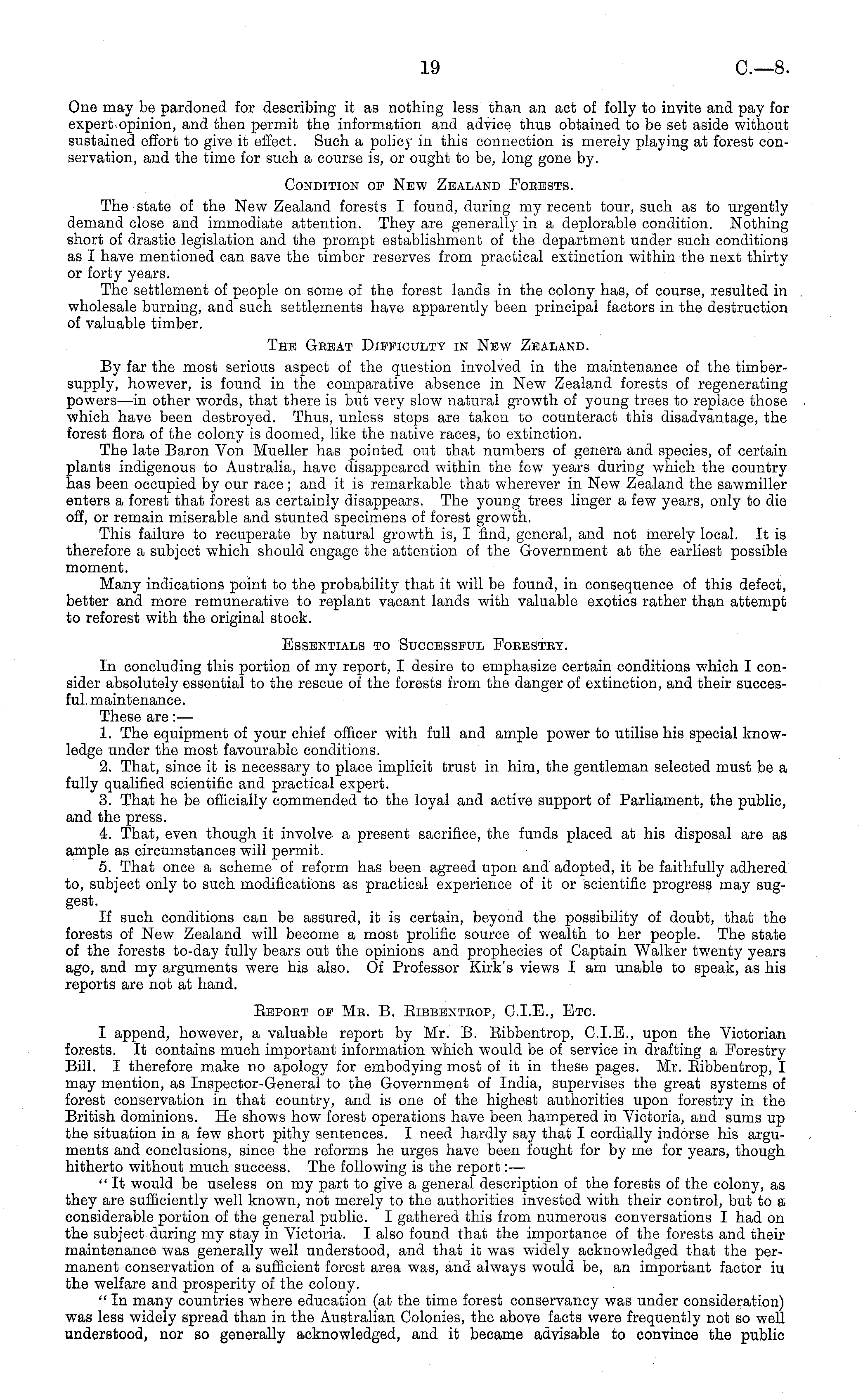 One may be pardoned for describing it as nothing less than an act of folly to invite and pay for expert opinion, and then permit the information and advice thus obtained to be set aside without sustained effort to give it effect. Such a policy in this connection is merely playing at forest conservation, and the time for such a course is, or ought to be, long gone by. Condition of New Zealand Fobests. The state of the New Zealand forests I found, during my recent tour, such as to urgently demand close and immediate attention. They are generally in a deplorable condition. Nothing short of drastic legislation and the prompt establishment of the department under such conditions as I have mentioned can save the timber reserves from practical extinction within the next thirty or forty years. The settlement of people on some of the forest lands in the colony has, of course, resulted in wholesale burning, and such settlements have apparently been principal factors in the destruction of valuable timber. The Geeat Difficulty in New Zealand. By far the most serious aspect of the question involved in the maintenance of the timbersupply, however, is found in the comparative absence in New Zealand forests of regenerating powers—in other words, that there is but very slow natural growth of young trees to replace those which have been destroyed. Thus, unless steps are taken to counteract this disadvantage, the forest flora of the colony is doomed, like the native races, to extinction. The late Baron Yon Mueller has pointed out that numbers of genera and species, of certain plants indigenous to Australia, have disappeared within the few years during which the country has been occupied by our race; and it is remarkable that wherever in New Zealand the sawmiller enters a forest that forest as certainly disappears. The young trees linger a few years, only to die off, or remain miserable and stunted specimens of forest growth. This failure to recuperate by natural growth is, I find, general, and not merely local. It is therefore a subject which should engage the attention of the Government at the earliest possible moment. Many indications point to the probability that it will be found, in consequence of this defect, better and more remunerative to replant vacant lands with valuable exotics rather than attempt to reforest with the original stock. Essentials to Successful Fobestby. In concluding this portion of my report, I desire to emphasize certain conditions which I consider absolutely essential to the rescue of the forests from the danger of extinction, and their suceesful. maintenance. These are:— 1. The equipment of your chief officer with full and ample power to utilise his special knowledge under the most favourable conditions. 2. That, since it is necessary to place implicit trust in him, the gentleman selected must be a fully qualified scientific and practical expert. 3. That he be officially commended to the loyal and active support of Parliament, the public, and the press. 4. That, even though it involve a present sacrifice, the funds placed at his disposal are as ample as circumstances will permit. 5. That once a scheme of reform has been agreed upon and adopted, it be faithfully adhered to, subject only to such modifications as practical experience of it or scientific progress may suggest. If such conditions can be assured, it is certain, beyond the possibility of doubt, that the forests of New Zealand will become a most prolific source of wealth to her people. The state of the forests to-day fully bears out the opinions and prophecies of Captain Walker twenty years ago, and my arguments were his also. Of Professor Kirk's views I am unable to speak, as his reports are not at hand. Eepobt of Me. B. Eibbenteop, C.1.E., Etc. I append, however, a valuable report by Mr. B. Eibbentrop, C.1.E., upon the Victorian forests. It contains much important information which would be of service in drafting a Forestry Bill. I therefore make no apology for embodying most of it in these pages. Mr. Eibbentrop, I may mention, as Inspector-General to the Government of India, supervises the great systems of forest conservation in that country, and is one of the highest authorities upon forestry in the British dominions. He shows how forest operations have been hampered in Victoria, and sums up the situation in a few short pithy sentences. I need hardly say that I cordially indorse his arguments and conclusions, since the reforms he urges have been fought for by me for years, though hitherto without much success. The following is the report:— "It would be useless on my part to give a general description of the forests of the colony, as they are sufficiently well known, not merely to the authorities invested with their control, but to a considerable portion of the general public. I gathered this from numerous conversations I had on the subject during my stay in Victoria. I also found that the importance of the forests and their maintenance was generally well understood, and that it was widely acknowledged that the permanent conservation of a sufficient forest area was, and always would be, an important factor iv the welfare and prosperity of the colony. " In many countries where education (at the time forest conservancy was under consideration) was less widely spread than in the Australian Colonies, the above facts were frequently not so well understood, nor so generally acknowledged, and it became advisable to convince the public