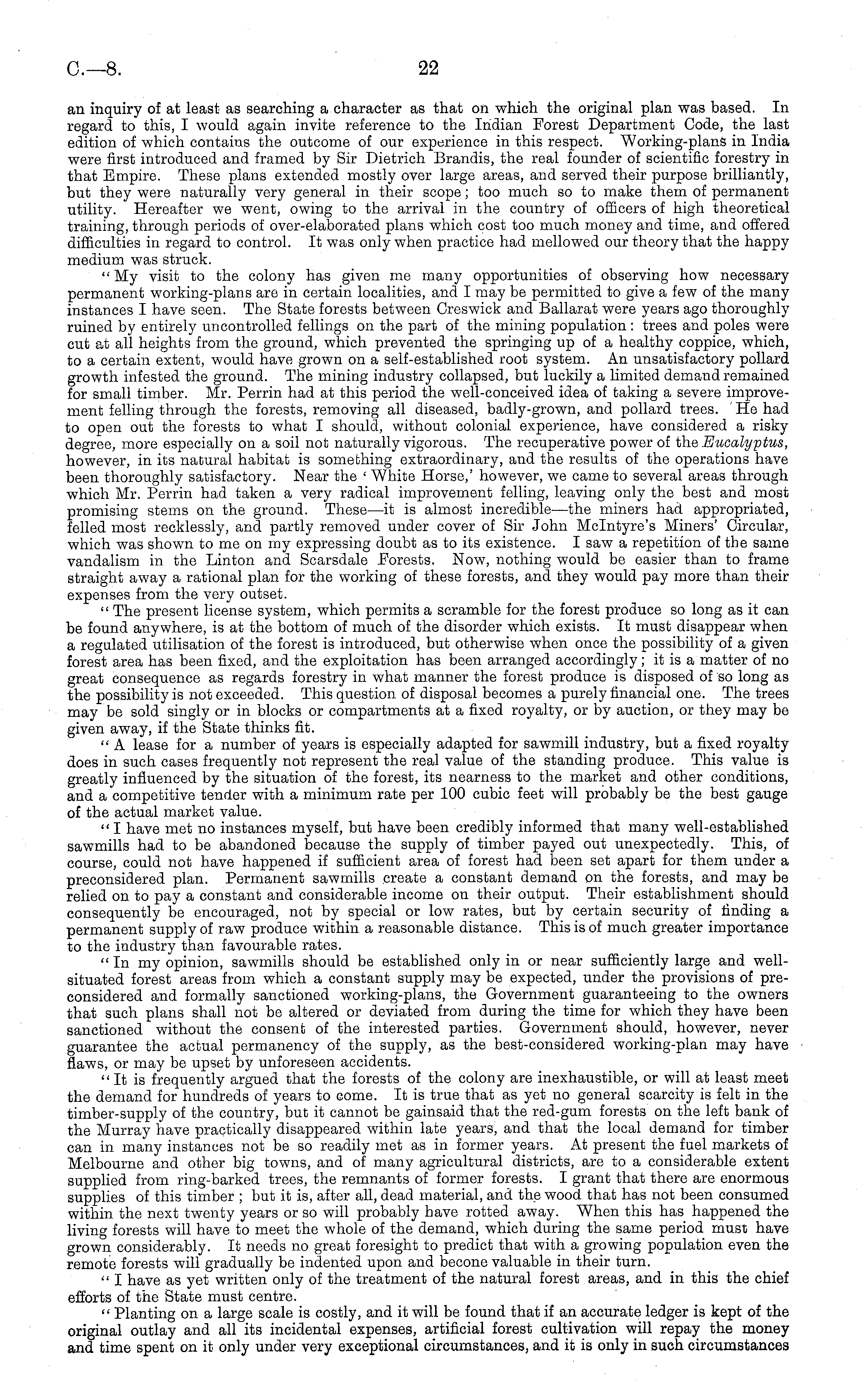 an inquiry of at least as searching a character as that on which the original plan was based. In regard to this, I would again invite reference to the Indian Forest Department Code, the last edition of which contains the outcome of our experience in this respect. Working-plans in India were first introduced and framed by Sir Dietrich Brandis, the real founder of scientific forestry in that Empire. These plans extended mostly over large areas, and served their purpose brilliantly, but they were naturally very general in their scope; too much so to make them of permanent utility. Hereafter we went, owing to the arrival in the country of officers of high theoretical training, through periods of over-elaborated plans which cost too much money and time, and offered difficulties in regard to control. It was only when practice had mellowed our theory that the happy medium was struck. "My visit to the colony has given me many opportunities of observing how necessary permanent working-plans are in certain localities, and I may be permitted to give a few of the many instances I have seen. The State forests between Creswick and Ballarat were years ago thoroughly ruined by entirely uncontrolled fellings on the part of the mining population : trees and poles were cut at all heights from the ground, which prevented the springing up of a healthy coppice, which, to a certain extent, would have grown on a self-established root system. An unsatisfactory pollard growth infested the ground. The mining industry collapsed, but luckily a limited demand remained for small timber. Mr. Perrin had at this period the well-conceived idea of taking a severe improvement felling through the forests, removing all diseased, badly-grown, and pollard trees. He had to open out the forests to what I should, without colonial experience, have considered a risky degree, more especially on a soil not naturally vigorous. The recuperative power of the Eucalyptus, however, in its natural habitat is something extraordinary, and the results of the operations have been thoroughly satisfactory. Near the ' White Horse,' however, we came to several areas through which Mr. Perrin had taken a very radical improvement felling, leaving only the best and most promising stems on the ground. These—it is almost incredible —the miners had appropriated, felled most recklessly, and partly removed under cover of Sir John Mclntyre's Miners' Circular, which was shown to me on my expressing doubt as to its existence. I saw a repetition of the same vandalism in the Linton and Scarsdale Forests. Now, nothing would be easier than to frame straight away a rational plan for the working of these forests, and they would pay more than their expenses from the very outset. " The present license system, which permits a scramble for the forest produce so long as it can be found anywhere, is at the bottom of much of the disorder which exists. It must disappear when a regulated utilisation of the forest is introduced, but otherwise when once the possibility of a given forest area has been fixed, and the exploitation has been arranged accordingly; it is a matter of no great consequence as regards forestry in what manner the forest produce is disposed of so long as the possibility is not exceeded. This question of disposal becomes a purely financial one. The trees may be sold singly or in blocks or compartments at a fixed royalty, or by auction, or they may be given away, if the State thinks fit. " A lease for a number of years is especially adapted for sawmill industry, but a fixed royalty does in such cases frequently not represent the real value of the standing produce. This value is greatly influenced by the situation of the forest, its nearness to the market and other conditions, and a competitive tender with a minimum rate per 100 cubic feet will probably be the best gauge of the actual market value. " I have met no instances myself, but have been credibly informed that many well-established sawmills had to be abandoned because the supply of timber payed out unexpectedly. This, of course, could not have happened if sufficient area of forest had been set apart for them under a preconsidered plan. Permanent sawmills create a constant demand on the forests, and may be relied on to pay a constant and considerable income on their output. Their establishment should consequently be encouraged, not by special or low rates, but by certain security of finding a permanent supply of raw produce within a reasonable distance. This is of much greater importance to the industry than favourable rates. "In my opinion, sawmills should be established only in or near sufficiently large and wellsituated forest areas from which a constant supply may be expected, under the provisions of preeonsidered and formally sanctioned working-plans, the Government guaranteeing to the owners that such plans shall not be altered or deviated from during the time for which they have been sanctioned without the consent of the interested parties. Government should, however, never guarantee the actual permanency of the supply, as the best-considered working-plan may have flaws, or may be upset by unforeseen accidents. "It is frequently argued that the forests of the colony are inexhaustible, or will at least meet the demand for hundreds of years to come. It is true that as yet no general scarcity is felt in the timber-supply of the country, but it cannot be gainsaid that the red-gum forests on the left bank of the Murray have practically disappeared within late years, and that the local demand for timber can in many instances not be so readily met as in former years. At present the fuel markets of Melbourne and other big towns, and of many agricultural districts, are to a considerable extent supplied from ring-barked trees, the remnants of former forests. I grant that there are enormous supplies of this timber ; but it is, after all, dead material, and the wood that has not been consumed within the 