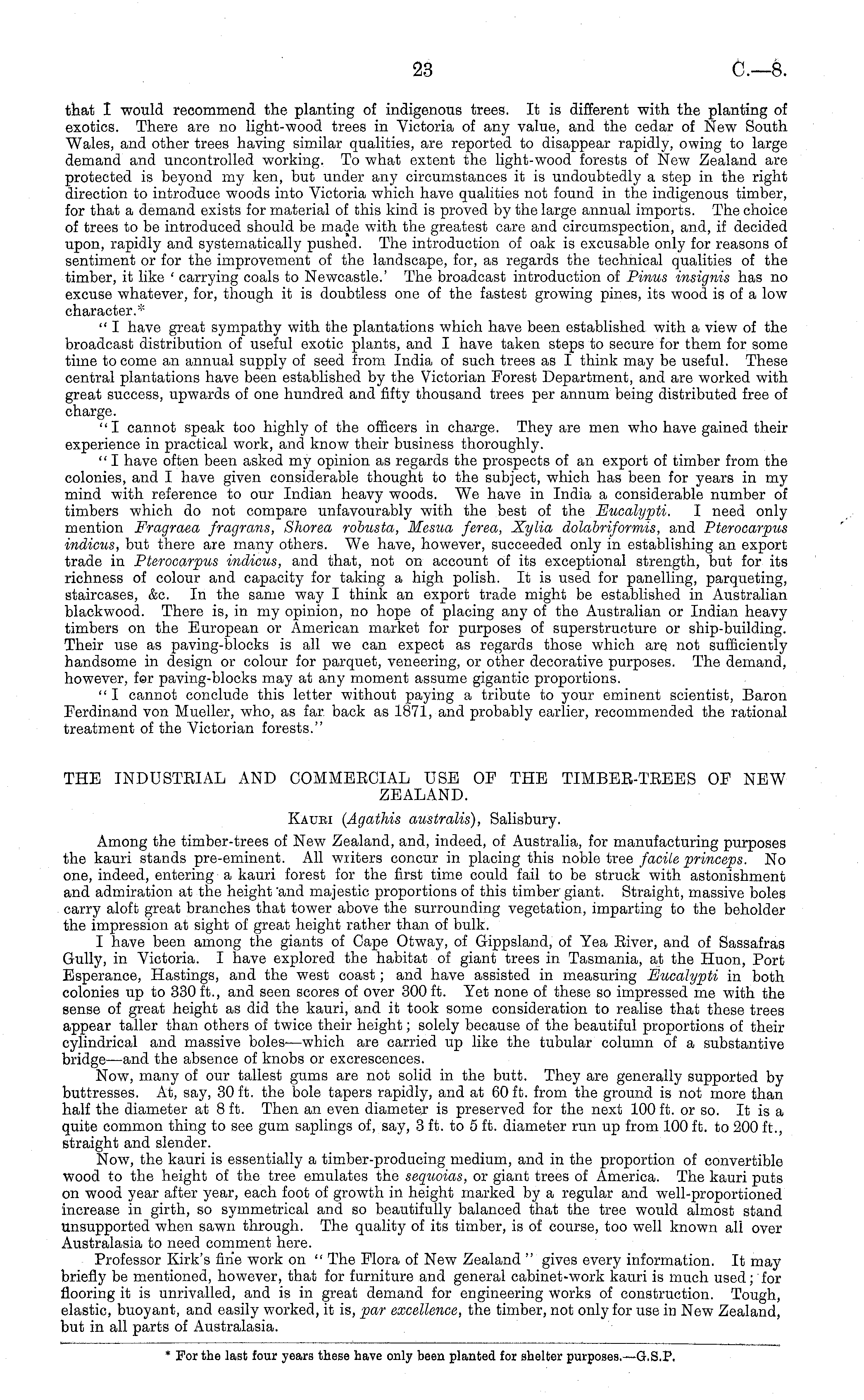 that I would recommend the planting of Indigenous trees. It is different with the planting of exotics. There are no light-wood trees in Victoria of any value, and the cedar of New South Wales, and other trees having similar qualities, are reported to disappear rapidly, owing to large demand and uncontrolled working. To what extent the light-wood forests of New Zealand are protected is beyond my ken, but under any circumstances it is undoubtedly a step in the right direction to introduce woods into Victoria which have qualities not found in the indigenous timber, for that a demand exists for material of this kind is proved by the large annual imports. The choice of trees to be introduced should be made with the greatest care and circumspection, and, if decided upon, rapidly and systematically pushed. The introduction of oak is excusable only for reasons of sentiment or for the improvement of the landscape, for, as regards the technical qualities of the timber, it like ' carrying coals to Newcastle.' The broadcast introduction of Pinus insignis has no excuse whatever, for, though it is doubtless one of the fastest growing pines, its wood is of a low character.* " I have great sympathy with the plantations which have been established with a view of the broadcast distribution of useful exotic plants, and I have taken steps to secure for them for some time to come an annual supply of seed from India of such trees as I think may be useful. These central plantations have been established by the Victorian Forest Department, and are worked with great success, upwards of one hundred and fifty thousand trees per annum being distributed free of charge. "I cannot speak too highly of the officers in charge. They are men who have gained their experience in practical work, and know their business thoroughly. " I have often been asked my opinion as regards the prospects of an export of timber from the colonies, and I have given considerable thought to the subject, which has been for years in my mind with reference to our Indian heavy woods. We have in India a considerable number of timbers which do not compare unfavourably with the best of the Eucalypti. I need only mention Fragraea fragrans, Shorea robusta, Mesna ferea, Xylia dolabriformis, and Pterocarpus indicus, but there are many others. We have, however, succeeded only in establishing an export trade in Pterocarpus indicus, and that, not on account of its exceptional strength, but for its richness of colour and capacity for taking a high polish. It is used for panelling, parqueting, staircases, &c. In the same way I think an export trade might be established in Australian blackwood. There is, in my opinion, no hope of placing any of the Australian or Indian heavy timbers on the European or American market for purposes of superstructure or ship-building. Their use as paving-blocks is all we can expect as regards those which are not sufficiently handsome in design or colour for parquet, veneering, or other decorative purposes. The demand, however, fer paving-blocks may at any moment assume gigantic proportions. " I cannot conclude this letter without paying a tribute to your eminent scientist, Baron Ferdinand yon Mueller, who, as far back as 1871, and probably earlier, recommended the rational treatment of the Victorian forests." THE TNDUSTEIAL AND COMMEECIAL USE OF THE TIMBEE-TEEES OF NEW ZEALAND. Kauei (Agathis australis), Salisbury. Among the timber-trees of New Zealand, and, indeed, of Australia, for manufacturing purposes the kauri stands pre-eminent. All writers concur in placing this noble tree facile princeps. No one, indeed, entering a kauri forest for the first time could fail to be struck with astonishment and admiration at the height 'and majestic proportions of this timber giant. Straight, massive boles carry aloft great branches that tower above the surrounding vegetation, imparting to the beholder the impression at sight of great height rather than of bulk. I have been among the giants of Cape Otway, of Gippsland, of Yea Eiver, and of Sassafras Gully, in Victoria. I have explored the habitat of giant trees in Tasmania, at the Huon, Port Esperance, Hastings, and the west coast; and have assisted in measuring Eucalypti in both colonies up to 330 ft., and seen scores of over 300 ft. Yet none of these so impressed me with the sense of great height as did the kauri, and it took some consideration to realise that these trees appear taller than others of twice their height; solely because of the beautiful proportions of their cylindrical and massive boles—which are carried up like the tubular column of a substantive bridge—and the absence of knobs or excrescences. Now, many of our tallest gums are not solid in the butt. They are generally supported by buttresses. At, say, 30 ft. the bole tapers rapidly, and at 60 ft. from the ground is not more than half the diameter at 8 ft. Then an even diameter is preserved for the next 100 ft. or so. It is a quite common thing to see gum saplings of, say, 3 ft. to 5 ft. diameter run up from 100 ft. to 200 ft., straight and slender. Now, the kauri is essentially a timber-producing medium, and in the proportion of convertible wood to the height of the tree emulates the sequoias, or giant trees of America. The kauri puts on wood year after year, each foot of growth in height marked by a regular and well-proportioned increase in girth, so symmetrical and so beautifully balanced that the tree would almost stand unsupported when sawn through. The quality of its timber, is of course, too well known all over Australasia to need comment here. Professor Kirk's fine work on " The Flora of New Zealand " gives every information. It may briefly be mentioned, however, that for furniture and general cabinet-work kauri is much used; for flooring it is unrivalled, and is in great demand for engineering works of construction. Tough, elastic, buoyant, and easily worked, it is, par excellence, the timber, not only for use