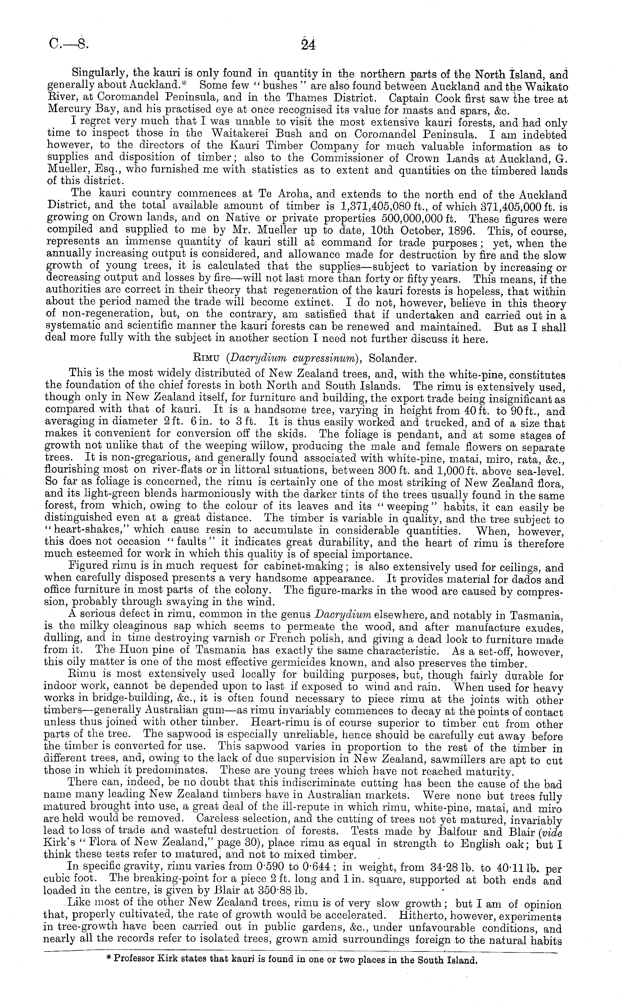 Singularly, the kauri is only found in quantity in the northern parts of the North Island, and generally about Auckland.* Some few " bushes " are also found between Auckland and the Waikato Eiver, at Coromandel Peninsula, and in the Thames District. Captain Cook first saw the tree at Mercury Bay, and his practised eye at once recognised its value for masts and spars, &c. I regret very much that I was unable to visit the most extensive kauri forests, and had only time to inspect those in the Waitakerei Bush and on Coromandel Peninsula. I am indebted however, to the directors of the Kauri Timber Company for much valuable information as to supplies and disposition of timber; also to the Commissioner of Crown Lands at Auckland, G. Mueller, Esq., who furnished me with statistics as to extent and quantities on the timbered lands of this district. The kauri country commences at Te Aroha, and extends to the north end of the Auckland District, and the total available amount of timber is 1,371,405,080 ft., of which 371,405,000 ft. is growing on Crown lands, and on Native or private properties 500,000,000 ft. These figures were compiled and supplied to me by Mr. Mueller up to date, 10th October, 1896. This, of course, represents an immense quantity of kauri still at command for trade purposes ; yet, when the annually increasing output is considered, and allowance made for destruction by fire and the slow growth _of young trees, it is calculated that the supplies—subject to variation by increasing or decreasing output and losses by fire—will not last more than forty or fifty years. This means, if the authorities are correct in their theory that regeneration of the kauri forests is hopeless, that within about the period named the trade will become extinct. I do not, however, believe in this theory of non-regeneration, but, on the contrary, am satisfied that if undertaken and carried out in a systematic and scientific manner the kauri forests can be renewed and maintained. But as I shall deal more fully with the subject in another section I need not further discuss it here. Eimu (Dacrydium cupressinum) , Solander. This is the most widely distributed of New Zealand trees, and, with the white-pine, constitutes the foundation of the chief forests in both North and South Islands. The rimu is extensively used, though only in New Zealand itself, for furniture and building, the export trade being insignificant as compared with that of kauri. It is a handsome tree, varying in height from 40ft. to 90ft., and averaging in diameter 2 ft. 6 in. to 3 ft. It is thus easily'worked and trucked, and of a size that makes it convenient for conversion off the skids. The foliage is pendant, and at some stages of growth not unlike that of the weeping willow, producing the male and female flowers on separate trees. It is non-gregarious, and generally found associated with white-pine, matai, miro, rata, &c, flourishing most on river-flats or in littoral situations, between 300 ft. and 1,000 ft. above sea-level! So far as foliage is concerned, the rimu is certainly one of the most striking of New Zealand flora, and its light-green blends harmoniously with the darker tints of the trees usually found in the same forest, from which, owing to the colour of its leaves and its "weeping" habits, it can easily be distinguished even at a great distance. The timber is variable in quality, and the tree subject to "heart-shakes," which cause resin to accumulate in considerable quantities. When, however, this does not occasion "faults" it indicates great durability, and the heart of rimu is therefore much esteemed for work in which this quality is of special importance. Figured rimu is in much request for cabinet-making; is also extensively used for ceilings, and when carefully disposed presents a very handsome appearance. It provides material for dados and office furniture in most parts of the colony. The figure-marks in the wood are caused by compression, probably through swaying in the wind. A serious defect in rimu, common in the genus Dacrydium elsewhere, and notably in Tasmania, is the milky oleaginous sap which seems to permeate the wood, and after manufacture exudes, dulling, and in time destroying varnish or French polish, and giving a dead look to furniture made from it. The Huon pine of Tasmania has exactly the same characteristic. As a set-off, however, this oily matter is one of the most effective germicides known, and also preserves the timber. Eimu is most extensively used locally for building purposes, but, though fairly durable for indoor work, cannot be depended upon to last if exposed to wind and rain. When used for heavy works in bridge-building, &c, it is often found necessary to piece rimu at the joints with other timbers—generally Australian gum—as rimu invariably commences to decay at the points of contact unless thus joined with other timber. Heart-rimu is of course superior to timber cut from other parts of the tree. The sapwood is especially unreliable, hence should be carefully cut away before the timber is converted for use. This sapwood varies in proportion to the rest of the timber in different trees, and, owing to the lack of due supervision in New Zealand, sawmillers are apt to cut those in which it predominates. These are young trees which have not reached maturity. There can, indeed, be no doubt that this indiscriminate cutting has been the cause of the bad name many leading New Zealand timbers have in Australian markets. Were none but trees fully matured brought into use, a great deal of the ill-repute in which rimu, white-pine, matai, and miro are held would be removed. Careless selection, and the cutting of trees not yet matured, invariably lead to loss of trade and wasteful destruction of forests. Tests made by Balfour and Blair (vide Kirk's " Flora of New Zealand," page 30), place rimu as equal in strength to English oak; but I think these tests refer to matured, and not to mixed timber. In 