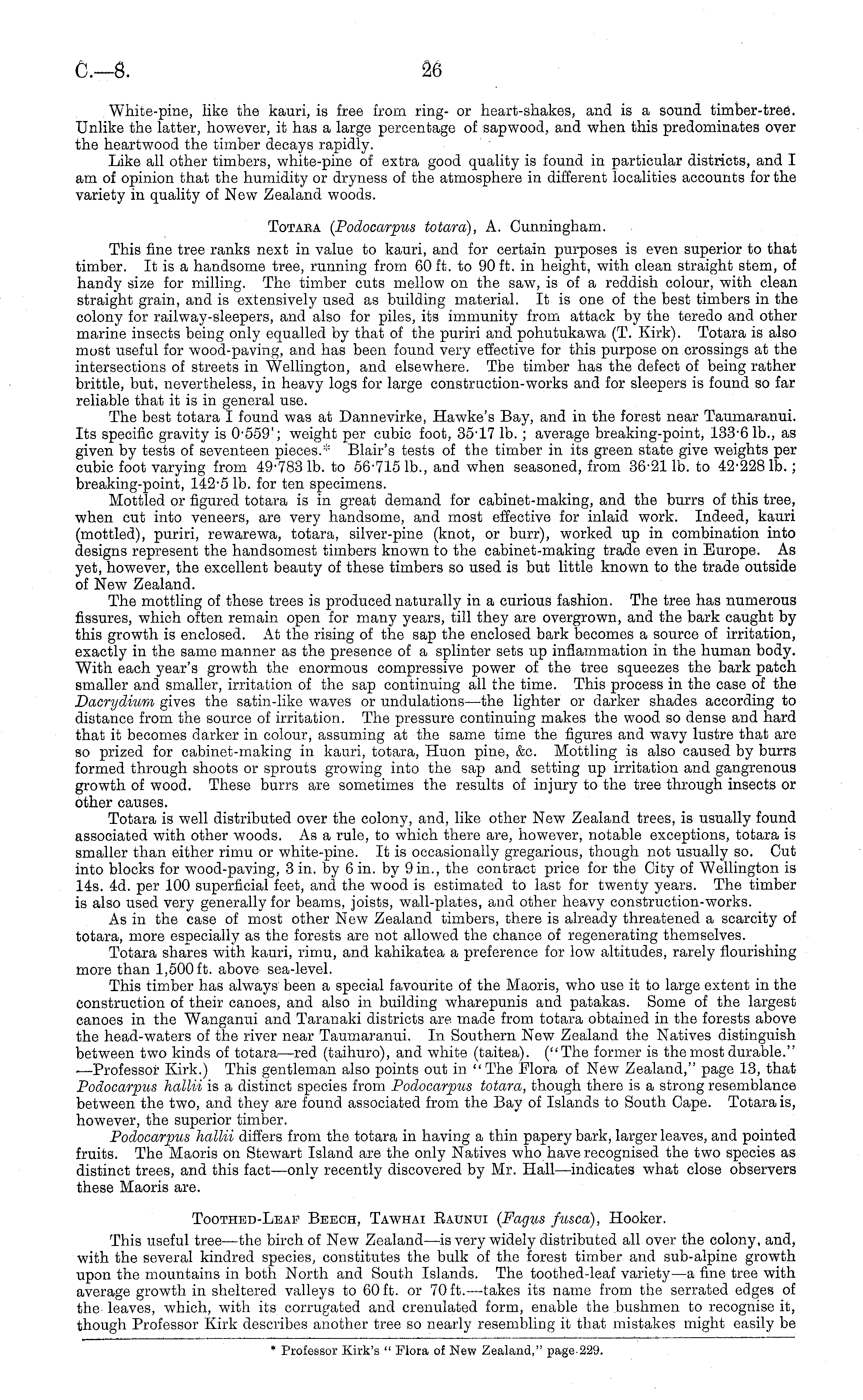 White-pine, like the kauri, is free from ring- or heart-shakes, and is a sound timber-tree. Unlike the latter, however, it has a large percentage of sapwood, and when this predominates over the heartwood the timber decays rapidly. Like all other timbers, white-pine of extra good quality is found in particular districts, and I am of opinion that the humidity or dryness of the atmosphere in different localities accounts for the variety in quality of New Zealand woods. Totaba (Podocarpus totara), A. Cunningham. This fine tree ranks next in value to kauri, and for certain purposes is even superior to that timber. It is a handsome tree, running from 60 ft. to 90 ft. in height, with clean straight stem, of handy size for milling. The timber cuts mellow on the saw, is of a reddish colour, with clean straight grain, and is extensively used as building material. It is one of the best timbers in the colony for railway-sleepers, and also for piles, its immunity from attack by the teredo and other marine insects being only equalled by that of the puriri and pohutukawa (T. Kirk). Totara is also most useful for wood-paving, and has been found very effective for this purpose on crossings at the intersections of streets in Wellington, and elsewhere. The timber has the defect of being rather brittle, but, nevertheless, in heavy logs for large construction-works and for sleepers is found so far reliable that it is in general use. The best totara I found was at Dannevirke, Hawke's Bay, and in the forest near Taumaranui. Its specific gravity is 0-559'; weight per cubic foot, 35-17 lb. ; average breaking-point, 133-6 lb., as given by tests of seventeen pieces.* Blair's tests of the timber in its green state give weights per cubic foot varying from 49-783 lb. to 56-715 lb., and when seasoned, from 36-21 lb. to 42-228 lb.; breaking-point, 142-5 lb. for ten specimens. Mottled or figured totara is in great demand for cabinet-making, and the burrs of this tree, when cut into veneers, are very handsome, and most effective for inlaid work. Indeed, kauri (mottled), puriri, rewarewa, totara, silver-pine (knot, or burr), worked up in combination into designs represent the handsomest timbers known to the cabinet-making trade even in Europe. As yet, however, the excellent beauty of these timbers so used is but little known to the trade outside of New Zealand. The mottling of these trees is produced naturally in a curious fashion. The tree has numerous fissures, which often remain open for many years, till they are overgrown, and the bark caught by this growth is enclosed. At the rising of the sap the enclosed bark becomes a source of irritation, exactly in the same manner as the presence of a splinter sets up inflammation in the human body. With each year's growth the enormous compressive power of the tree squeezes the bark patch smaller and smaller, irritation of the sap continuing all the time. This process in the case of the Dacrydium gives the satin-like waves or undulations —the lighter or darker shades according to distance from the source of irritation. The pressure continuing makes the wood so dense and hard that it becomes darker in colour, assuming at the same time the figures and wavy lustre that are so prized for cabinet-making in kauri, totara, Huon pine, &c. Mottling is also caused by burrs formed through shoots or sprouts growing into the sap and setting up irritation and gangrenous growth of wood. These burrs are sometimes the results of injury to the tree through insects or other causes. Totara is well distributed over the colony, and, like other New Zealand trees, is usually found associated with other woods. As a rule, to which there are, however, notable exceptions, totara is smaller than either rimu or white-pine. It is occasionally gregarious, though not usually so. Cut into blocks for wood-paving, 3 in. by 6 in. by 9 in., the contract price for the City of Wellington is 14s. 4d. per 100 superficial feet, and the wood is estimated to last for twenty years. The timber is also used very generally for beams, joists, wall-plates, and other heavy construction-works. As in the case of most other New Zealand timbers, there is already threatened a scarcity of totara, more especially as the forests are not allowed the chance of regenerating themselves. Totara shares with kauri, rimu, and kahikatea a preference for low altitudes, rarely flourishing more than 1,500 ft. above sea-level. This timber has always been a special favourite of the Maoris, who use it to large extent in the construction of their canoes, and also in building wharepunis and. patakas. Some of the largest canoes in the Wanganui and Taranaki districts are made from totara obtained in the forests above the head-waters of the river near Taumaranui. In Southern New Zealand the Natives distinguish between two kinds of totara —red (taihuro), and white (taitea). ("The former is the most durable." -—Professor Kirk.) This gentleman also points out in "The Flora of New Zealand," page 13, that Podocarpus hallii is a distinct species from Podocarpus totara, though there is a strong resemblance between the two, and they are found associated from the Bay of Islands to South Cape. Totara is, however, the superior timber. Podocarpus hallii differs from the totara in having a thin papery bark, larger leaves, and pointed fruits. The Maoris on Stewart Island are the only Natives who have recognised the two species as distinct trees, and this fact—only recently discovered by Mr. Hall—indicates what close observers these Maoris are. Toothed-Leaf Beech, Tawhai Eaunui (Fagus fusca), Hooker. This useful tree —the birch of New Zealand—is very widely distributed all over the colony, and, with the several kindred species, constitutes the bulk of the forest timber and sub-alpine growth upon the mountains in both North and South Islands. The toothed-leaf variety —a fine tree with average growth in sheltered valleys to 60 ft. or 70 ft.—takes its name 