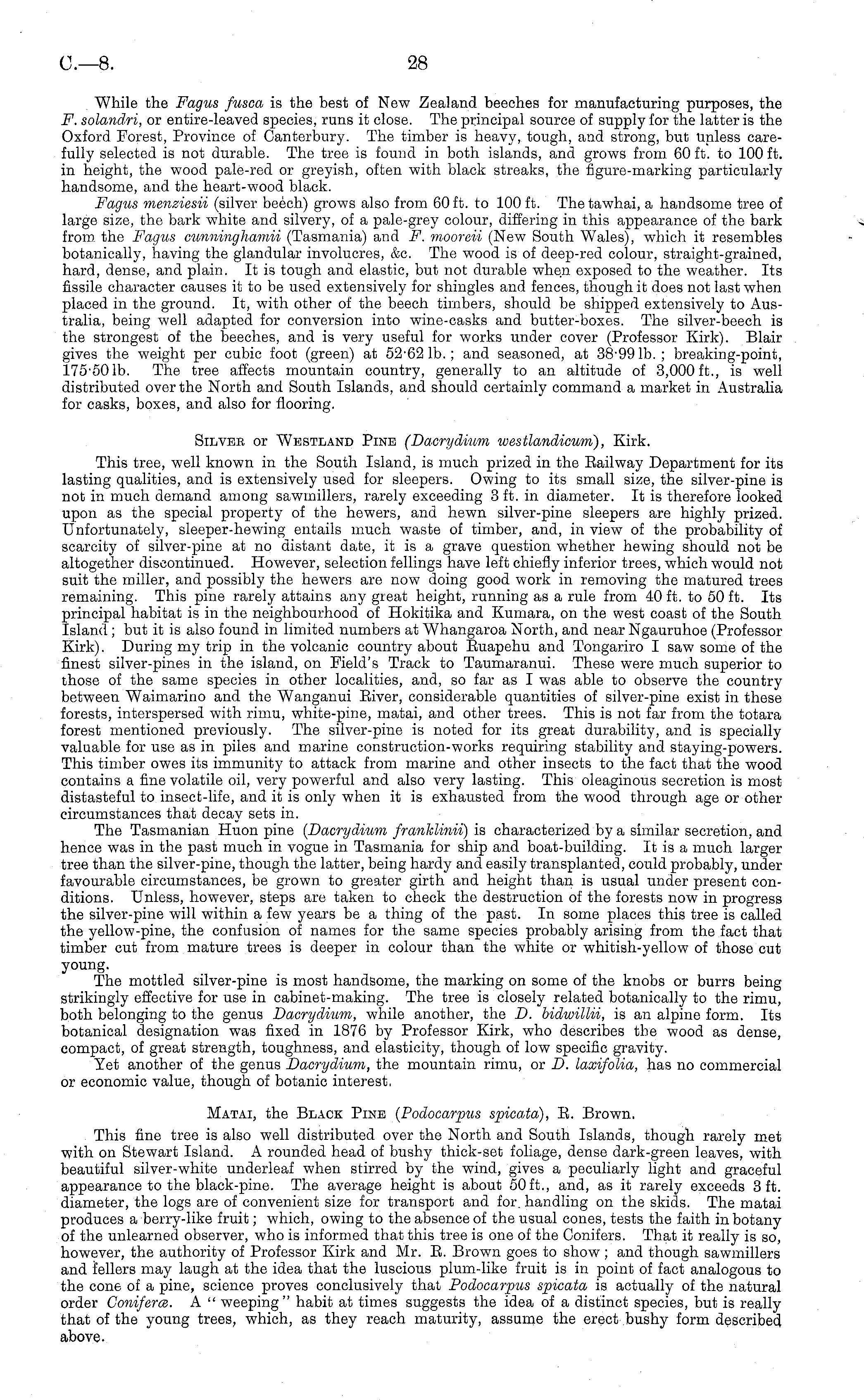 While the Fagus fusca is the best of New Zealand beeches for manufacturing purposes, the F. solandri, or entire-leaved species, runs it close. The principal source of supply for the latter is the Oxford Forest, Province of Canterbury. The timber is heavy, tough, and strong, but unless carefully selected is not durable. The tree is found in both islands, and grows from 60 ft. to 100 ft. in height, the wood pale-red or greyish, often with black streaks, the figure-marking particularly handsome, and the heart-wood black. Fagus menziesii (silver beech) grows also from 60 ft. to 100 ft. Thetawhai, a handsome tree of large size, the bark white and silvery, of a pale-grey colour, differing in this appearance of the bark from the Fagus cunningkamii (Tasmania) and F, mooreii (New South Wales), which it resembles botanically, having the glandular involucres, &c. The wood is of deep-red colour, straight-grained, hard, dense, and plain. It is tough and elastic, but not durable when exposed to the weather. Its fissile character causes it to be used extensively for shingles and fences, though it does not last when placed in the ground. It, with other of the beech timbers, should be shipped extensively to Australia, being well adapted for conversion into wine-casks and butter-boxes. The silver-beech is the strongest of the beeches, and is very useful for works under cover (Professor Kirk). Blair gives the weight per cubic foot (green) at 5262 lb. ; and seasoned, at 38'991b. ; breaking-point, 175-50 lb. The tree affects mountain country, generally to an altitude of 3,000 ft., is well distributed over the North and South Islands, and should certainly command a market in Australia for casks, boxes, and also for flooring. Silver or Westland Pine (Dacrydium westlandicum), Kirk. This tree, well known in the South Island, is much prized in the Railway Department for its lasting qualities, and is extensively used for sleepers. Owing to its small size, the silver-pine is not in much demand among sawmillers, rarely exceeding 3 ft. in diameter. It is therefore looked upon as the special property of the hewers, and hewn silver-pine sleepers are highly prized. Unfortunately, sleeper-hewing entails much waste of timber, and, in view of the probability of scarcity of silver-pine at no distant date, it is a grave question whether hewing should not be altogether discontinued. However, selection fellings have left chiefly inferior trees, which would not suit the miller, and possibly the hewers are now doing good work in removing the matured trees remaining. This pine rarely attains any great height, running as a rule from 40 ft. to 50 ft. Its principal habitat is in the neighbourhood of Hokitika and Kumara, on the west coast of the South Island ; but it is also found in limited numbers at Whangaroa North, and near Ngauruhoe (Professor Kirk). During my trip in the volcanic country about Euapehu and Tongariro I saw some of the finest silver-pines in the island, on Field's Track to Taumaranui. These were much superior to those of the same species in other localities, and, so far as I was able to observe the country between Waimarino and the Wanganui Eiver, considerable quantities of silver-pine exist in these forests, interspersed with rimu, white-pine, matai, and other trees. This is not far from the totara forest mentioned previously. The silver-pine is noted for its great durability, and is specially valuable for use as in piles and marine construction-works requiring stability and staying-powers. This timber owes its immunity to attack from marine and other insects to the fact that the wood contains a fine volatile oil, very powerful and also very lasting. This oleaginous secretion is most distasteful to insect-life, and it is only when it is exhausted from the wood through age or other circumstances that decay sets in. The Tasmanian Huon pine (Dacrydium frankUnii) is characterized by a similar secretion, and hence was in the past much in vogue in Tasmania for ship and boat-building. It is a much larger tree than the silver-pine, though the latter, being hardy and easily transplanted, could probably, under favourable circumstances, be grown to greater girth and height than is usual under present conditions. Unless, however, steps are taken to check the destruction of the forests now in progress the silver-pine will within a few years be a thing of the past. In some places this tree is called the yellow-pine, the confusion of names for the same species probably arising from the fact that timber cut from mature trees is deeper in colour than the white or whitish-yellow of those cut young. The mottled silver-pine is most handsome, the marking on some of the knobs or burrs being strikingly effective for use in cabinet-making. The tree is closely related botanically to the rimu, both belonging to the genus Dacrydium, while another, the D. bidwillii, is an alpine form. Its botanical designation was fixed in 1876 by Professor Kirk, who describes the wood as dense, compact, of great strength, toughness, and elasticity, though of low specific gravity. Yet another of the genus Dacrydium, the mountain rimu, or D. laxifolia, has no commercial or economic value, though of botanic interest, Matai, the Black Pine (Podocarpus spicata), E. Brown. This fine tree is also well distributed over the North and South Islands, though rarely met with on Stewart Island. A rounded head of bushy thick-set foliage, dense dark-green leaves, with beautiful silver-white underleaf when stirred by the wind, gives a peculiarly light and graceful appearance to the black-pine. The average height is about 50 ft., and, as it rarely exceeds 3 ft. diameter, the logs are of convenient size for transport and for. handling on the skids. The matai produces a berry-like fruit; which, owing to the absence of the usual cones, tests the faith in botany of the unlearned observer, who is informed that this tree is one of the Conifers. That it really is so, however, the 