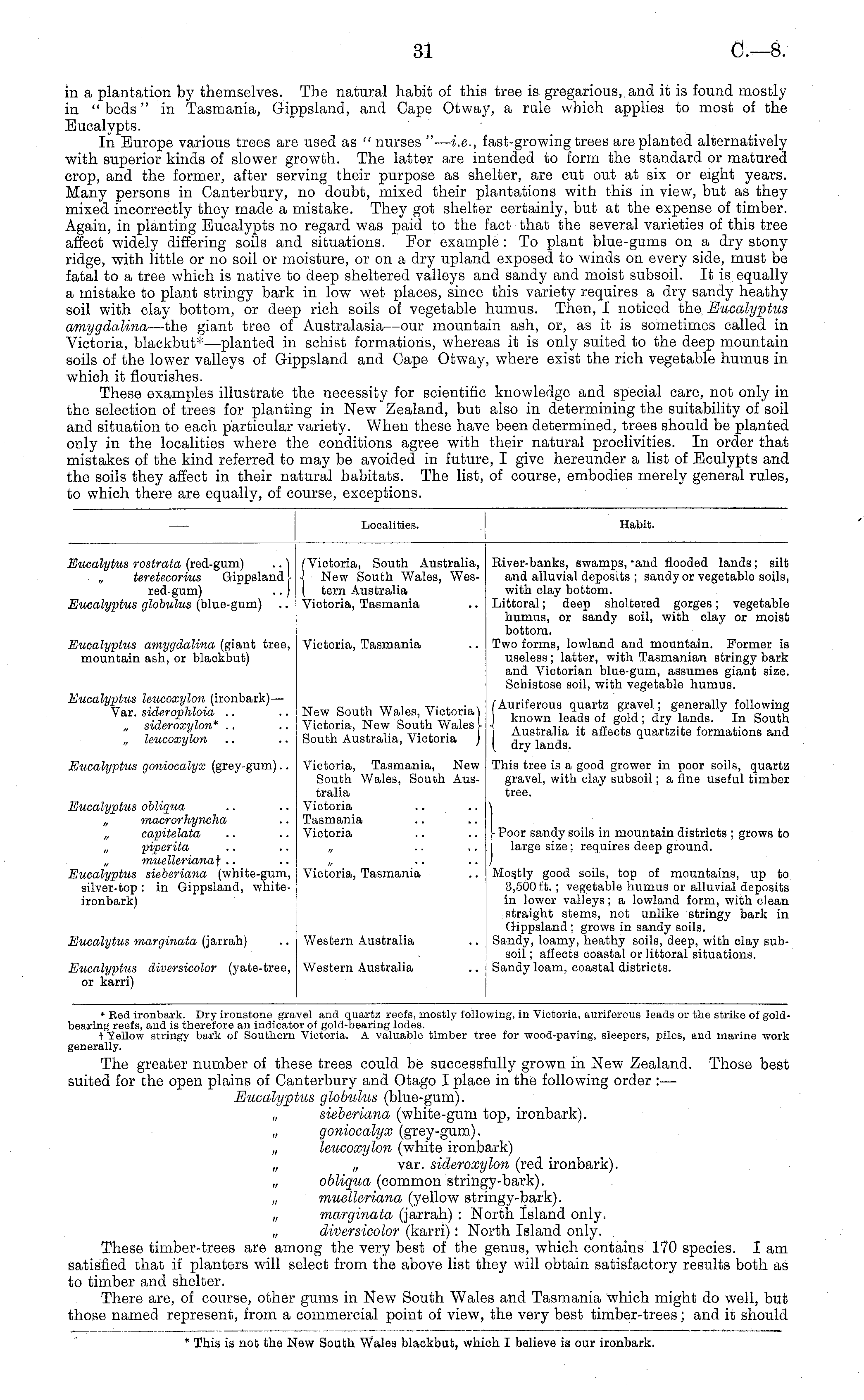 in a plantation by themselves. The natural habit of this tree is gregarious, and it is found mostly in "beds" in Tasmania, Gippsland, and Cape Otway, a rule which applies to most of the Bucalypts. In Europe various trees are used as " nurses " — i.e., fast-growing trees are planted alternatively with superior kinds of slower growth. The latter are intended to form the standard or matured crop, and the former, after serving their purpose as shelter, are cut out at six or eight years. Many persons in Canterbury, no doubt, mixed their plantations with this in view, but as they mixed incorrectly they made a mistake. They got shelter certainly, but at the expense of timber. Again, in planting Eucalypts no regard was paid to the fact that the several varieties of this tree affect widely differing soils and situations. For example :To plant blue-gums on a dry stony ridge, with little or no soil or moisture, or on a dry upland exposed to winds on every side, must be fatal to a tree which is native to deep sheltered valleys and sandy and moist subsoil. It is equally a mistake to plant stringy bark in low wet places, since this variety requires a dry sandy heathy soil with clay bottom, or deep rich soils of vegetable humus. Then, I noticed the Eucalyptus amygdalina —the giant tree of Australasia—our mountain ash, or, as it is sometimes called in Victoria, blackbut*—planted in schist formations, whereas it is only suited to the deep mountain soils of the lower valleys of Gippsland and Cape Ofcway, where exist the rich vegetable humus in which it flourishes. These examples illustrate the necessity for scientific knowledge and special care, not only in the selection of trees for planting in New Zealand, but also in determining the suitability of soil and situation to each particular variety. When these have been determined, trees should be planted only in the localities where the conditions agree with their natural proclivities. In order that mistakes of the kind referred to may be avoided in future, I give hereunder a list of Eculypts and the soils they affect in their natural habitats. The list, of course, embodies merely general rules, to which there are equally, of course, exceptions.