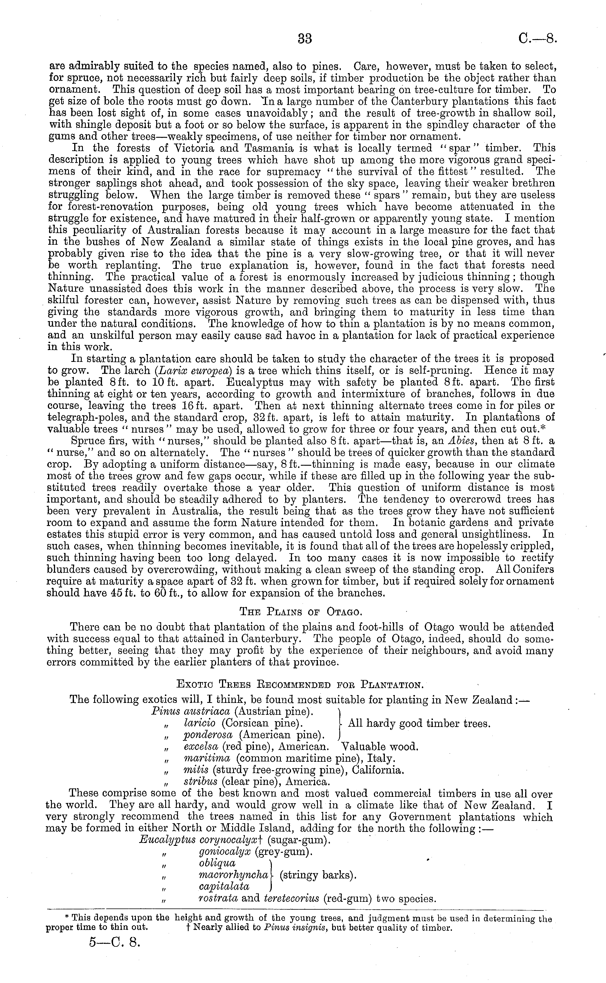 are admirably suited to the species named, also to pines. Care, however, must be taken to select, for spruce, not necessarily rich but fairly deep soils, if timber production be the object rather than ornament. This question of deep soil has a most important bearing on tree-culture for timber. To get size of bole the roots must go down. 'In a large number of the Canterbury plantations this fact has been lost sight of, in some cases unavoidably; and the result of tree-growth in shallow soil, with shingle deposit but a foot or so below the surface, is apparent in the spindley character of the gums and other trees—-weakly specimens, of use neither for timber nor ornament. In the forests of Victoria and Tasmania is what is locally termed "spar" timber. This description is applied to young trees which have shot up among the more vigorous grand specimens of their kind, and in the race for supremacy "the survival of the fittest" resulted. The stronger saplings shot ahead, and took possession of the sky space, leaving their weaker brethren struggling below. When the large timber is removed these " spars " remain, but they are useless for forest-renovation purposes, being old young trees which have become attenuated in the struggle for existence, and have matured in their half-grown or apparently young state. I mention this peculiarity of Australian forests because it may account in a large measure for the fact that in the bushes of New Zealand a similar state of things exists in the local pine groves, and has probably given rise to the idea that the pine is a very slow-growing tree, or that it will never be worth replanting. The true explanation is, however, found in the fact that forests need thinning. The practical value of a forest is enormously increased by judicious thinning ; though Nature unassisted does this work in the manner described above, the process is very slow. The skilful forester can, however, assist Nature by removing such trees as can be dispensed with, thus giving the standards more vigorous growth, and bringing them to maturity in less time than under the natural conditions. The knowledge of how to thin a plantation is by no means common, and an unskilful person may easily cause sad havoc in a plantation for lack of practical experience in this work. In starting a plantation care should be taken to study the character of the trees it is proposed to grow. The larch (Larix europea) is a tree which thins itself, or is self-pruning. Hence it may be planted 8 ft. to 10 ft. apart. Eucalyptus may with safety be planted 8 ft. apart. The first thinning at eight or ten years, according to growth and intermixture of branches, follows in due course, leaving the trees 16 ft. apart. Then at next thinning alternate trees come in for piles or telegraph-poles, and the standard crop, 32 ft. apart, is left to attain maturity. In plantations of valuable trees " nurses" may be used, allowed to grow for three or four years, and then cut out.* Spruce firs, with "nurses," should be planted also Bft. apart—that is, an Abies, then at Bft. a " nurse," and so on alternately. The " nurses " should be trees of quicker growth than the standard crop. By adopting a uniform distance —say, 8 ft. —thinning is made easy, because in our climate most of the trees grow and few gaps occur, while if these are filled up in the following year the substituted trees readily overtake those a year older. This question of uniform distance is most important, and should be steadily adhered to by planters. The tendency to overcrowd trees has been very prevalent in Australia, the result being that as the trees grow they have not sufficient room to expand and assume the form Nature intended for them. In botanic gardens and private estates this stupid error is very common, and has caused untold loss and general unsightliness. In such cases, when thinning becomes inevitable, it is found that all of the trees are hopelessly crippled, such thinning having been too long delayed. In too many cases it is now impossible to rectify blunders caused by overcrowding, without making a clean sweep of the standing crop. All Conifers require at maturity a space apart of 32 ft. when grown for timber, but if required solely for ornament should have 45 ft. to 60 ft., to allow for expansion of the branches. The Plains of Otago. There can be no doubt that plantation of the plains and foot-hills of Otago would be attended with success equal to that attained in Canterbury. The people of Otago, indeed, should do something better, seeing that they may profit by the experience of their neighbours, and avoid many errors committed by the earlier planters of that province. Exotic Tebes Eecommbnded fob Plantation. The following exotics will, I think, be found most suitable for planting in New Zealand :— Pinus austriaca (Austrian pine). \ „ larioio (Corsican pine). I All hardy good timber trees. „ ponderosa (American pine). J „ excelsa (red pine), American. Valuable wood. „ maritima (common maritime pine), Italy. „ mitis (sturdy free-growing pine), California. „ stribus (clear pine), America. These comprise some of the best known and most valued commercial timbers in use all over the world. They are all hardy, and would grow well in a climate like that of New Zealand. I very strongly recommend the trees named in this list for any Government plantations which may be formed in either North or Middle Island, adding for the north the following :— Eucalyptus corynocalyx\ (sugar-gum). „ goniocalyx (grey-gum). „ obliqua \ „ maororhyncha I (stringy barks). „ capitalata ) „ rostmta and teretecorius (red-gum) two species.
