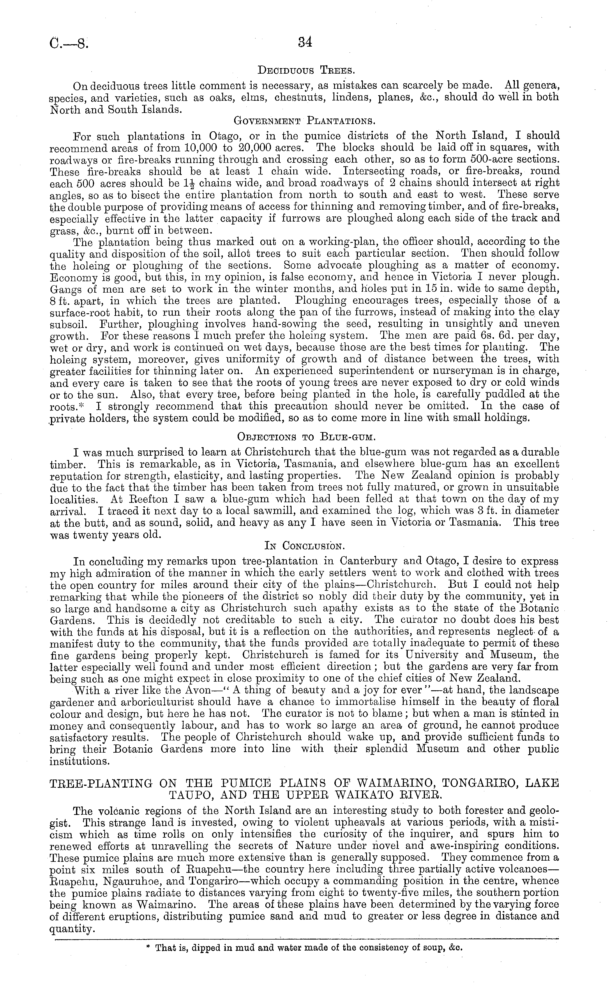 On deciduous trees little comment is necessary, as mistakes can scarcely be made. All genera, species, and varieties, such as oaks, elms, chestnuts, lindens, planes, &c, should do well in both North and South Islands. GoVEBNMENT PLANTATIONS. For such plantations in Otago, or in the pumice districts of the North Island, I should recommend areas of from 10,000 to 20,000 acres. The blocks should be laid off in squares, with roadways or fire-breaks running through and crossing each other, so as to form 500-acre sections. These fire-breaks should be at least 1 chain wide. Intersecting roads, or fire-breaks, round each 500 acres should be 1-| chains wide, and broad roadways of 2 chains should intersect at right angles, so as to bisect the entire plantation from north to south and east to west. These serve the double purpose of providing means of access for thinning and removing timber, and of fire-breaks, especially effective in the latter capacity if furrows are ploughed along each side of the track and grass, &c, burnt off in between. The plantation being thus marked out on a working-plan, the officer should, according to the quality and disposition of the soil, allot trees to suit each particular section. Then should follow the holeing or ploughing of the sections. Some advocate ploughing as a matter of economy. Economy is good, but this, in my opinion, is false economy, and hence in Victoria I never plough. Gangs of men are set to work in the winter months, and holes put in 15 in. wide to same depth, 8 ft. apart, in which the trees are planted. Ploughing encourages trees, especially those of a surface-root habit, to run their roots along the pan of the furrows, instead of making into the clay subsoil. Further, ploughing involves hand-sowing the seed, resulting in unsightly and uneven growth. For these reasons I much prefer the holeing system. The men are paid 6s. 6d. per day, wet or dry, and work is continued on wet days, because those are the best times for planting. The holeing system, moreover, gives uniformity of growth and of distance between the trees, with greater facilities for thinning later on. An experienced superintendent or nurseryman is in charge, and every care is taken to see that the roots of young trees are never exposed to dry or cold winds or to the sun. Also, that every tree, before being planted in the hole, is carefully puddled at the roots.* I strongly recommend that this precaution should never be omitted. In the case of private holders, the system could be modified, so as to come more in line with small holdings. Objections to Blue-gum. I was much surprised to learn at Christchurch that the blue-gum was not regarded as a durable timber. This is remarkable, as in Victoria, Tasmania, and elsewhere blue-gum has an excellent reputation for strength, elasticity, and lasting properties. The New Zealand opinion is probably due to the fact that the timber has been taken from trees not fully matured, or grown in unsuitable localities. At Eeefton I saw a blue-gum which had been felled at that town on the day of my arrival. I traced it next day to a local sawmill, and examined the log, which was 3 ft. in diameter at the butt, and as sound, solid, and heavy as any I have seen in Victoria or Tasmania. This tree was twenty years old. In Conclusion. In concluding my remarks upon tree-plantation in Canterbury and Otago, I desire to express my high admiration of the manner in which the early settlers went to work and clothed with trees the open country for miles around their city of the plains —Christchurch. But I could not help remarking that while the pioneers of the district so nobly did their duty by the community, yet in so large and handsome a city as Christchurch such apathy exists as to the state of the Botanic Gardens. This is decidedly not creditable to such a city. The curator no doubt does his best with the funds at his disposal, but it is a reflection on the authorities, and represents neglect of a manifest duty to the community, that the funds provided are totally inadequate to permit of these fine gardens being properly kept. Christchurch is famed for its University and Museum, the latter especially well found and under most efficient direction ; but the gardens are very far from being such as one might expect in close proximity to one of the chief cities of New Zealand. With a river like the Avon—" A thing of beauty and a joy for ever " —at hand, the landscape gardener and arboriculturist should have a chance to immortalise himself in the beauty of floral colour and design, but here he has not. The curator is not to blame; but when a man is stinted in money and consequently labour, and has to work so large an area of ground, he cannot produce satisfactory results. The people of Christchurch should wake up, and provide sufficient funds to bring their Botanic Gardens more into line with their splendid Museum and other public institutions. TEEE-PLANTING ON THE PUMICE PLAINS OF WAIMAEINO, TONGAEIEO, LAKE TAUPO, AND THE UPPEE WAIKATO EIVEE. The volcanic regions of the North Island are an interesting study to both forester and geologist. This strange land is invested, owing to violent upheavals at various periods, with a misticism which as time rolls on only intensifies the curiosity of the inquirer, and spurs him to renewed efforts at unravelling the secrets of Nature under novel and awe-inspiring conditions. These pumice plains are much more extensive than is generally supposed. They commence from a point six miles south of Euapehu —the country here including three partially active volcanoes— Bnapehu, Ngauruhoe, and Tongariro —which occupy a commanding position in the centre, whence the pumice plains radiate to distances varying from eight to twenty-five miles, the southern portion being known as Waimarino. The areas of these plains have been determined by the varying force of different eruptions, distributing pumice sand and mud to greater or less degree i