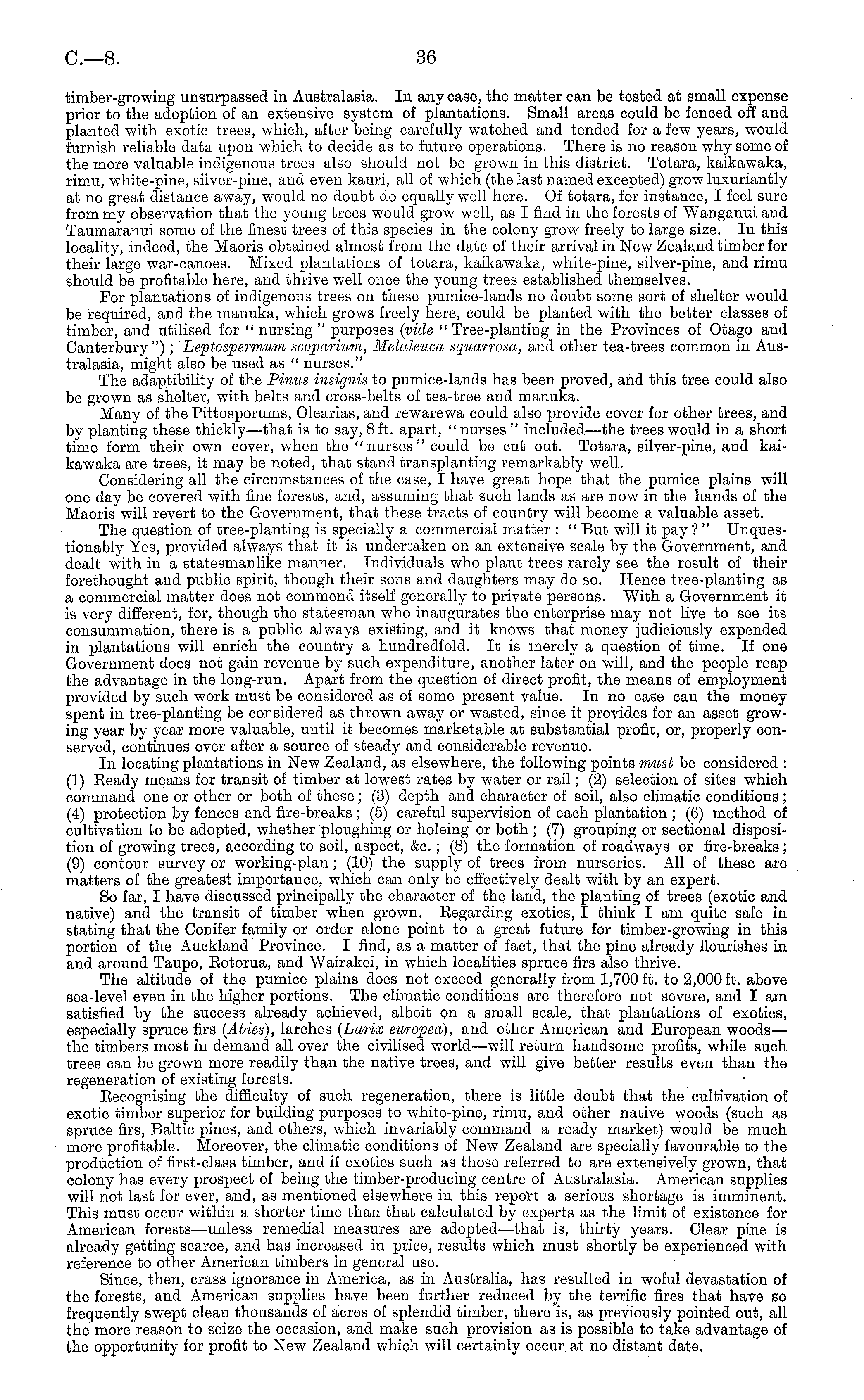 timber-growing unsurpassed in Australasia. In any ease, the matter can be tested at small expense prior to the adoption of an extensive system of plantations. Small areas could be fenced oft and planted with exotic trees, which, after being carefully watched and tended for a few years, would furnish reliable data upon which to decide as to future operations. There is no reason why some of the more valuable indigenous trees also should not be grown in this district. Totara, kaikawaka, rimu, white-pine, silver-pine, and even kauri, all of which (the last named excepted) grow luxuriantly at no great distance away, would no doubt do equally well here. Of totara, for instance, I feel sure from my observation that the young trees would grow well, as I find in the forests of Wanganui and Taumaranui some of the finest trees of this species in the colony grow freely to large size. In this locality, indeed, the Maoris obtained almost from the date of their arrival in New Zealand timber for their large war-canoes. Mixed plantations of totara, kaikawaka, white-pine, silver-pine, and rimu should be profitable here, and thrive well once the young trees established themselves. For plantations of indigenous trees on these pumice-lands no doubt some sort of shelter would be required, and the manuka, which grows freely here, could be planted with the better classes of timber, and utilised for "nursing" purposes (vide "Tree-planting in the Provinces of Otago and Canterbury "); Leptospermum scoparium, Melaleuca squarrosa, and other tea-trees common in Australasia, might also be used as " nurses." The adaptibility of the Pinus insignis to pumice-lands has been proved, and this tree could also be grown as shelter, with belts and cross-belts of tea-tree and manuka. Many of the Pittosporums, Olearias, and rewarewa could also provide cover for other trees, and by planting these thickly—that is to say, 8 ft. apart, " nurses " included—the trees would in a short time form their own cover, when the " nurses " could be cut out. Totara, silver-pine, and kaikawaka are trees, it may be noted, that stand transplanting remarkably well. Considering all the circumstances of the case, I have great hope that the pumice plains will one day be covered with fine forests, and, assuming that such lands as are now in the hands of the Maoris will revert to the Government, that these tracts of country will become a valuable asset. The question of tree-planting is specially a commercial matter : " But will it pay ? " Unquestionably Yes, provided always that it is undertaken on an extensive scale by the Government, and dealt with in a statesmanlike manner. Individuals who plant trees rarely see the result of their forethought and public spirit, though their sons and daughters may do so. Hence tree-planting as a commercial matter does not commend itself generally to private persons. With a Government it is very different, for, though the statesman who inaugurates the enterprise may not live to see its consummation, there is a public always existing, and it knows that money judiciously expended in plantations will enrich the country a hundredfold. It is merely a question of time. If one Government does not gain revenue by such expenditure, another later on will, and the people reap the advantage in the long-run. Apart from the question of direct profit, the means of employment provided by such work must be considered as of some present value. In no case can the money spent in tree-planting be considered as thrown away or wasted, since it provides for an asset growing year by year more valuable, until it becomes marketable at substantial profit, or, properly conserved, continues ever after a source of steady and considerable revenue. In locating plantations in New Zealand, as elsewhere, the following points must be considered : (1) Ready means for transit of timber at lowest rates by water or rail; (2) selection of sites which command one or other or both of these; (3) depth and character of soil, also climatic conditions; (4) protection by fences and fire-breaks ; (5) careful supervision of each plantation ; (6) method of cultivation to be adopted, whether ploughing or holeing or both ; (7) grouping or sectional disposition of growing trees, according to soil, aspect, &c.; (8) the formation of roadways or fire-breaks; (9) contour survey or working-plan; (10) the supply of trees from nurseries. All of these are matters of the greatest importance, which can only be effectively dealt with by an expert. So far, I have discussed principally the character of the land, the planting of trees (exotic and native) and the transit of timber when grown. Regarding exotics, I think I am quite safe in stating that the Conifer family or order alone point to a great future for timber-growing in this portion of the Auckland Province. I find, as a matter of fact, that the pine already flourishes in and around Taupo, Rotorua, and Wairakei, in which localities spruce firs also thrive. The altitude of the pumice plains does not exceed generally from 1,700 ft. to 2,000 ft. above sea-level even in the higher portions. The climatic conditions are therefore not severe, and I am satisfied by the success already achieved, albeit on a small scale, that plantations of exotics, especially spruce firs (Abies), larches (Larix europea), and other American and European woods— the timbers most in demand all over the civilised world—will return handsome profits, while such trees can be grown more readily than the native trees, and will give better results even than the regeneration of existing forests. Recognising the difficulty of such regeneration, there is little doubt that the cultivation of exotic timber superior for building purposes to white-pine, rimu, and other native woods (such as spruce firs, Baltic pines, and others, which invariably command a ready market) would be much more profitable. Moreover, the climatic conditions of New Zealand are specially fav