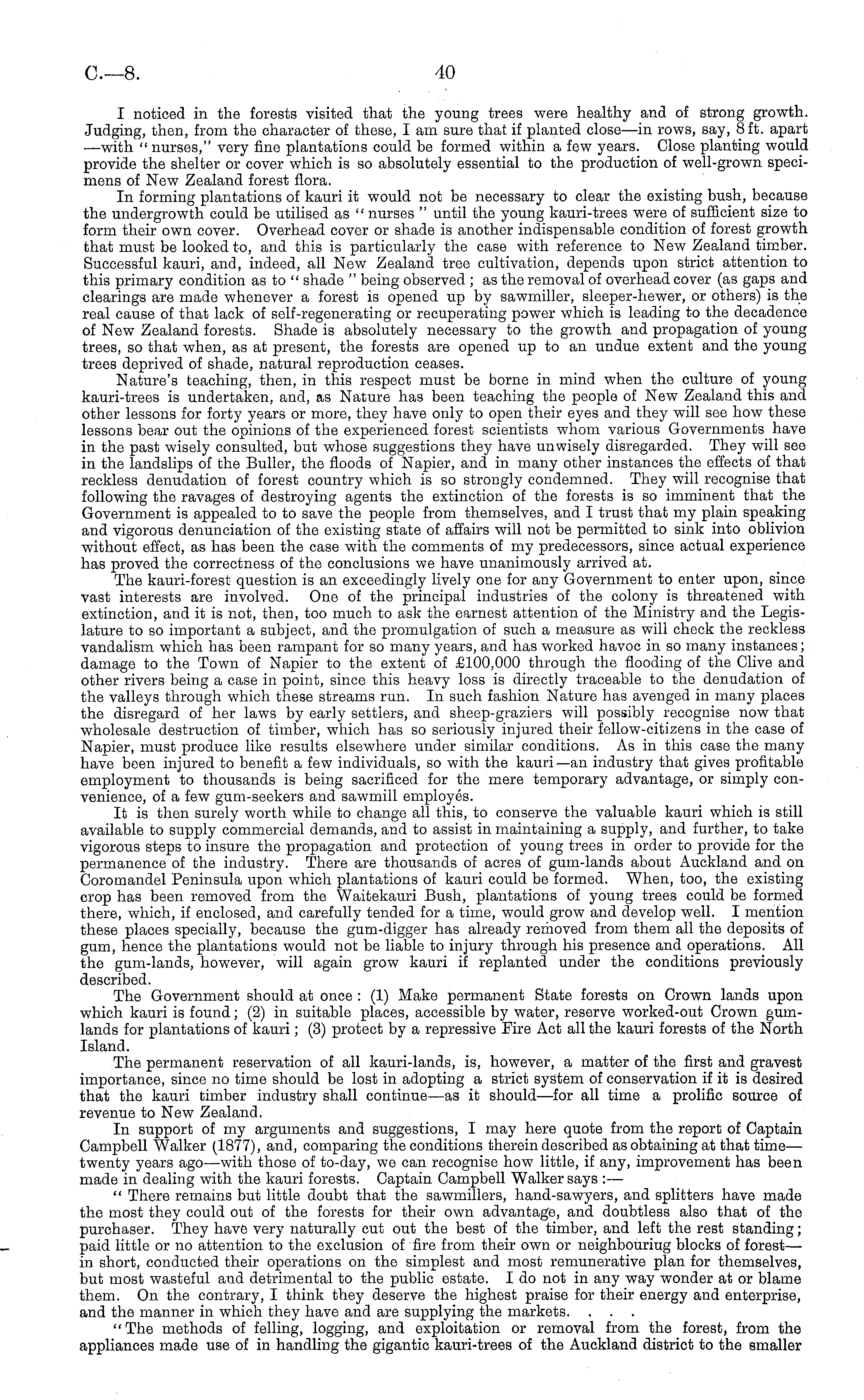 I noticed in the forests visited that the young trees were healthy and of strong growth. Judging, then, from the character of these, I am sure that if planted close—in rows, say, 8 ft. apart —with " nurses," very fine plantations could be formed within a few years. Close planting would provide the shelter or cover which is so absolutely essential to the production of well-grown specimens of New Zealand forest flora. In forming plantations of kauri it would not be necessary to clear the existing bush, because the undergrowth could be utilised as " nurses " until the young kauri-trees were of sufficient size to form their own cover. Overhead cover or shade is another indispensable condition of forest growth that must be looked to, and this is particularly the case with reference to New Zealand timber. Successful kauri, and, indeed, all New Zealand tree cultivation, depends upon strict attention to this primary condition as to " shade " being observed ; as the removal of overhead cover (as gaps and clearings are made whenever a forest is opened up by sawmiller, sleeper-hewer, or others) is the real cause of that lack of self-regenerating or recuperating power which is leading to the decadence of New Zealand forests. Shade is absolutely necessary to the growth and propagation of young trees, so that when, as at present, the forests are opened up to an undue extent and the young trees deprived of shade, natural reproduction ceases. Nature's teaching, then, in this respect must be borne in mind when the culture of young kauri-trees is undertaken, and, as Nature has been teaching the people of New Zealand this and other lessons for forty years or more, they have only to open their eyes and they will see how these lessons bear out the opinions of the experienced forest scientists whom various Governments have in the past wisely consulted, but whose suggestions they have unwisely disregarded. They will see in the landslips of the Buller, the floods of Napier, and in many other instances the effects of that reckless denudation of forest country which is so strongly condemned. They will recognise that following the ravages of destroying agents the extinction of the forests is so imminent that the Government is appealed to to save the people from themselves, and I trust that my plain speaking and vigorous denunciation of the existing state of affairs will not be permitted to sink into oblivion without effect, as has been the case with the comments of my predecessors, since actual experience has proved the correctness of the conclusions we have unanimously arrived at. The kauri-forest question is an exceedingly lively one for any Government to enter upon, since vast interests are involved. One of the principal industries of the colony is threatened with extinction, and it is not, then, too much to ask the earnest attention of the Ministry and the Legislature to so important a subject, and the promulgation of such a measure as will check the reckless vandalism which has been rampant for so many years, and has worked havoc in so many instances; damage to the Town of Napier to the extent of £100,000 through the flooding of the Clive and other rivers being a case in point, since this heavy loss is directly traceable to the denudation of the valleys through which these streams run. In such fashion Nature has avenged in many places the disregard of her laws by early settlers, and sheep-graziers will possibly recognise now that wholesale destruction of timber, which has so seriously injured their fellow-citizens in the case of Napier, must produce like results elsewhere under similar conditions. As in this case the many have been injured to benefit a few individuals, so with the kauri—an industry that gives profitable employment to thousands is being sacrificed for the mere temporary advantage, or simply convenience, of a few gum-seekers and sawmill employes. It is then surely worth while to change all this, to conserve the valuable kauri which is still available to supply commercial demands, and to assist in maintaining a supply, and further, to take vigorous steps to insure the propagation and protection of young trees in order to provide for the permanence of the industry. There are thousands of acres of gum-lands about Auckland and on Coromandel Peninsula upon which plantations of kauri could be formed. When, too, the existing crop has been removed from the Waitekauri Bush, plantations of young trees could be formed there, which, if enclosed, and carefully tended for a time, would grow and develop well. I mention these places specially, because the gum-digger has already removed from them all the deposits of gum, hence the plantations would not be liable to injury through his presence and operations. All the gum-lands, however, will again grow kauri if replanted under the conditions previously described. The Government should at once : (1) Make permanent State forests on Crown lands upon which kauri is found; (2) in suitable places, accessible by water, reserve worked-out Crown gumlands for plantations of kauri; (3) protect by a repressive Fire Act all the kauri forests of the North Island. The permanent reservation of all kauri-lands, is, however, a matter of the first and gravest importance, since no time should be lost in adopting a strict system of conservation if it is desired that the kauri timber industry shall continue—as it should—for all time a prolific source of revenue to New Zealand. In support of my arguments and suggestions, I may here quote from the report of Captain Campbell Walker (1877), and, comparing the conditions therein described as obtaining at that time— twenty years ago —with those of to-day, we can recognise how little, if any, improvement has been made in dealing with the kauri forests. Captain Campbell Walker says : — " There remains but little doubt that the sawmillers, hand-sawyers, and splitters have made the most they could out of the forests for their 