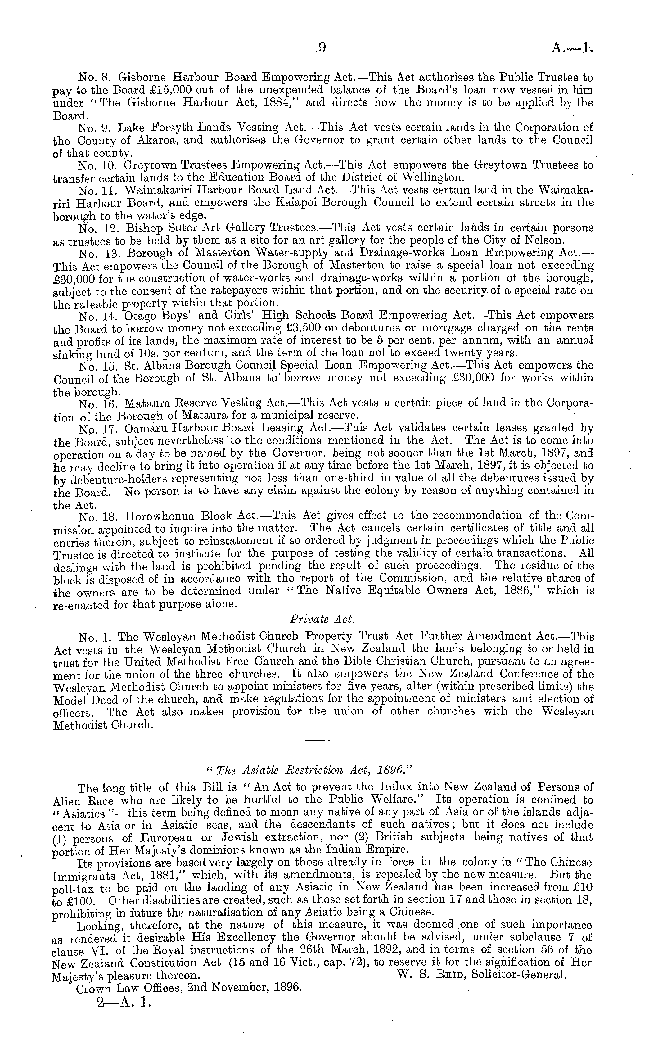 " The Asiatic Restriction Act, 1896." The long title of this Bill is " An Act to prevent the Influx into New Zealand of Persons of Alien Eace who are likely to be hurtful to the Public Welfare." Its operation is confined to " Asiatics " —this term being defined to mean any native of any part of Asia, or of the islands adjacent to Asia or in Asiatic seas, and the descendants of such natives; but it does not include (1) persons of European or Jewish extraction, nor (2) British subjects being natives of that portion of Her Majesty's dominions known as the Indian Empire. Its provisions are based very largely on those already in force in the colony in " The Chinese Immigrants Act, 1881," which, with its amendments, is repealed by the new measure. But the poll-tax to be paid on the landing of any Asiatic in New Zealand has been increased from £10 to £100. Other disabilities are created, such as those set forth in section 17 and those in section 18, prohibiting in future the naturalisation of any Asiatic being a Chinese. Looking, therefore, at the nature of this measure, it was deemed one of such importance as rendered it desirable His Excellency the Governor should be advised, under subclause 7 of clause VI. of the Eoyal instructions of the 26th March, 1892, and in terms of section 56 of the New Zealand Constitution Act (15 and 16 Vict., cap. 72), to reserve it for the signification of Her Majesty's pleasure thereon. W. S. Eeid, Solicitor-General. Crown Law Offices, 2nd November, 1896. 2—A. 1.
