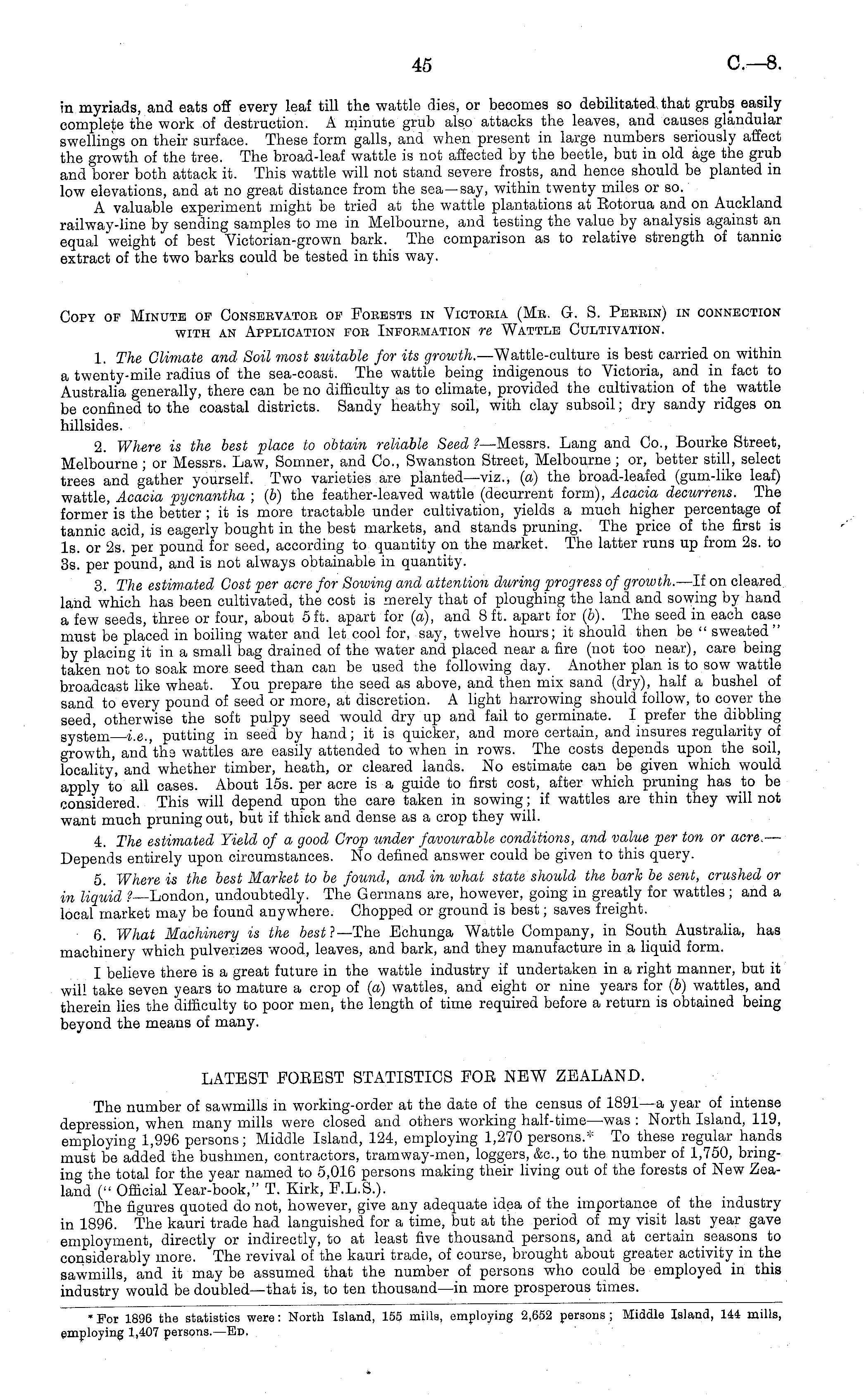in myriads, and eats off every leaf till the wattle dies, or becomes so debilitated that grubs easily complete the work of destruction. A minute grub also attacks the leaves, and causes glandular swellings on their surface. These form galls, and when present in large numbers seriously affect the growth of the tree. The broad-leaf wattle is not affected by the beetle, but in old age the grub and borer both attack it. This wattle will not stand severe frosts, and hence should be planted in low elevations, and at no great distance from the sea—say, within twenty miles or so. A valuable experiment might be tried at the wattle plantations at Eotorua and on Auckland railway-line by sending samples to me in Melbourne, and testing the value by analysis against an equal weight of best Victorian-grown bark. The comparison as to relative strength of tannic extract of the two barks could be tested in this way. Copy of Minute of Conseevator of Forests in Victoeia (Mb. G. S. Pebein) in connection with an Application foe Information re Wattle Cultivation. 1. The Climate and Soil most suitable for its growth. —Wattle-culture is best carried on within a twenty-mile radius of the sea-coast. The wattle being indigenous to Victoria, and in fact to Australia generally, there can be no difficulty as to climate, provided the cultivation of the wattle be confined to the coastal districts. Sandy heathy soil, with clay subsoil; dry sandy ridges on hillsides. 2. Where is the best place to obtain reliable Seed? —Messrs. Lang and Co., Bourke Street, Melbourne ; or Messrs. Law, Somner, and Co., Swanston Street, Melbourne ; or, better still, select trees and gather yourself. Two varieties are planted —viz., (a) the broad-leafed (gum-like leaf) wattle, Acacia pycnantha ; (b) the feather-leaved wattle (decurrent form), Acacia decurrens. The former is the better ; it is more tractable under cultivation, yields a much higher percentage of tannic acid, is eagerly bought in the best markets, and stands pruning. The price of the first is Is. or 2s. per pound for seed, according to quantity on the market. The latter runs up from 2s. to 3s. per pound, and is not always obtainable in quantity. 3. The estimated Cost per acre for Sowing and attention during progress of growth. —If on cleared land which has been cultivated, the cost is merely that of ploughing the land and sowing by hand a few seeds, three or four, about sft. apart for (a), and 8 ft. apart for (b). The seed in each case must be placed in boiling water and let cool for, say, twelve hours; it should then be " sweated " by placing it in a small bag drained of the water and placed near a fire (not too near), care being taken not to soak more seed than can be used the following day. Another plan is to sow wattle broadcast like wheat. You prepare the seed as above, and then mix sand (dry), half a bushel of sand to every pound of seed or more, at discretion. A light harrowing should follow, to cover the seed, otherwise the soft pulpy seed would dry up and fail to germinate. I prefer the dibbling system i.e., putting in seed by hand; it is quicker, and more certain, and insures regularity of growth, and'ths wattles are easily attended to when in rows. The costs depends upon the soil, locality, and whether timber, heath, or cleared lands. No estimate can be given which would apply to all cases. About 15s. per acre is a guide to first cost, after which pruning has to be considered. This will depend upon the care taken in sowing; if wattles are thin they will not want much pruning out, but if thick and dense as a crop they will. i. The estimated Yield of a good Crop under favourable conditions, and value per ton or acre, — Depends entirely upon circumstances. No defined answer could be given to this query. 5. Where is the best Market to be found, and in what state should the bark be sent, crushed or in liquid 1-- London, undoubtedly. The Germans are, however, going in greatly for wattles ; and a local market may be found anywhere. Chopped or ground is best; saves freight. 6. What Machinery is the best? —The Echunga Wattle Company, in South Australia, has machinery which pulverizes wood, leaves, and bark, and they manufacture in a liquid form. I believe there is a great future in the wattle industry if undertaken in a right manner, but it will take seven years to mature a crop of (a) wattles, and eight or nine years for (b) wattles, and therein lies the difficulty to poor men, the length of time required before a return is obtained being beyond the means of many. LATEST EOBEST STATISTICS FOE NEW ZEALAND. The number of sawmills in working-order at the date of the census of 1891 —a year of intense depression, when many mills were closed and others working half-time —was : North Island, 119, employing' 1,996 persons; Middle Island, 124, employing 1,270 persons.* To these regular hands must be added the bushmen, contractors, tramway-men, loggers, &c, to the number of 1,750, bringing the total for the year named to 5,016 persons making their living out of the forests of New Zealand (" Official Year-book," T. Kirk, F.L.S.). The figures quoted do not, however, give any adequate idea of the importance of the industry in 1896. The kauri trade had languished for a time, but at the period of my visit last year gave employment, directly or indirectly, to at least five thousand persons, and at certain seasons to considerably more. The revival of the kauri trade, of course, brought about greater activity in the sawmills, and it may be assumed that the number of persons who could be employed in this industry would be doubled —that is, to ten thousand —in more prosperous times.