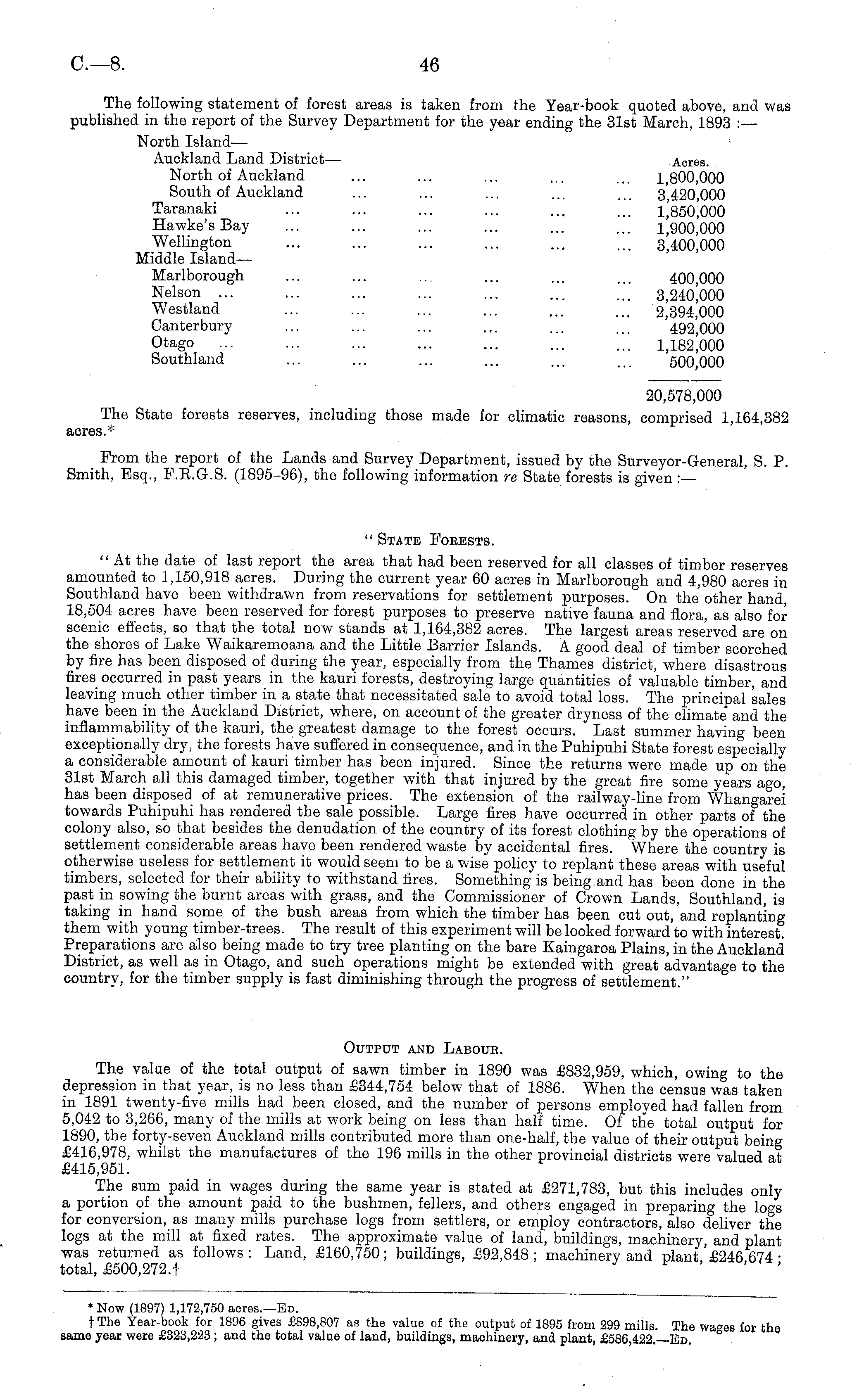 The following statement of forest areas is taken from the Year-book quoted above, and was published in the report of the Survey Department for the year ending the 31st March, 1893 :— North Island— Auckland Land District— Acres. North of Auckland ... ... ... ... ... 1,800,000 South of Auckland ... ... ... ... ... 3,420,000 Taranaki ... ... ... ... ... ... l,'85o!oOO Hawke'sßay ... ... ... ... ... ... 1,900,000 Wellington ... ... ... ... ... ... 3,400,000 Middle Island— Marlborough ... ... ... ... ... ... 400,000 Nelson ... ... ... ... ... .., ... 3,240,000 Westland ... ... ... ... ... ... 2,394,000 Canterbury ... ... ... ... ... ... 492,000 Otago ... ... ... ... ... ... ... 1,182,000 Southland ... ... ... ... ... ... 500,000 20,578,000 The State forests reserves, including those made for climatic reasons, comprised 1,164,382 acres.* Prom the report of the Lands and Survey Department, issued by the Surveyor-General, S. P. Smith, Esq., F.B.G.S. (1895-96), the following information re State forests is given :— " State Forests. " At the date of last report the area that had been reserved for all classes of timber reserves amounted to 1,150,918 acres. During the current year 60 acres in Marlborough and 4,980 acres in Southland have been withdrawn from reservations for settlement purposes. On the other hand, 18,504 acres have been reserved for forest purposes to preserve native fauna and flora, as also for scenic effects, so that the total now stands at 1,164,382 acres. The largest areas reserved are on the shores of Lake Waikaremoana and the Little Barrier Islands. A good deal of timber scorched by fire has been disposed of during the year, especially from the Thames district, where disastrous fires occurred in past years in the kauri forests, destroying large quantities of valuable timber, and leaving much other timber in a state that necessitated sale to avoid total loss. The principal sales have been in the Auckland District, where, on account of the greater dryness of the climate and the inflammability of the kauri, the greatest damage to the forest occurs. Last summer having been exceptionally dry, the forests have suffered in consequence, and in the Puhipuhi State forest especially a considerable amount of kauri timber has been injured. Since the returns were made up on the 31st March all this damaged timber, together with that injured by the great fire some years ago, has been disposed of at remunerative prices. The extension of the railway-line from Whangarei towards Puhipuhi has rendered the sale possible. Large fires have occurred in other parts of the colony also, so that besides the denudation of the country of its forest clothing by the operations of settlement considerable areas have been rendered waste by accidental fires. Where the country is otherwise useless for settlement it would seem to be a wise policy to replant these areas with useful timbers, selected for their ability to withstand fires. Something is being.and has been done in the past in sowing the burnt areas with grass, and the Commissioner of Crown Lands, Southland, is taking in hand some of the bush areas from which the timber has been cut out, and replanting them with young timber-trees. The result of this experiment will be looked forward to with interest. Preparations are also being made to try tree planting on the bare Kaingaroa Plains, in the Auckland District, as well as in Otago, and such operations might be extended with great advantage to the country, for the timber supply is fast diminishing through the progress of settlement." Output and Labour. The value of the total output of sawn timber in 1890 was £832,959, which, owing to the depression in that year, is no less than £344,754 below that of 1886. When the census was taken in 1891 twenty-five mills had been closed, and the number of persons employed had fallen from 5,042 to 3,266, many of the mills at work being on less than half time. Of the total output for 1890, the forty-seven Auckland mills contributed more than one-half, the value of their output being £416,978, whilst the manufactures of the 196 mills in the other provincial districts were valued at £415,951. The sum paid in wages during the same year is stated at £271,783, but this includes only a portion of the amount paid to the bushmen, fellers, and others engaged in preparing the for conversion, as many mills purchase logs from settlers, or employ contractors, also deliver the logs at the mill at fixed rates. The approximate value of land, buildings, machinery, and plant was returned as follows: Land, £160,750; buildings, £92,848; machinery and plant '£246 674 • total, £500,272.t '