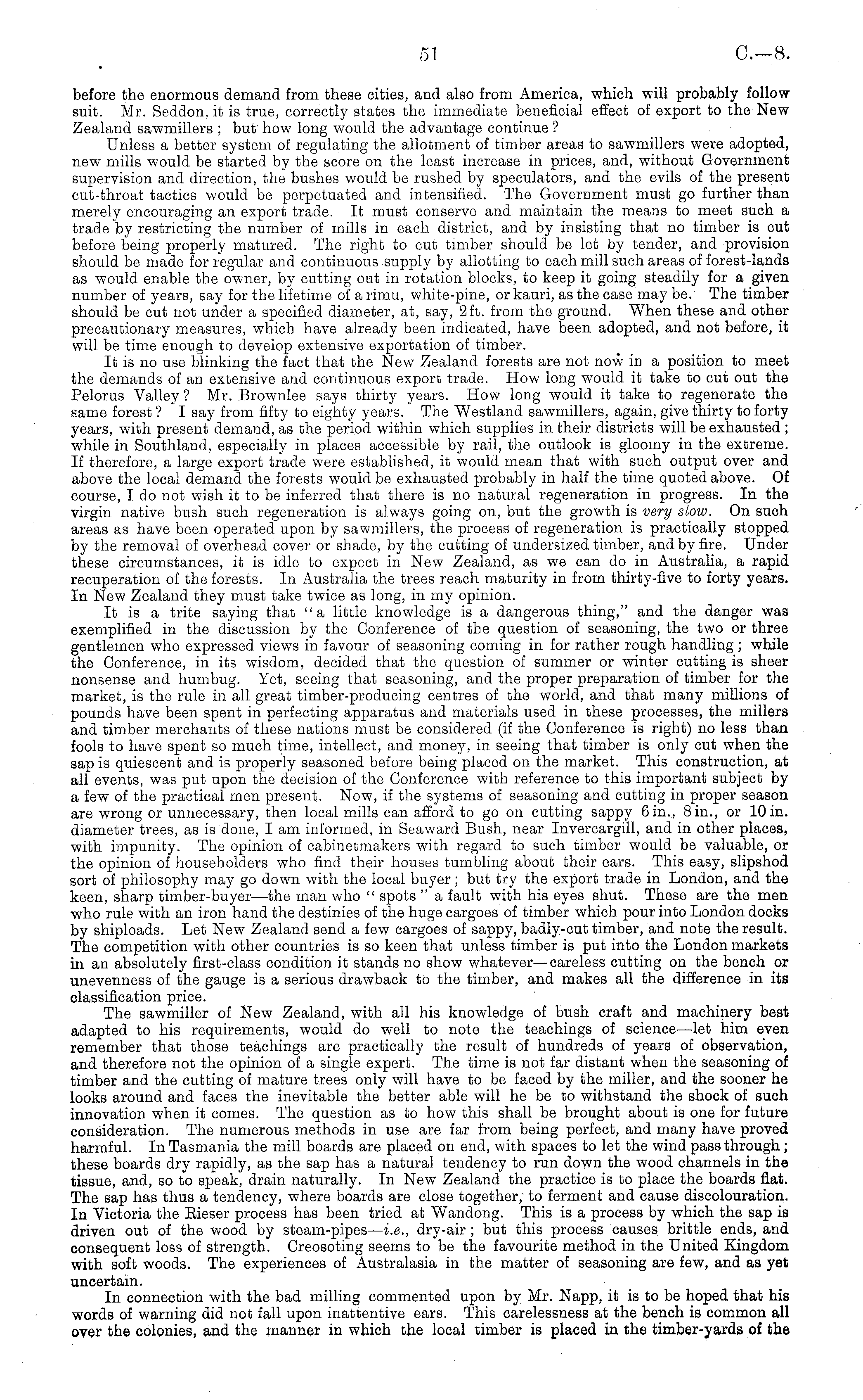 before the enormous demand from these cities, and also from America, which will probably follow suit. Mr. Seddon, it is true, correctly states the immediate beneficial effect of export to the New Zealand sawmillers ; but how long would the advantage continue ? Unless a better system of regulating the allotment of timber areas to sawmillers were adopted, new mills would be started by the score on the least increase in prices, and, without Government supervision and direction, the bushes would be rushed by speculators, and the evils of the present cut-throat tactics would be perpetuated and intensified. The Government must go further than merely encouraging an export trade. It must conserve and maintain the means to meet such a trade by restricting the number of mills in each district, and by insisting that no timber is cut before being properly matured. The right to cut timber should be let by tender, and provision should be made for regular and continuous supply by allotting to each mill such areas of forest-lands as would enable the owner, by cutting out in rotation blocks, to keep it going steadily for a given number of years, say for the lifetime of a rimu, white-pine, or kauri, as the case may be. The timber should be cut not under a specified diameter, at, say, 2ft. from the ground. When these and other precautionary measures, which have already been indicated, have been adopted, and not before, it will be time enough to develop extensive exportation of timber. It is no use blinking the fact that the New Zealand forests are not now in a position to meet the demands of an extensive and continuous export trade. How long would it take to cut out the Pelorus Valley ? Mr. Brownlee says thirty years. How long would it take to regenerate the same forest ? I say from fifty to eighty years. The Westland sawmillers, again, give thirty to forty years, with present demand, as the period within which supplies in their districts will be exhausted ; while in Southland, especially in places accessible by rail, the outlook is gloomy in the extreme. If therefore, a large export trade were established, it would mean that with such output over and above the local demand the forests would be exhausted probably in half the time quoted above. Of course, Ido not wish it to be inferred that there is no natural regeneration in progress. In the virgin native bush such regeneration is always going on, but the growth is very sioiu. On such areas as have been operated upon by sawmillers, the process of regeneration is practically stopped by the removal of overhead cover or shade, by the cutting of undersized timber, and by fire. Under these circumstances, it is idle to expect in New Zealand, as we can do in Australia, a rapid recuperation of the forests. In Australia the trees reach maturity in from thirty-five to forty years. In New Zealand they must take twice as long, in my opinion. It is a trite saying that "a little knowledge is a dangerous thing," and the danger was exemplified in the discussion by the Conference of the question of seasoning, the two or three gentlemen who expressed views in favour of seasoning coming in for rather rough handling ; while the Conference, in its wisdom, decided that the question of summer or winter cutting is sheer nonsense and humbug. Yet, seeing that seasoning, and the proper preparation of timber for the market, is the rule in all great timber-producing centres of the world, and that many millions of pounds have been spent in perfecting apparatus and materials used in these processes, the millers and timber merchants of these nations must be considered (if the Conference is right) no less than fools to have spent so much time, intellect, and money, in seeing that timber is only cut when the sap is quiescent and is properly seasoned before being placed on the market. This construction, at all events, was put upon the decision of the Conference with reference to this important subject by a few of the practical men present. Now, if the systems of seasoning and cutting in proper season are wrong or unnecessary, then local mills can afford to go on cutting sappy 6 in., 8 in., or 10 in. diameter trees, as is done, I am informed, in Seaward Bush, near Invercargill, and in other places, with impunity. The opinion of cabinetmakers with regard to such timber would be valuable, or the opinion of householders who find their houses tumbling about their ears. This easy, slipshod sort of philosophy may go down with the local buyer; but try the export trade in London, and the keen, sharp timber-buyer —the man who " spots " a fault with his eyes shut. These are the men who rule with an iron hand the destinies of the huge cargoes of timber which pour into London docks by shiploads. Let New Zealand send a few cargoes of sappy, badly-cut timber, and note the result. The competition with other countries is so keen that unless timber is put into the London markets in an absolutely first-class condition it stands no show whatever —careless cutting on the bench or unevenness of the gauge is a serious drawback to the timber, and makes all the difference in its classification price. The sawmiller of New Zealand, with all his knowledge of bush craft and machinery best adapted to his requirements, would do well to note the teachings of science—let him even remember that those teachings are practically the result of hundreds of years of observation, and therefore not the opinion of a single expert. The time is not far distant when the seasoning of timber and the cutting of mature trees only will have to be faced by the miller, and the sooner he looks around and faces the inevitable the better able will he be to withstand the shock of such innovation when it comes. The question as to how this shall be brought about is one for future consideration. The numerous methods in use are far from being perfect, and many have proved harmful. In Tasmania the mill boards are placed on end, with spaces to le